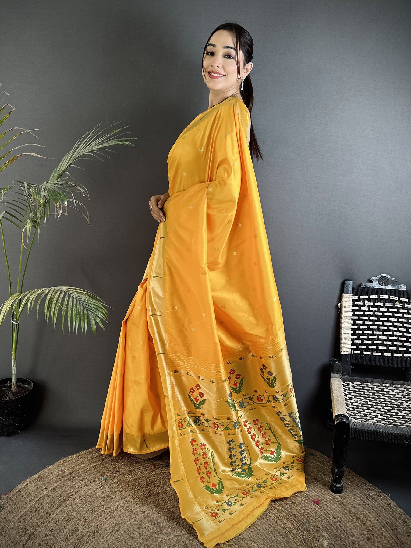 Yellow Lichi Silk Floral Ikkat Motifs Zari weaving Paithani Saree