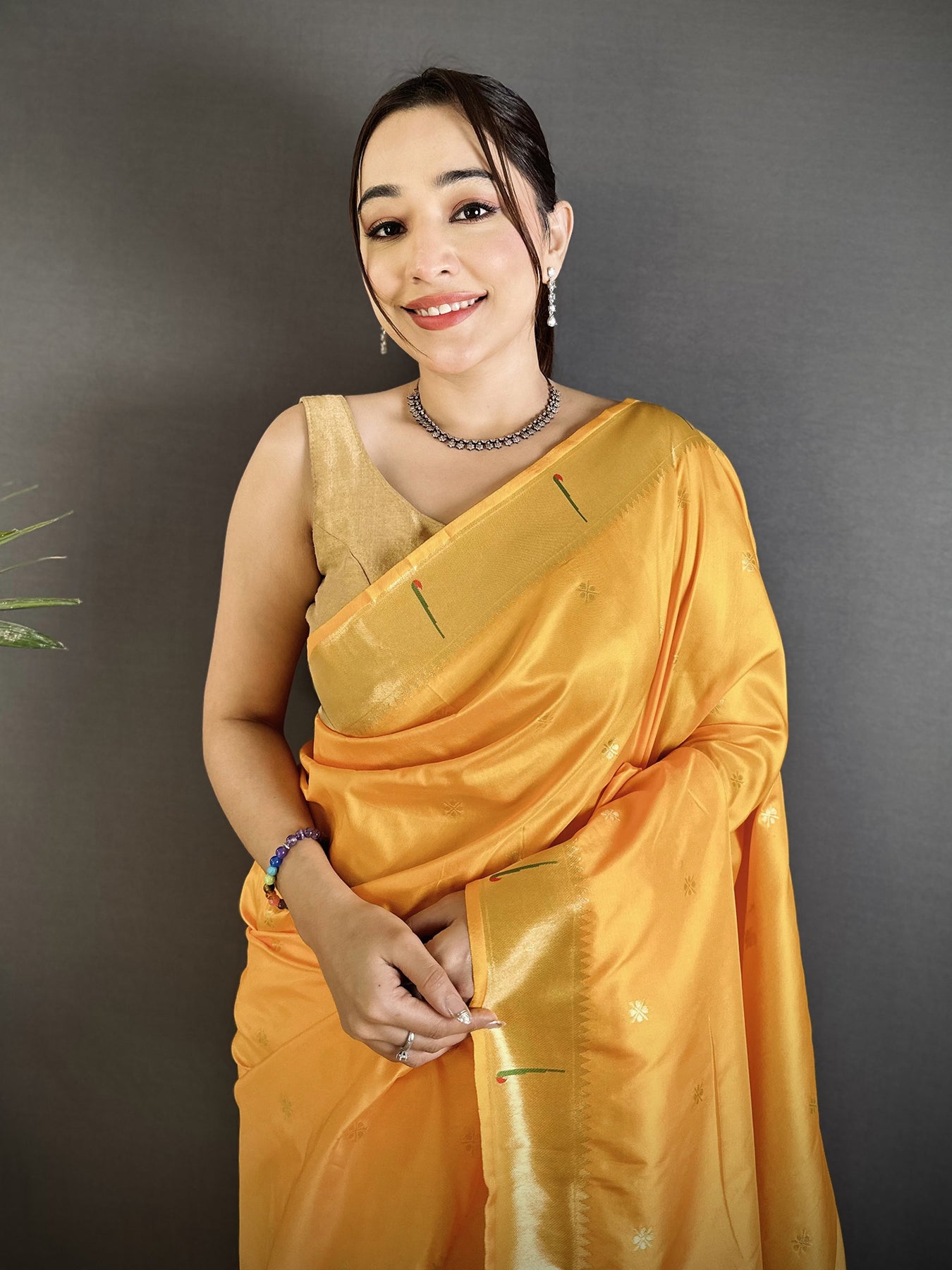 Brighten your wardrobe with this Yellow Lichi Silk Paithani Saree, featuring elegant Ikkat motifs and intricate floral zari weaving, perfect for weddings, festive events, and traditional celebrations.