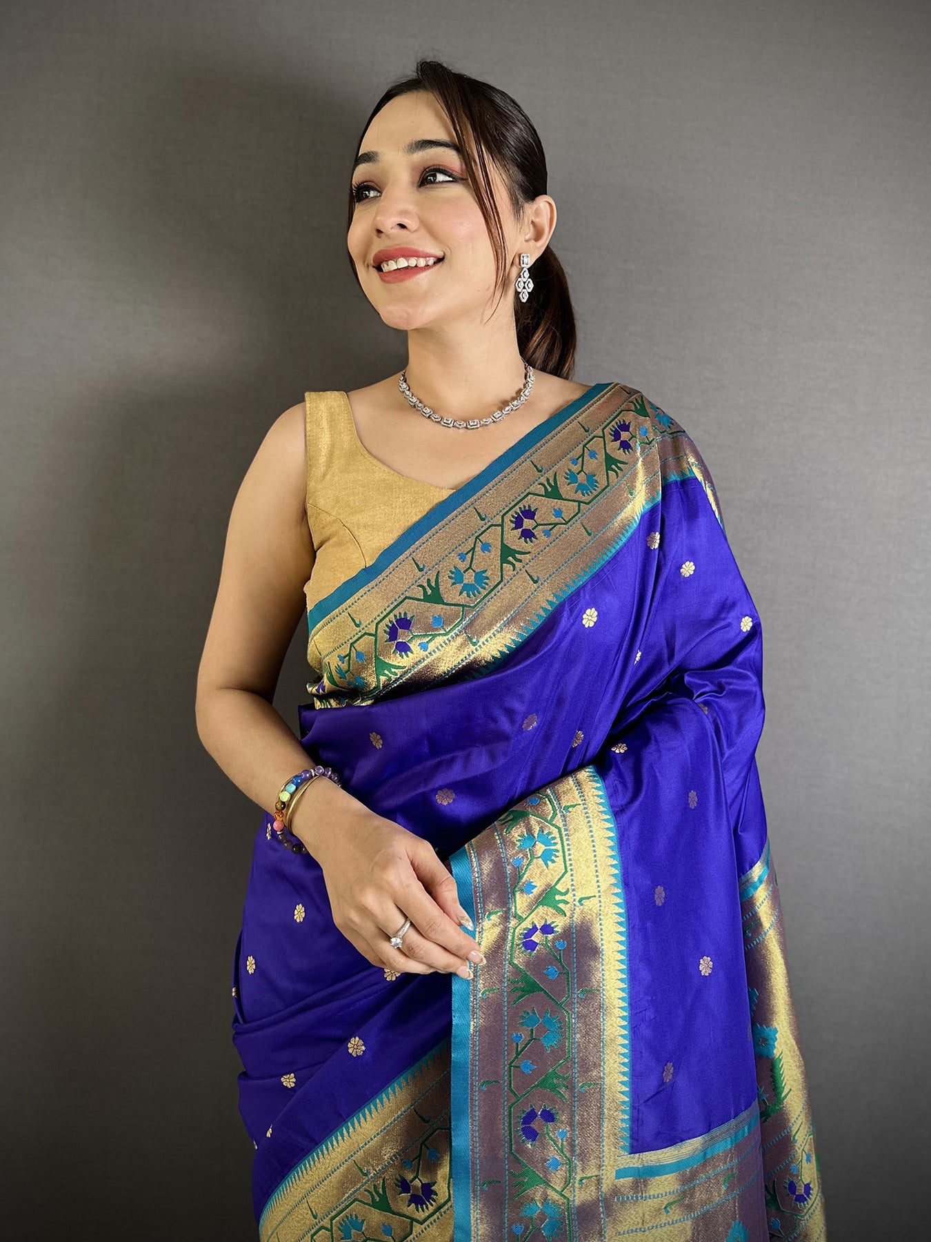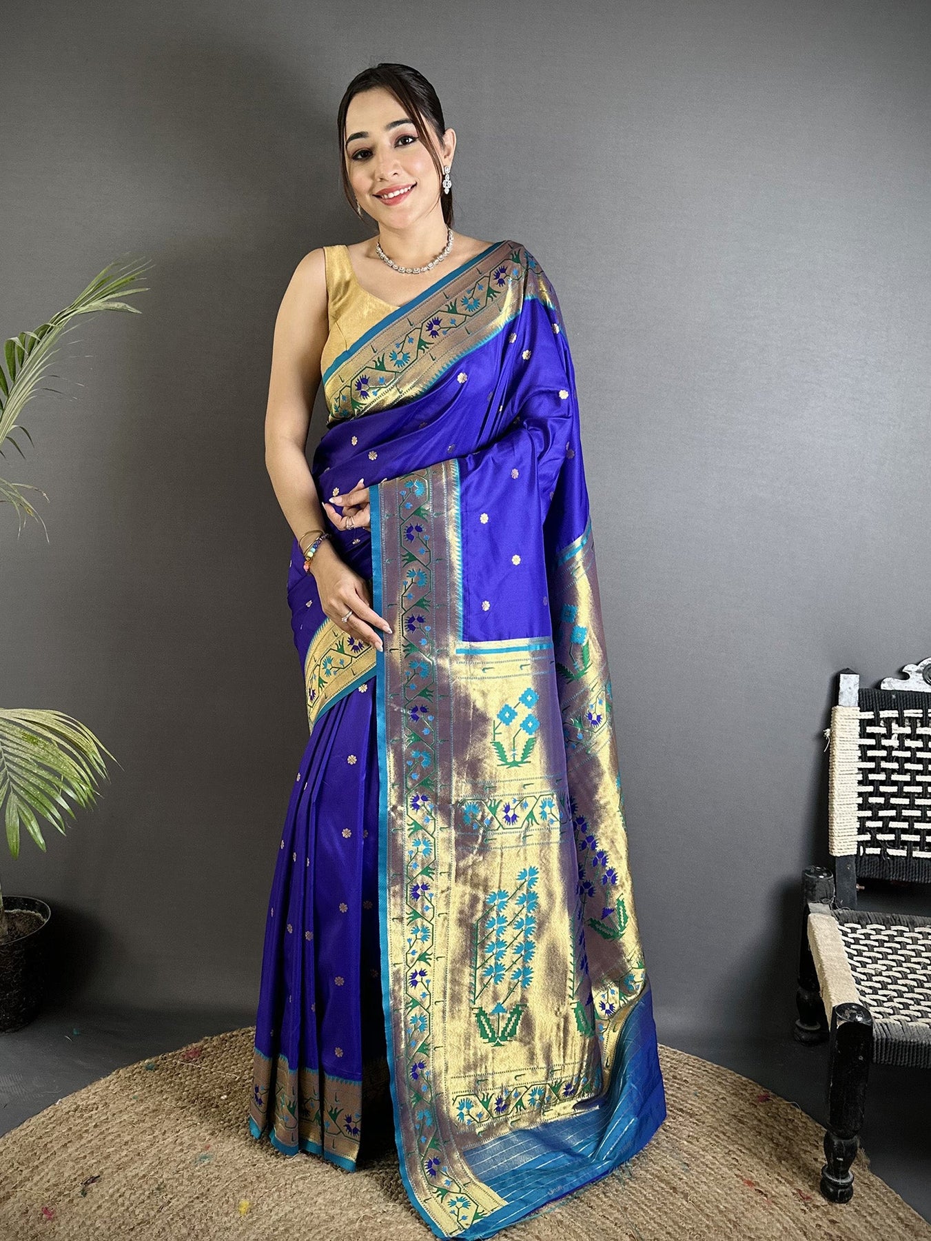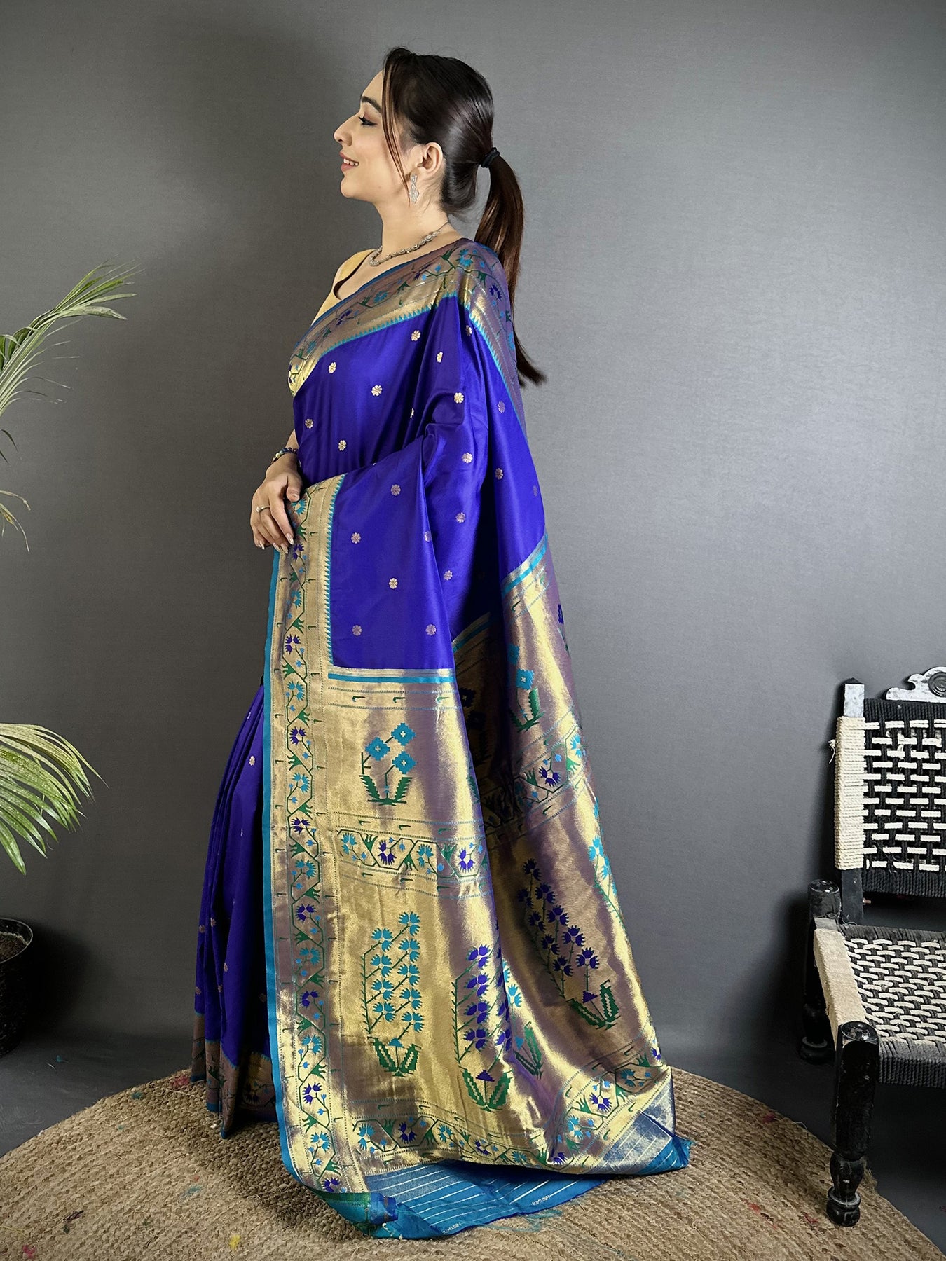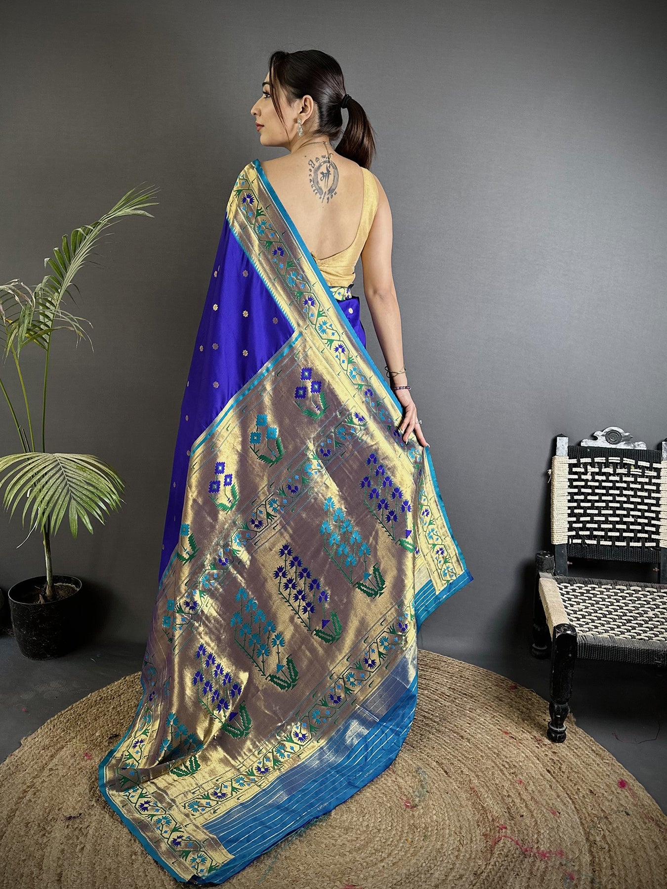 Blue Lichi Silk Ikkat Floral Motifs Zari Woven Paithani Saree