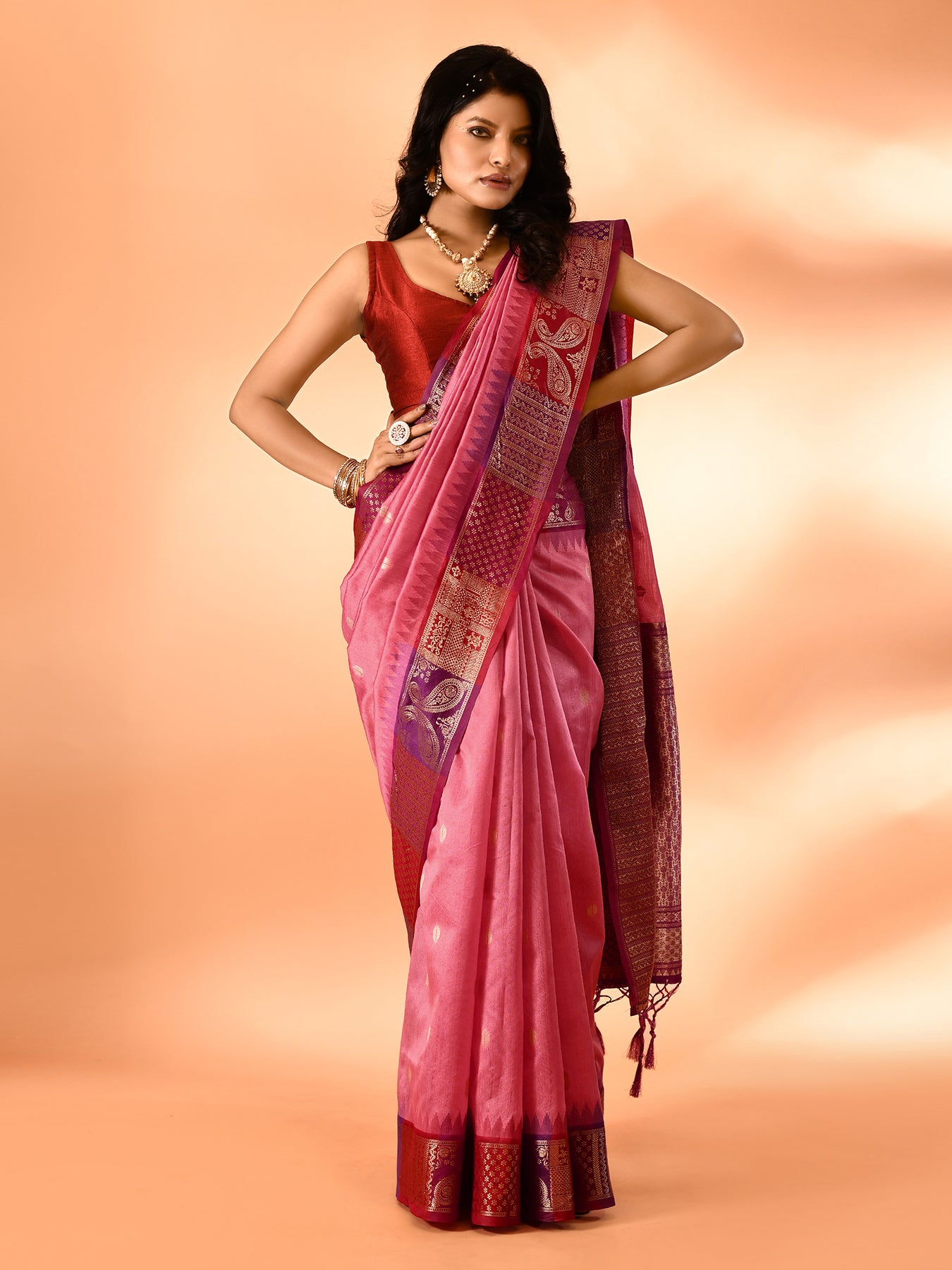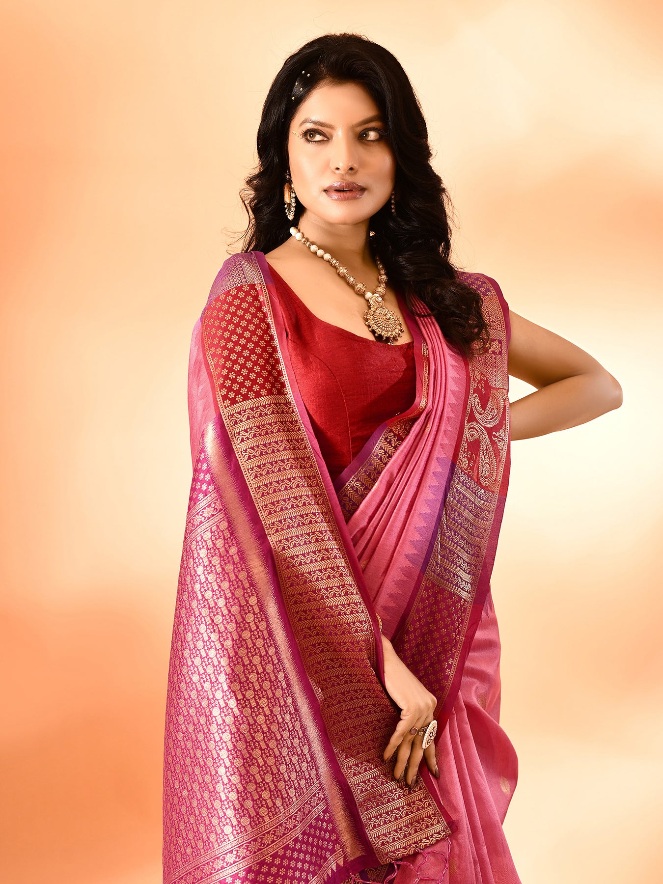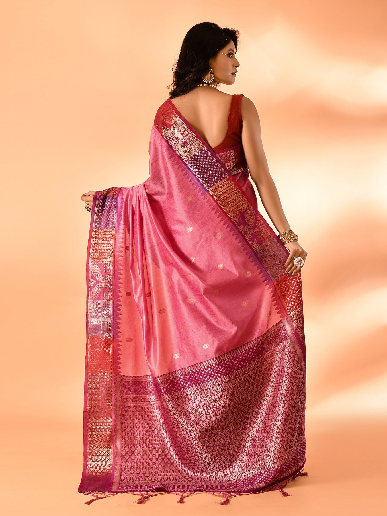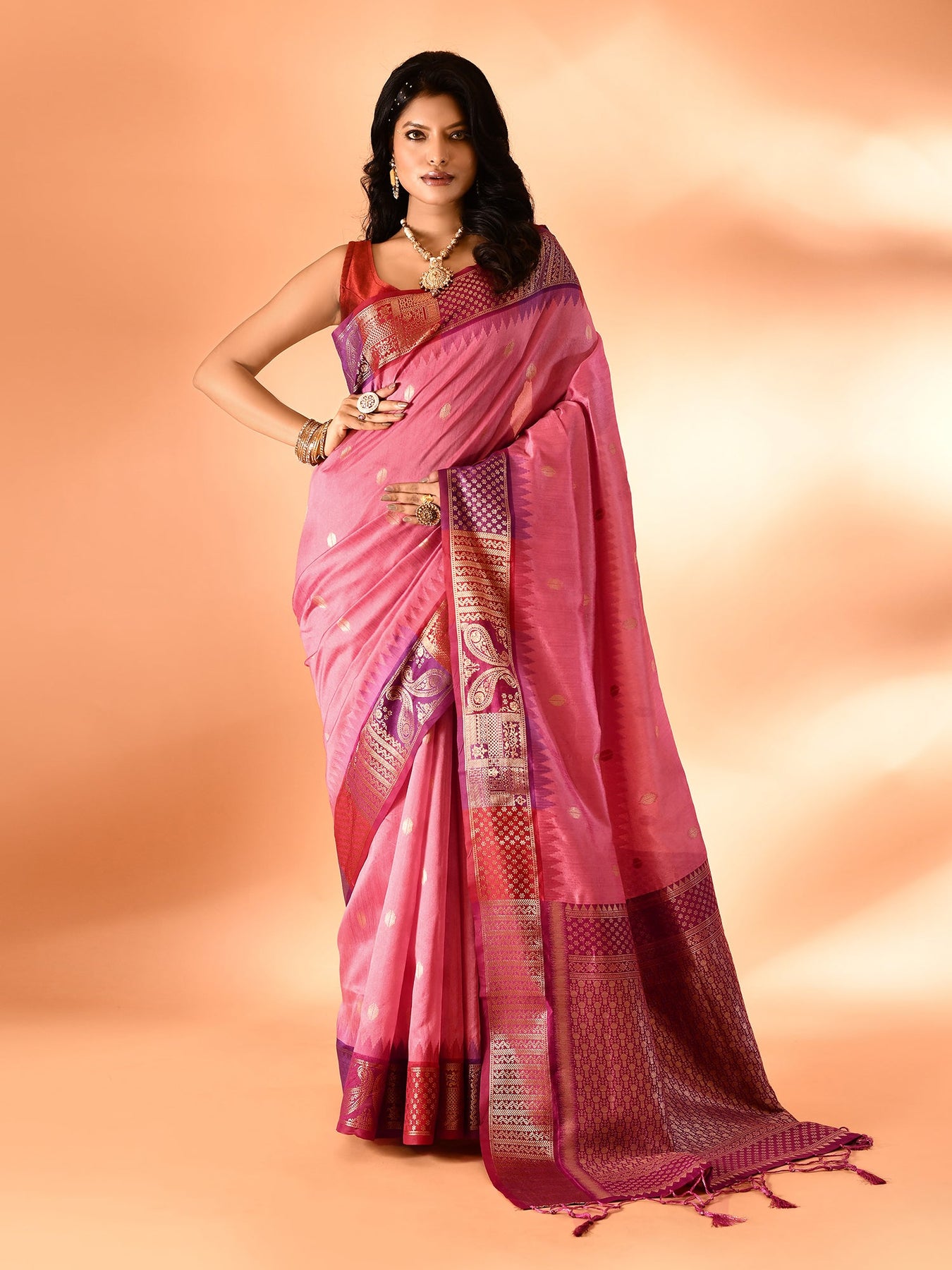 Experience the grace of this Elora Pink Cotton Silk Saree. It features traditional Banarasi weaving that looks rich but feels light. The soft fabric ensures you stay comfortable for hours at any event.