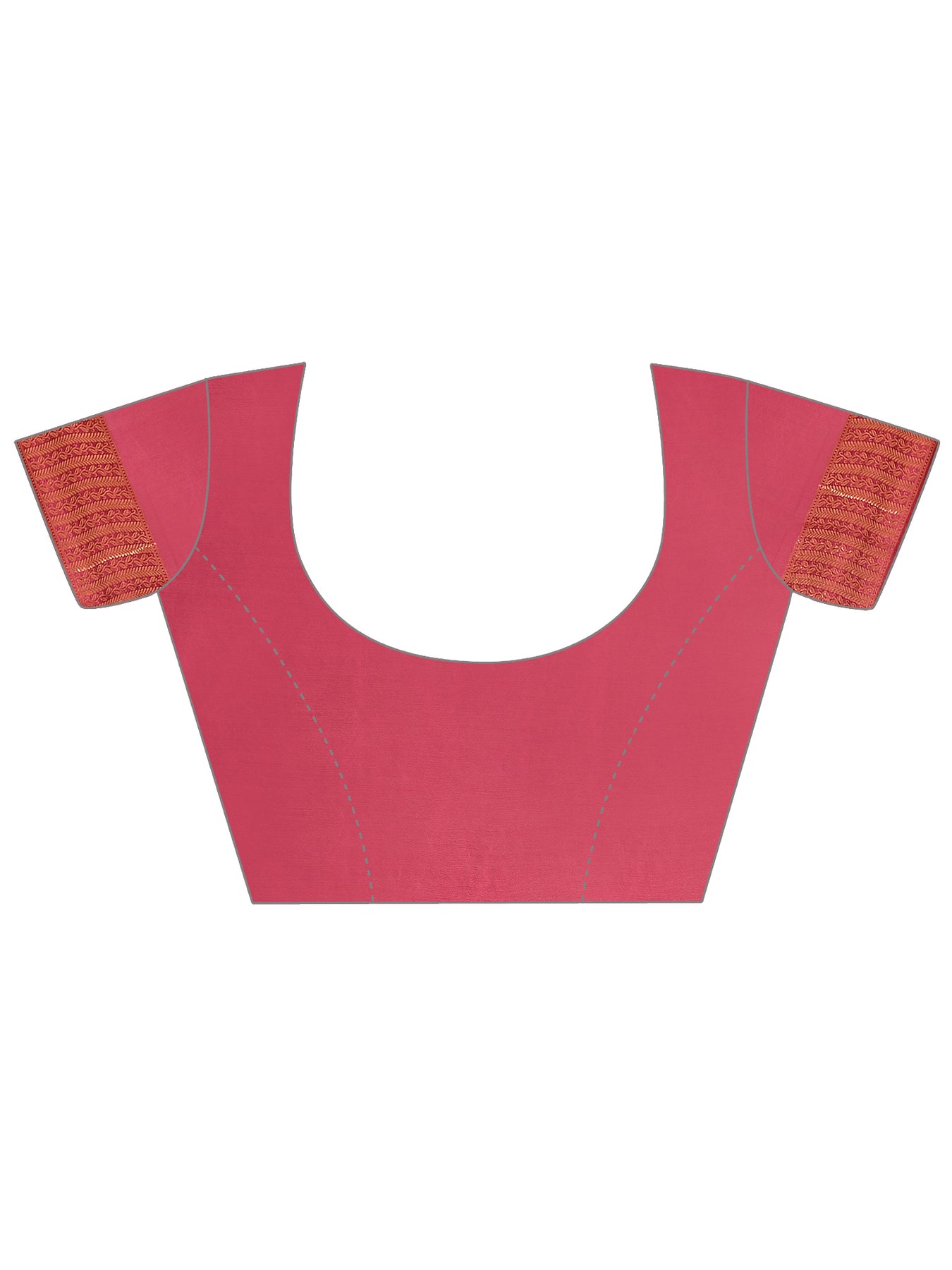 This pink saree has a beautiful sheen with gold zari work. It is easy to drape and suits every body type perfectly. Whether it is a wedding or a puja, this saree makes you stand out in the crowd.