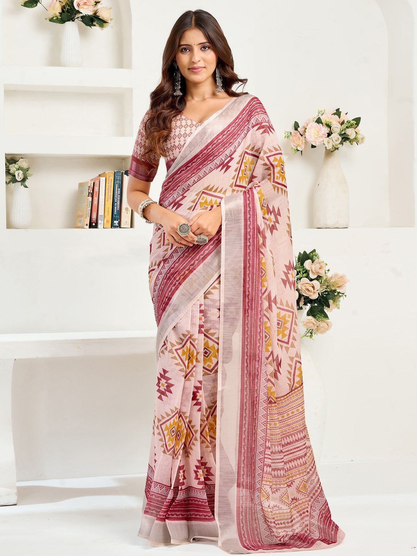 Light Pink Linen Ikat Geomatric Printed Ready To Wear Saree