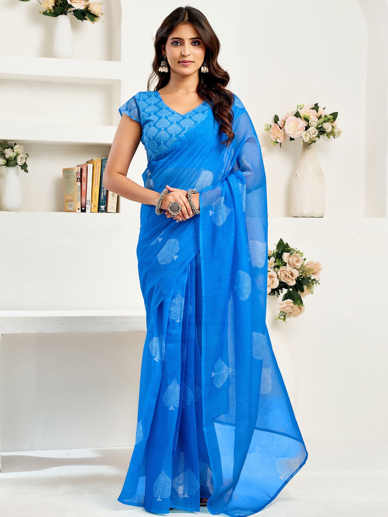 Flaunt your style with this Linen Leaf Motifs Printed Ready To Wear Saree For Women. unique design and beautiful colour Saree. Each piece is elegantly crafted with love and will surely add to your wardrobe. They will surely fetch a lot of second glances as you club it with flashy accessory. Pair this piece with heels or flats for a graceful look.