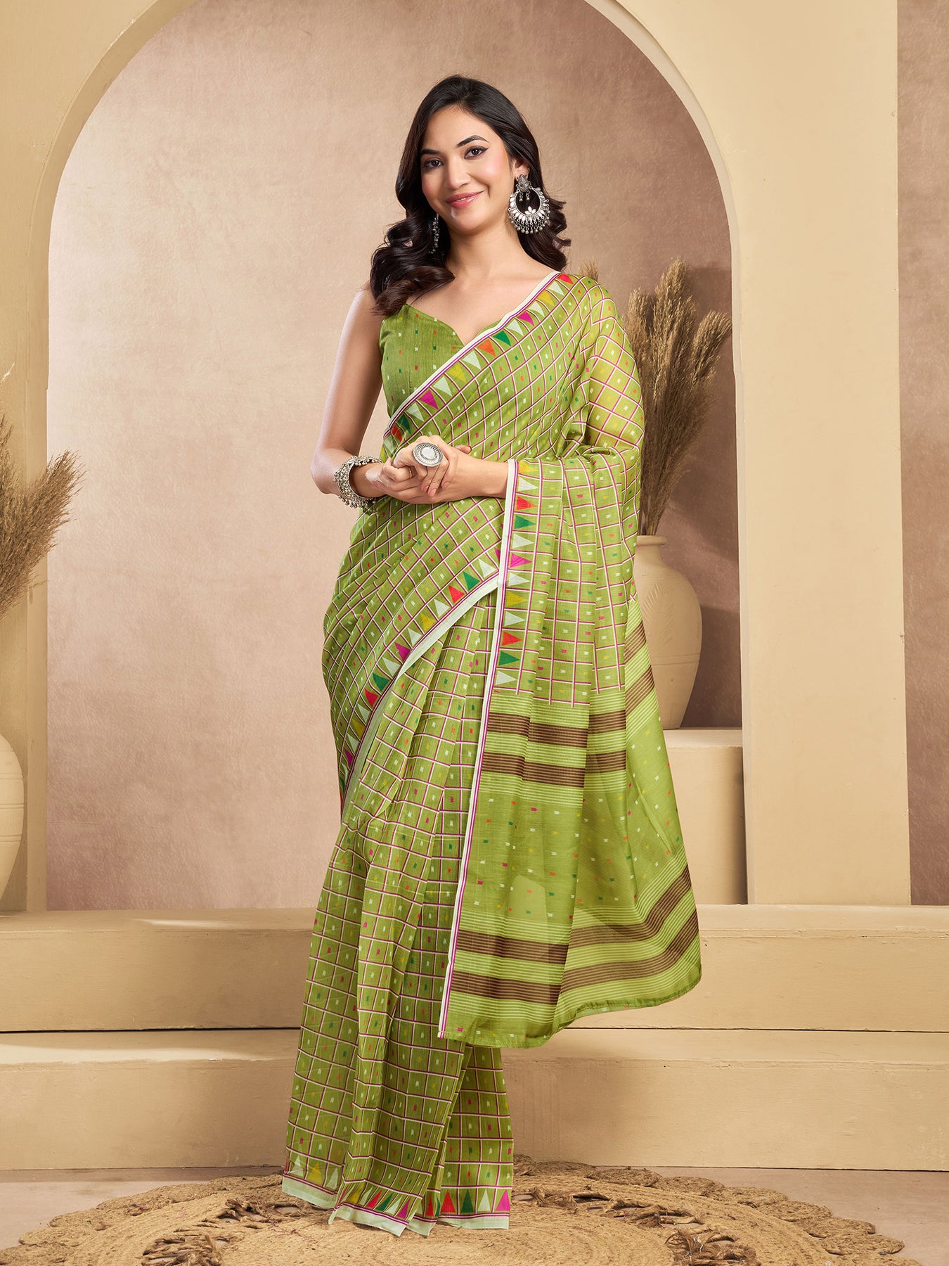 Flaunt your style with this Linen Mini Checks Printed Ready To Wear Saree For Women. unique design and beautiful colour Saree. Each piece is elegantly crafted with love and will surely add to your wardrobe. They will surely fetch a lot of second glances as you club it with flashy accessory. Pair this piece with heels or flats for a graceful look.