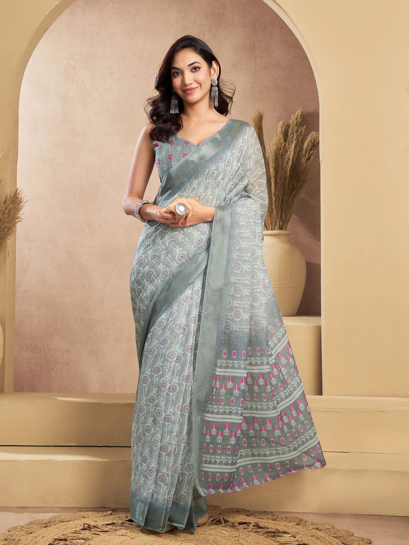 Grey Linen Geomatric Printed Ready To Wear Saree