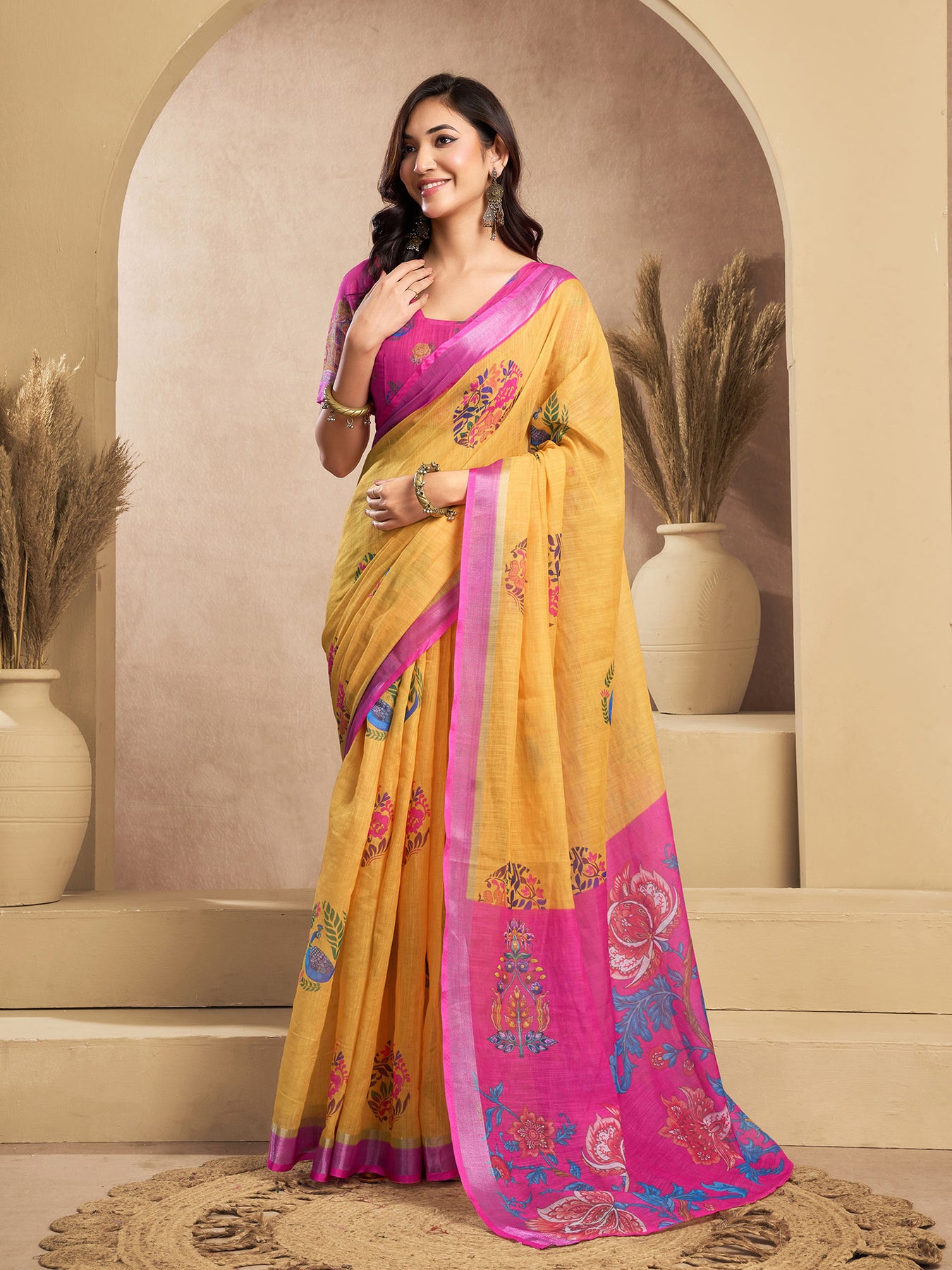 Yellow & Pink Linen Floral Printed Ready To Wear Saree