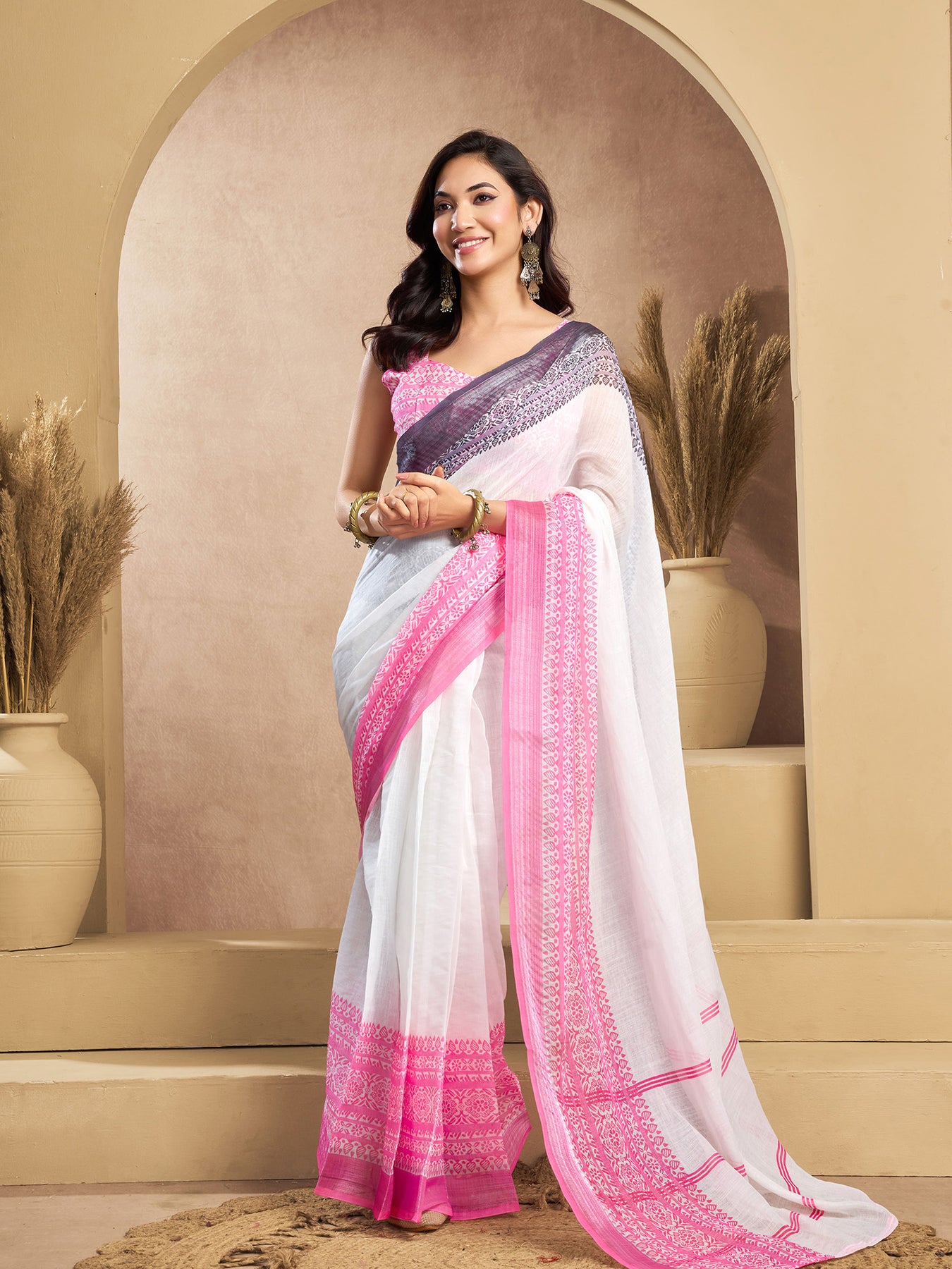 White Linen Plain Printed Ready To Wear Saree