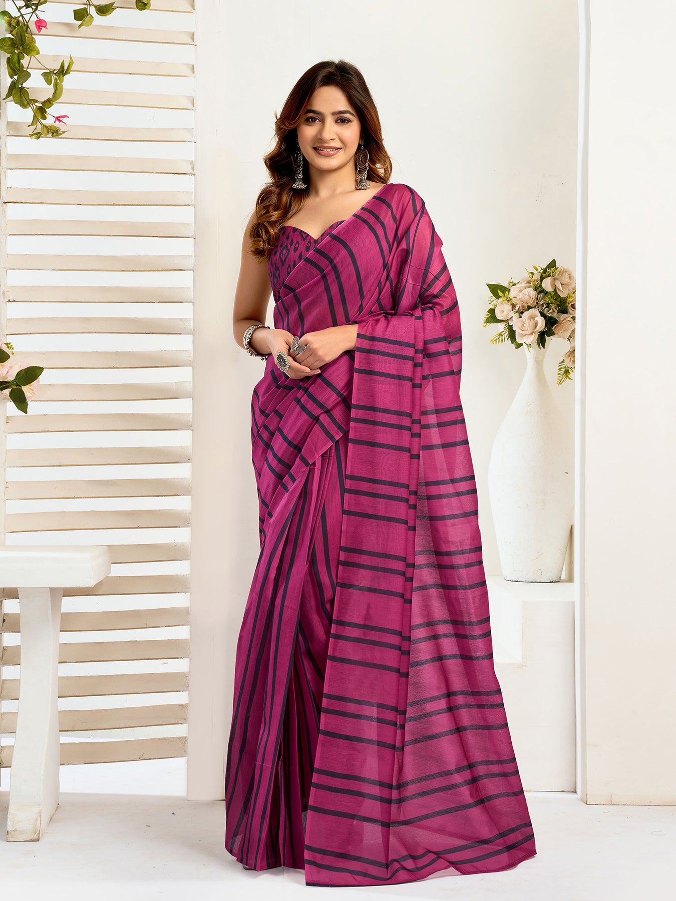 Magenta Linen Striped Printed Ready To Wear Saree