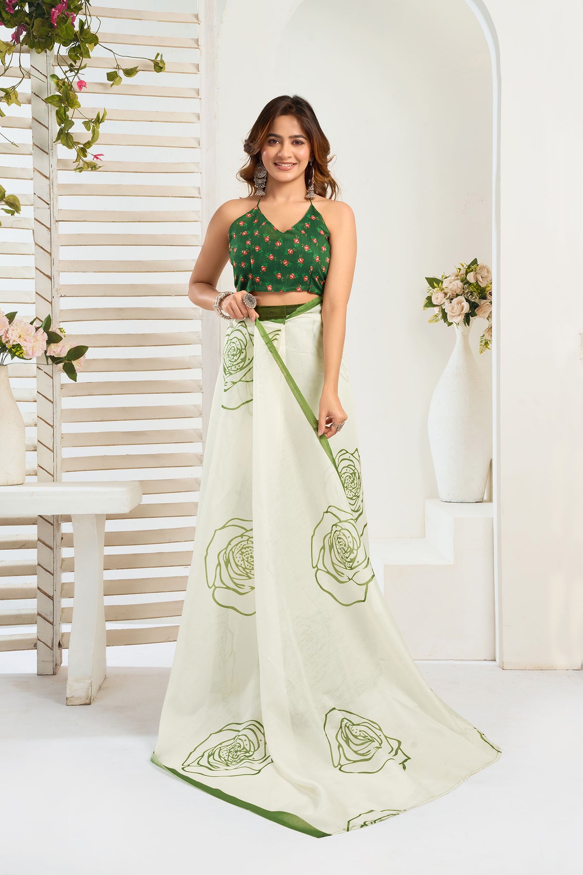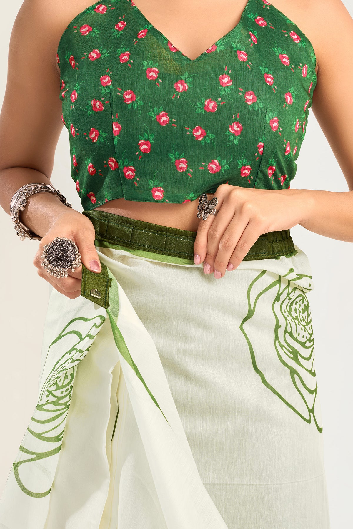 Get this Linen Floral Printed Ready To Wear Saree Online at Elora Fashion – The best online store for Tussar silk saree, banarasi silk saree, kanjivaram silk saree, paithani silk saree, bandhani saree, patola saree, linen saree and organza saree.