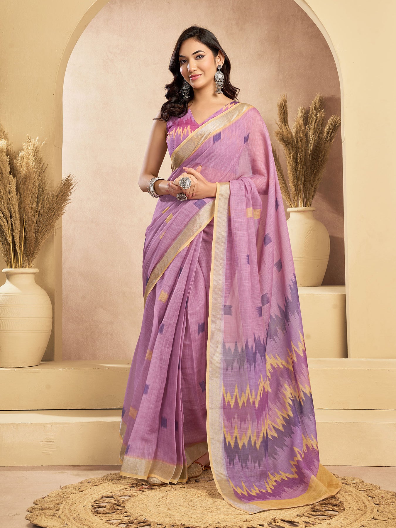 Lavender Linen Woven Sqaure Printed Ready to Wear Saree With Pocket