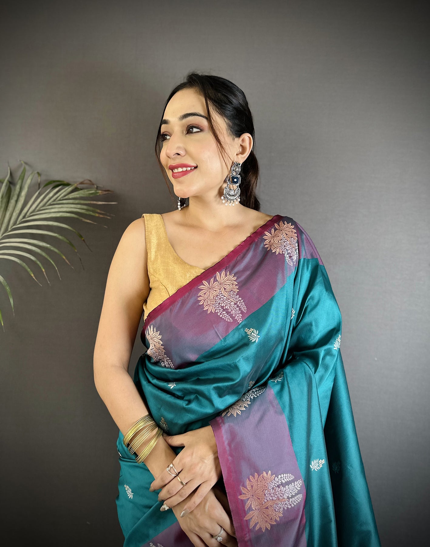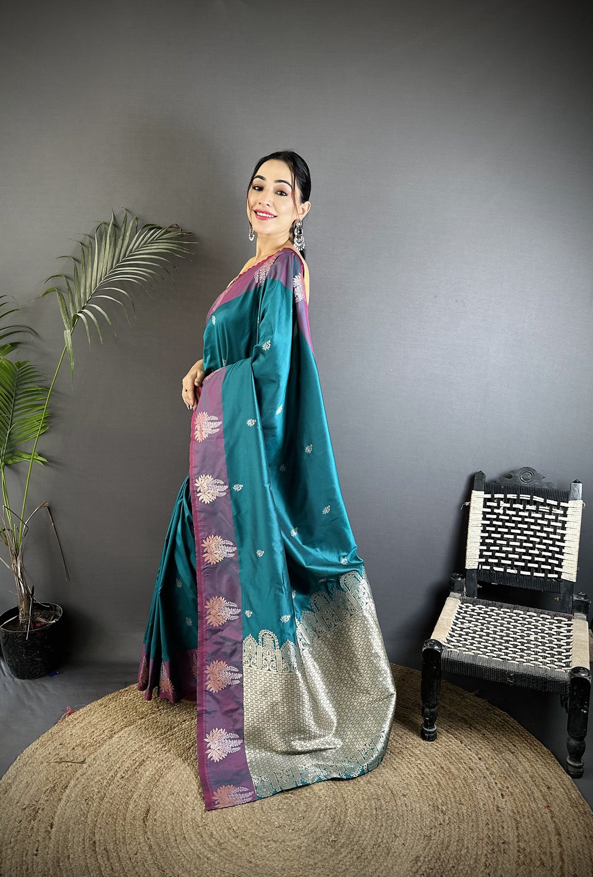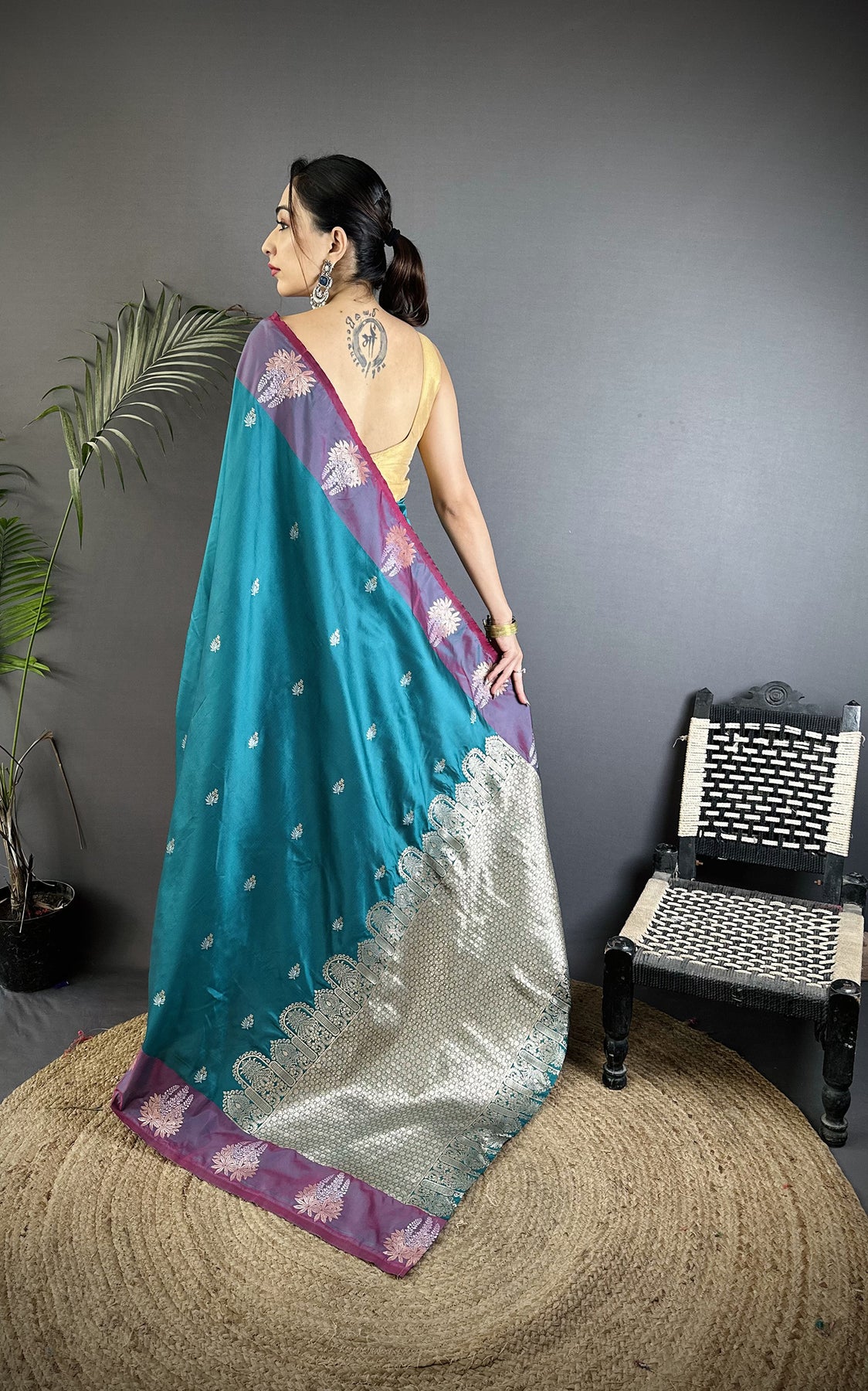 Teal Soft Silk Small Butti Jacquard Zari Weaving Banarasi Saree