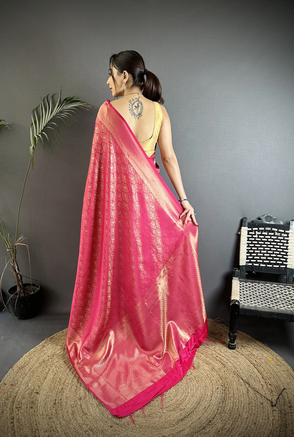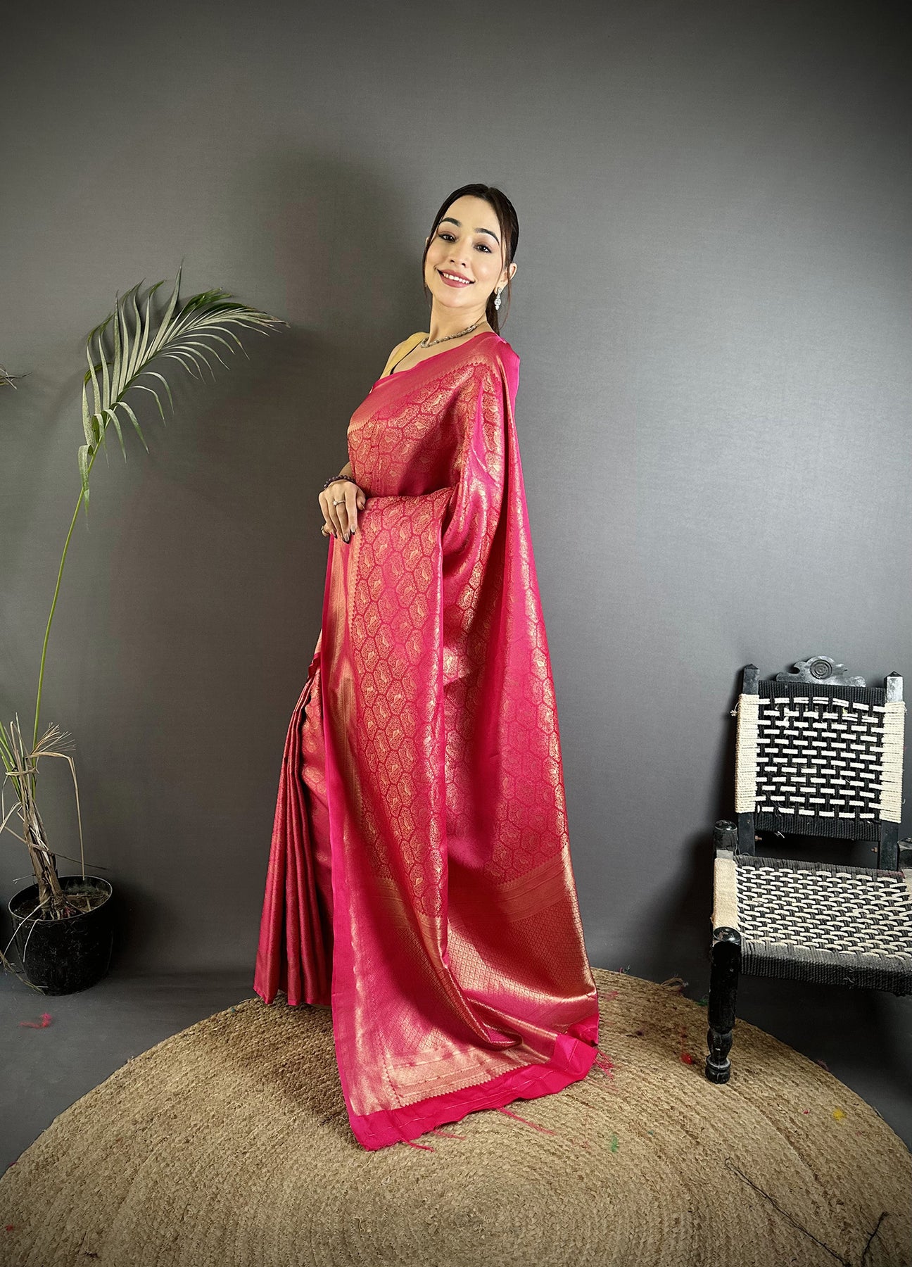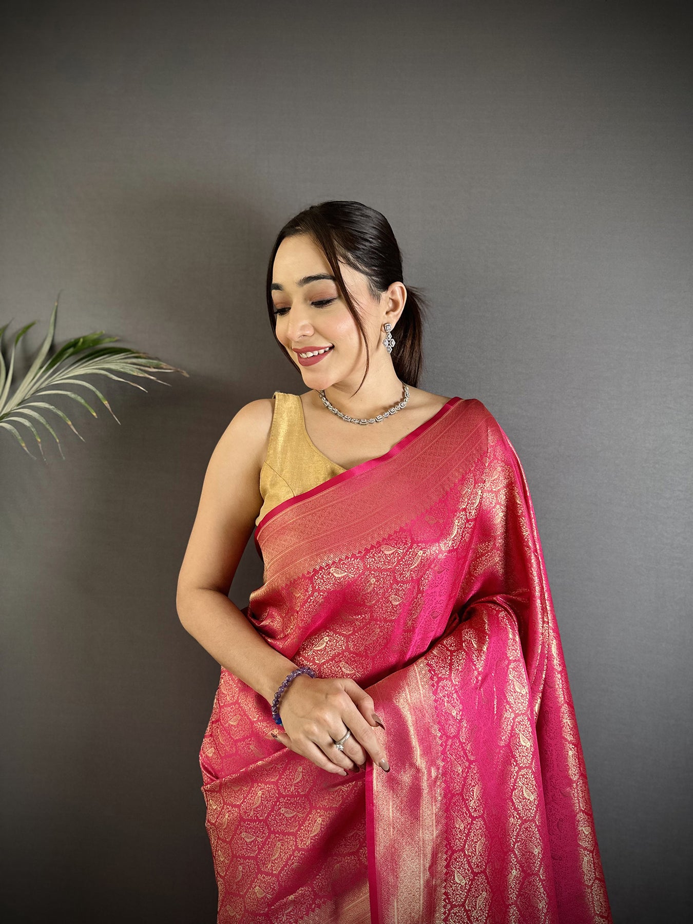 Rani Pink Soft Satin Silk Paisley & Floral Banarasi Saree