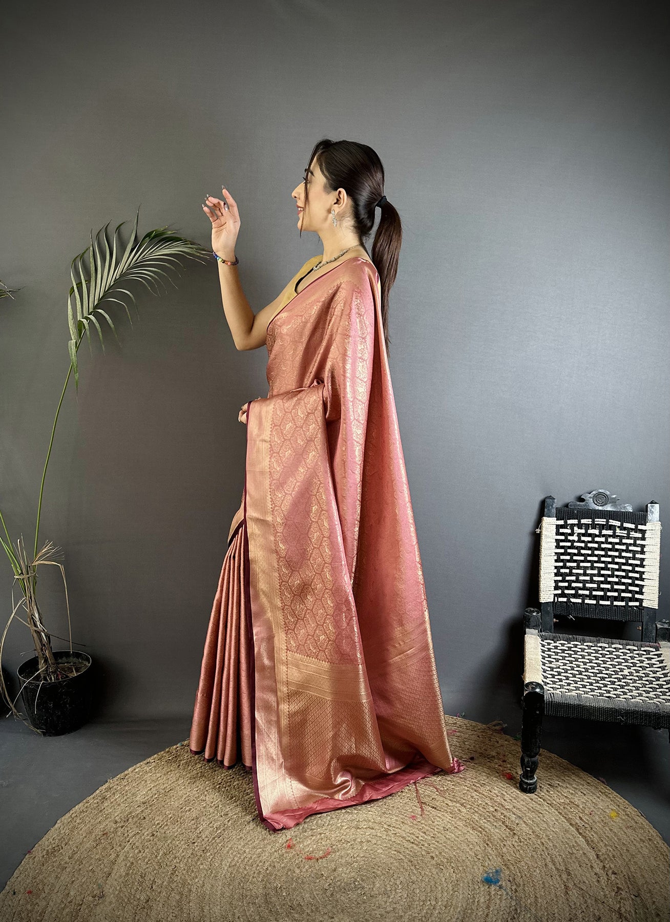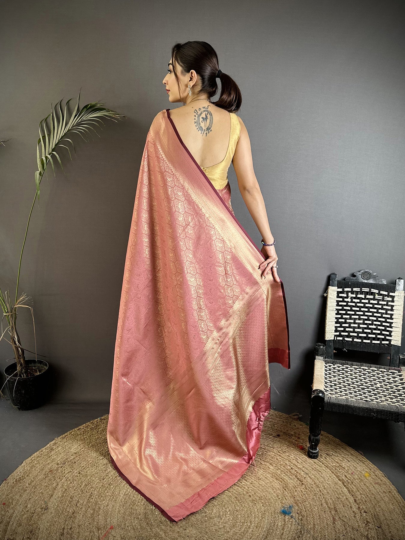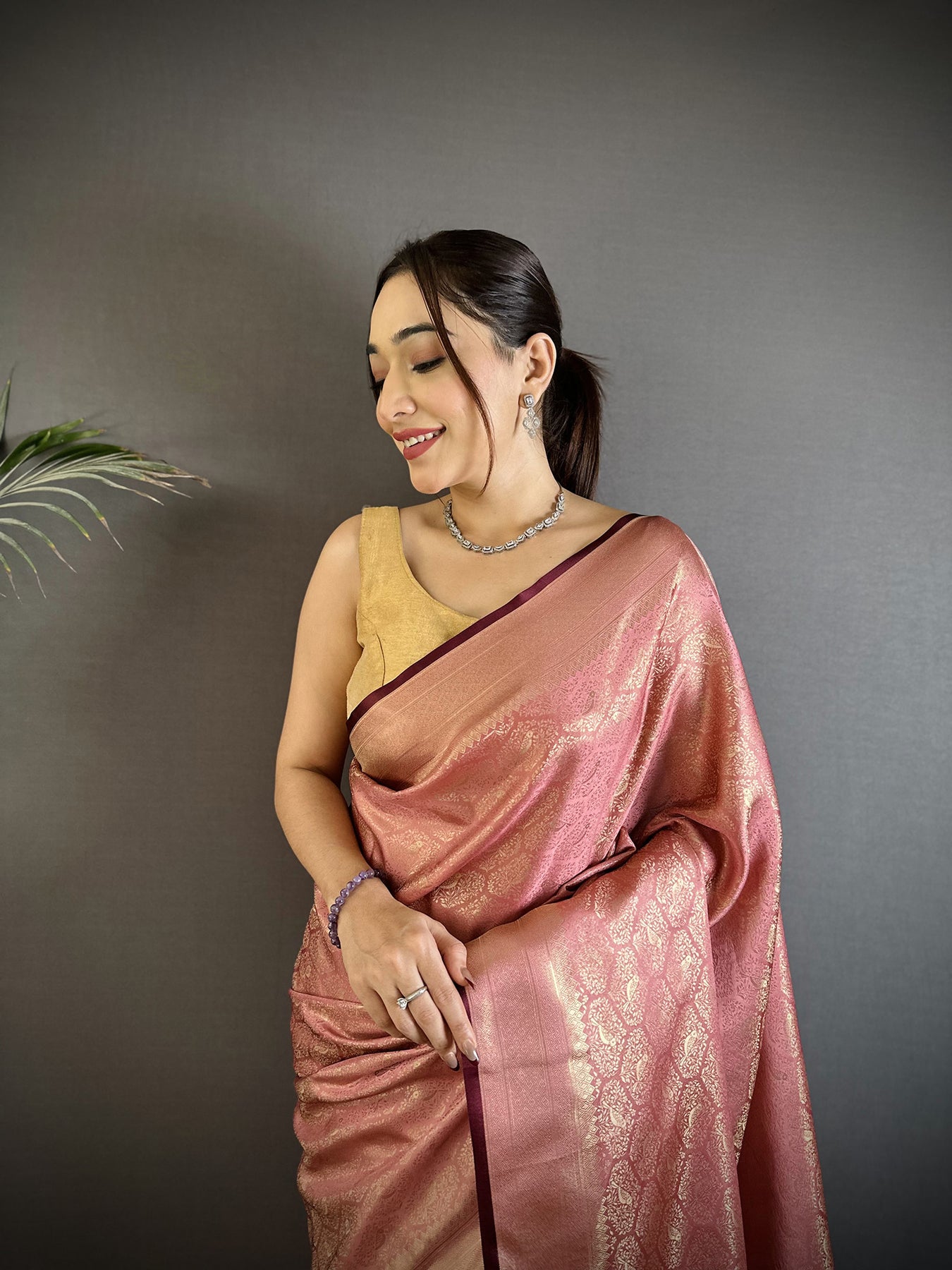Rose Gold Soft Satin Silk Paisley & Floral Banarasi Saree
