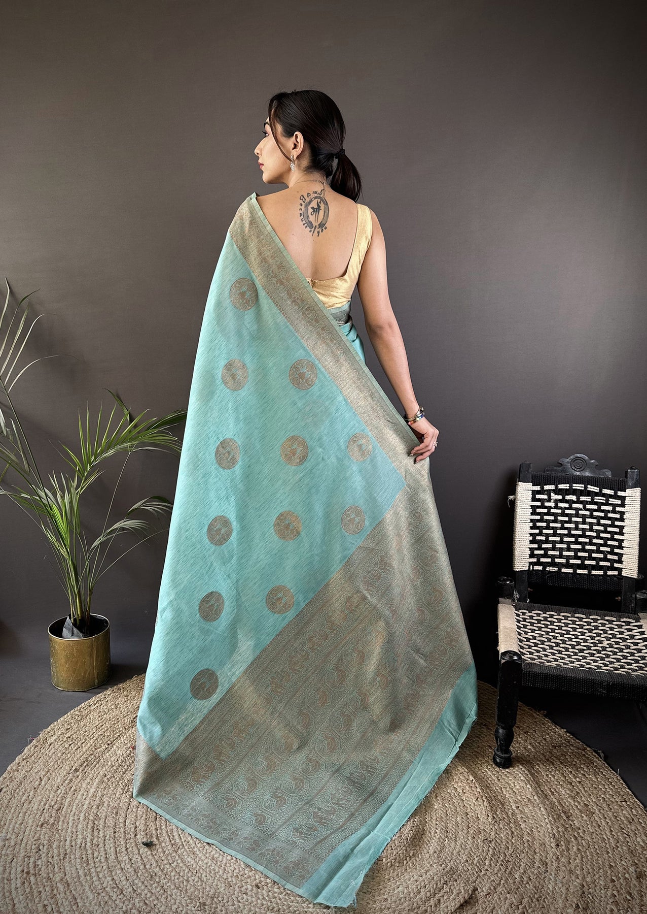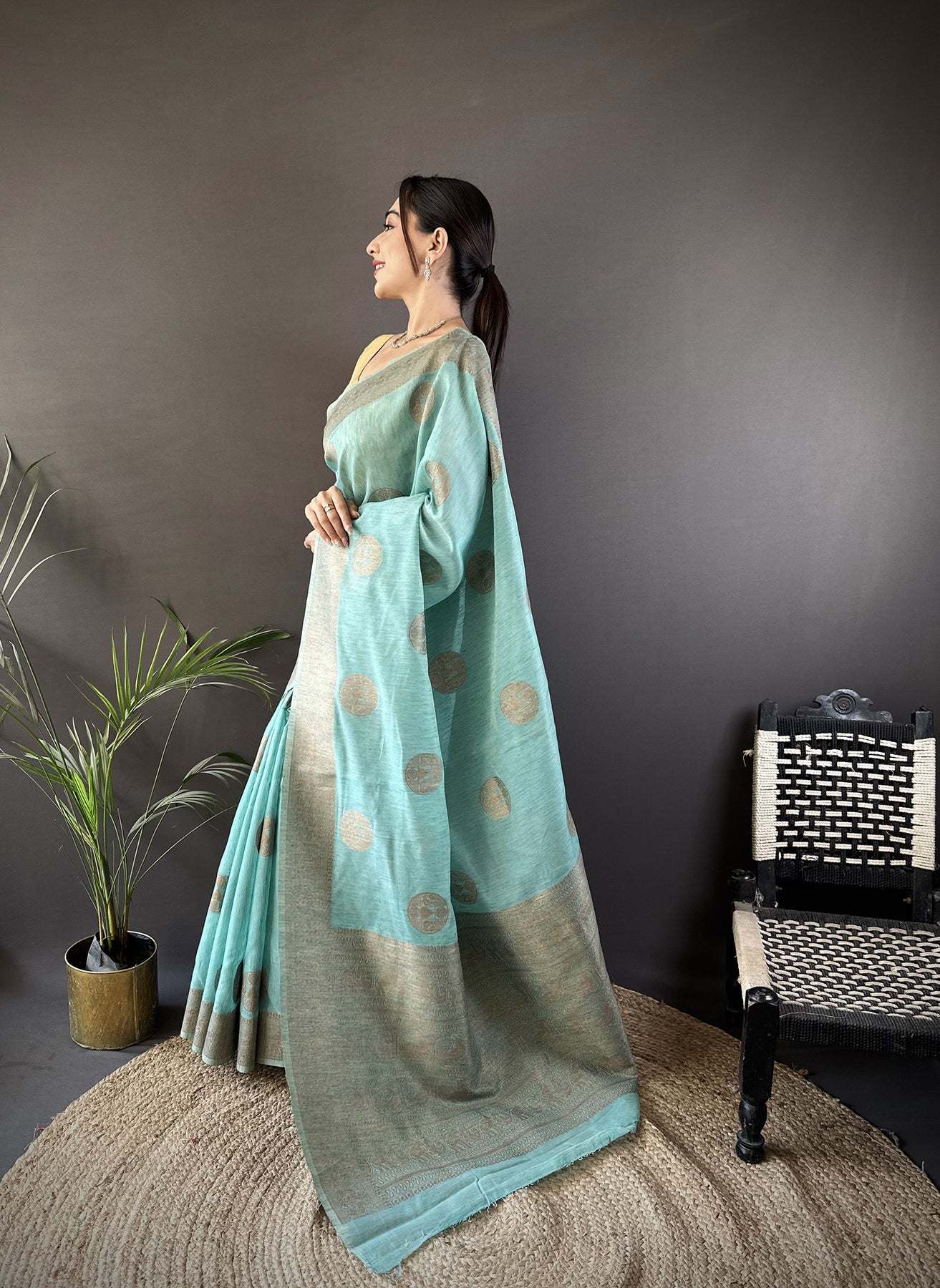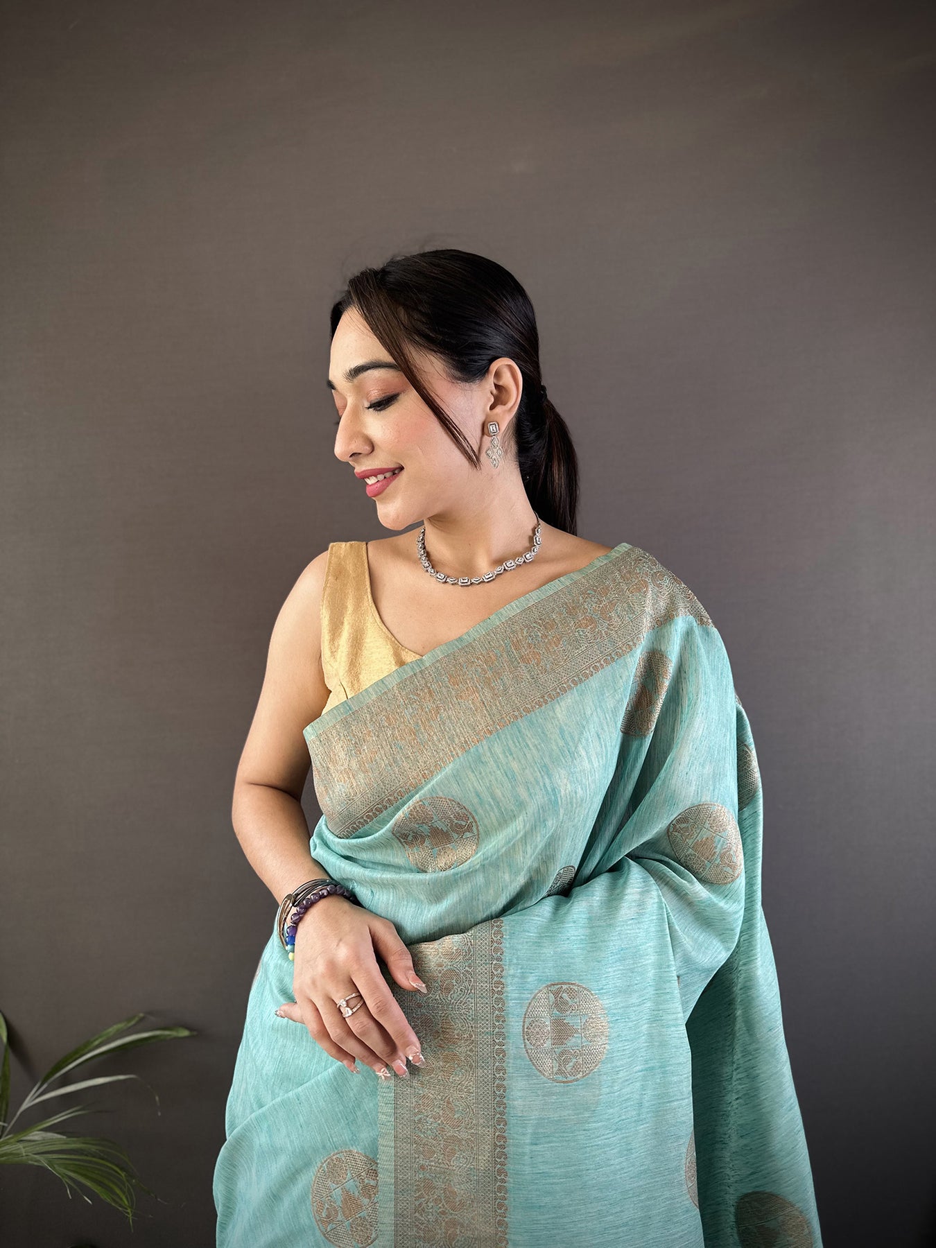 Get this Linen Silk Floral & Paisley Jacquard Zari Woven Banarasi Saree Online at Elora Fashion – The best online store for Tussar silk saree, banarasi silk saree, kanjivaram silk saree, paithani silk saree, bandhani saree, patola saree, linen saree and organza saree.