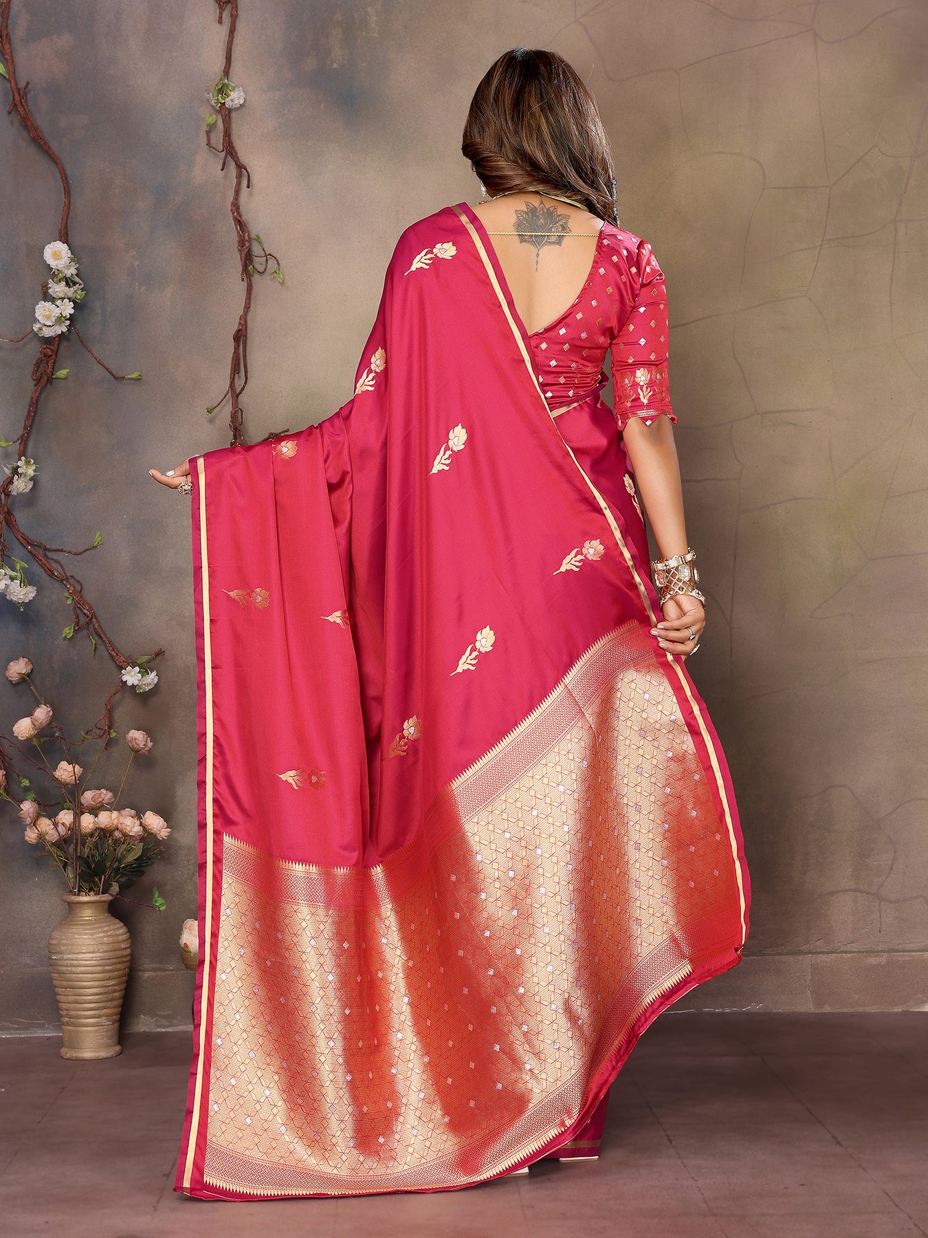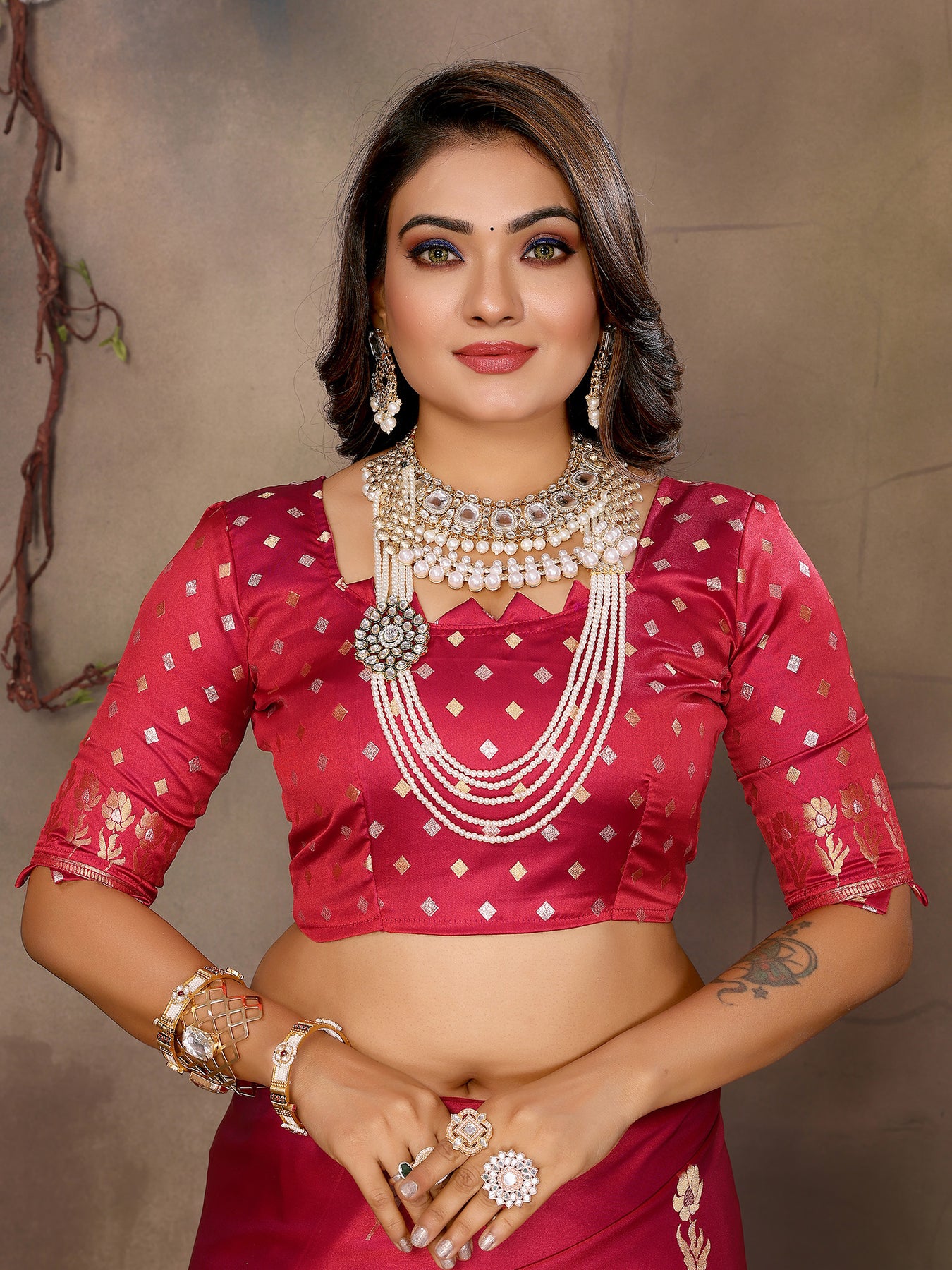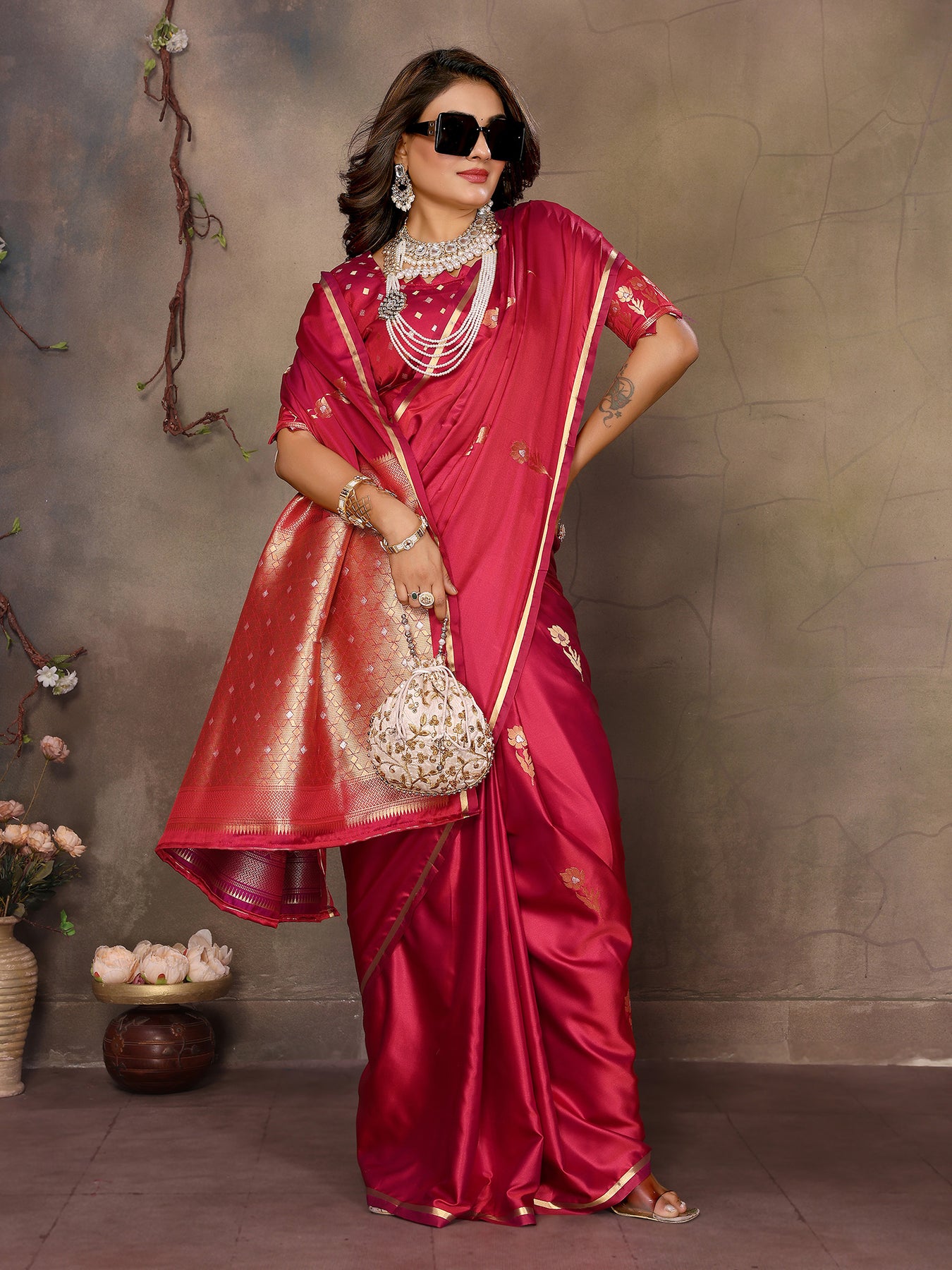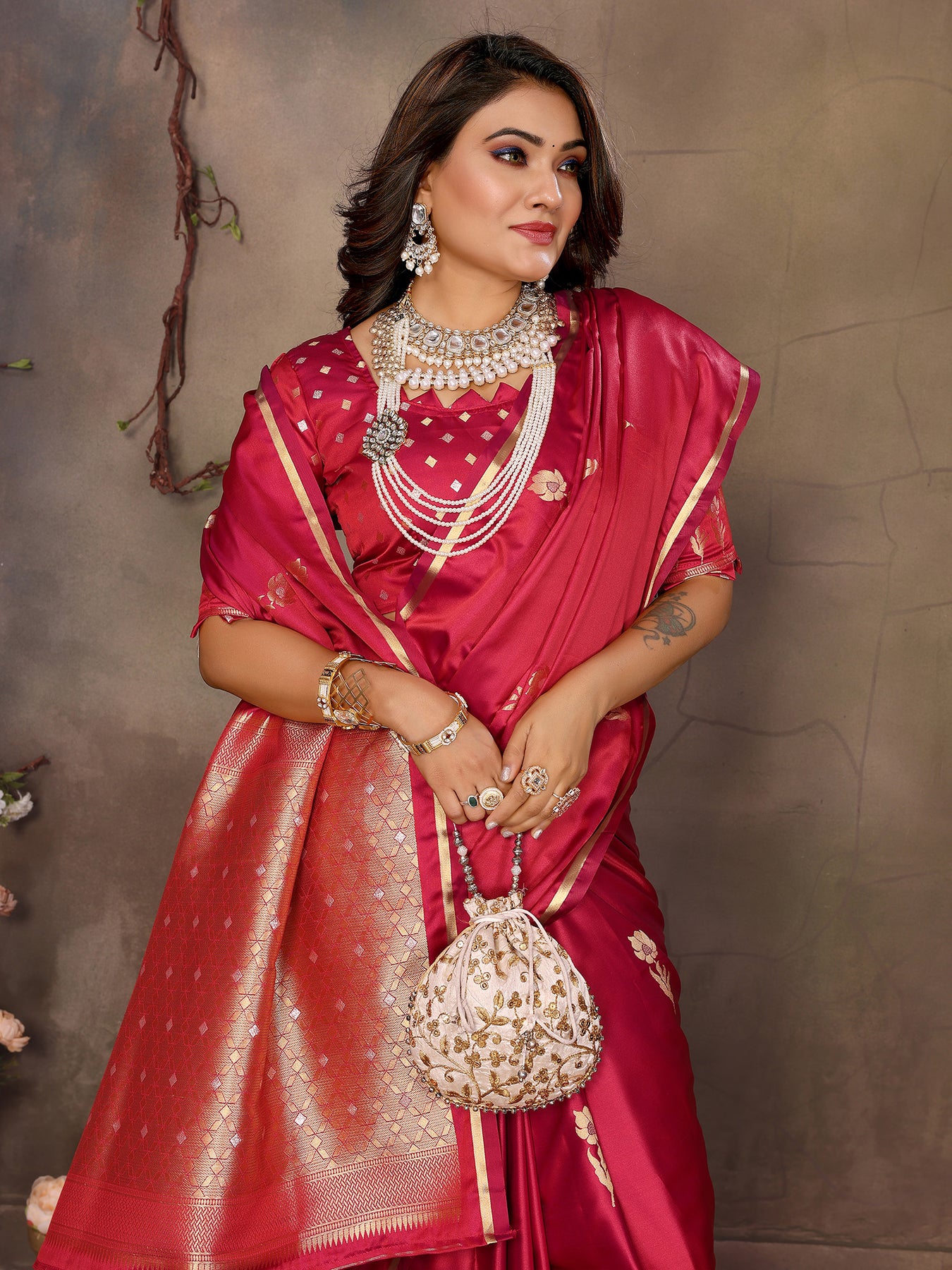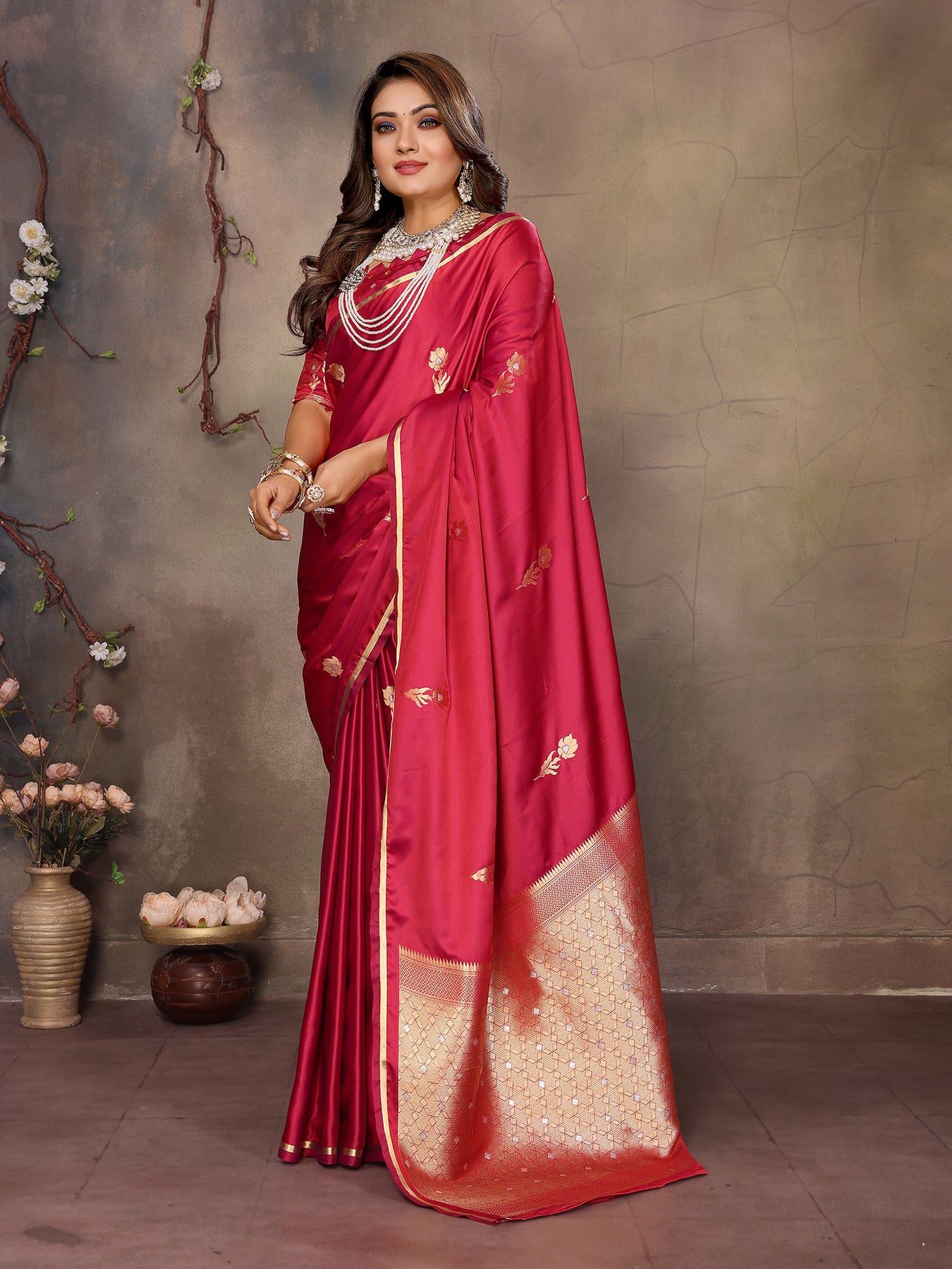 Red Satin Silk Floral & Botanical Motifs Zari Woven Banarasi Saree