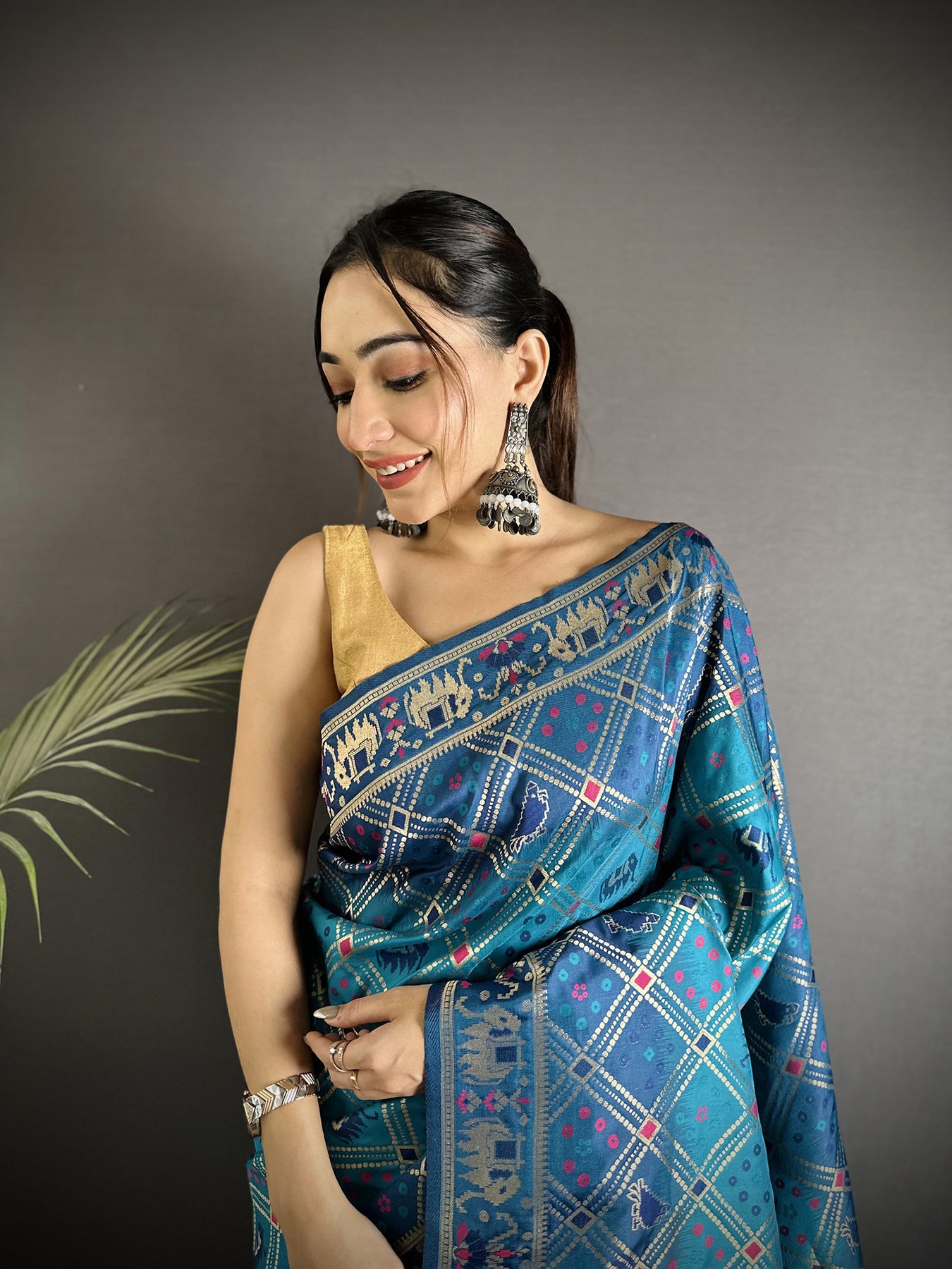 Blue Soft Silk Geomatric Zari Woven Patola Saree