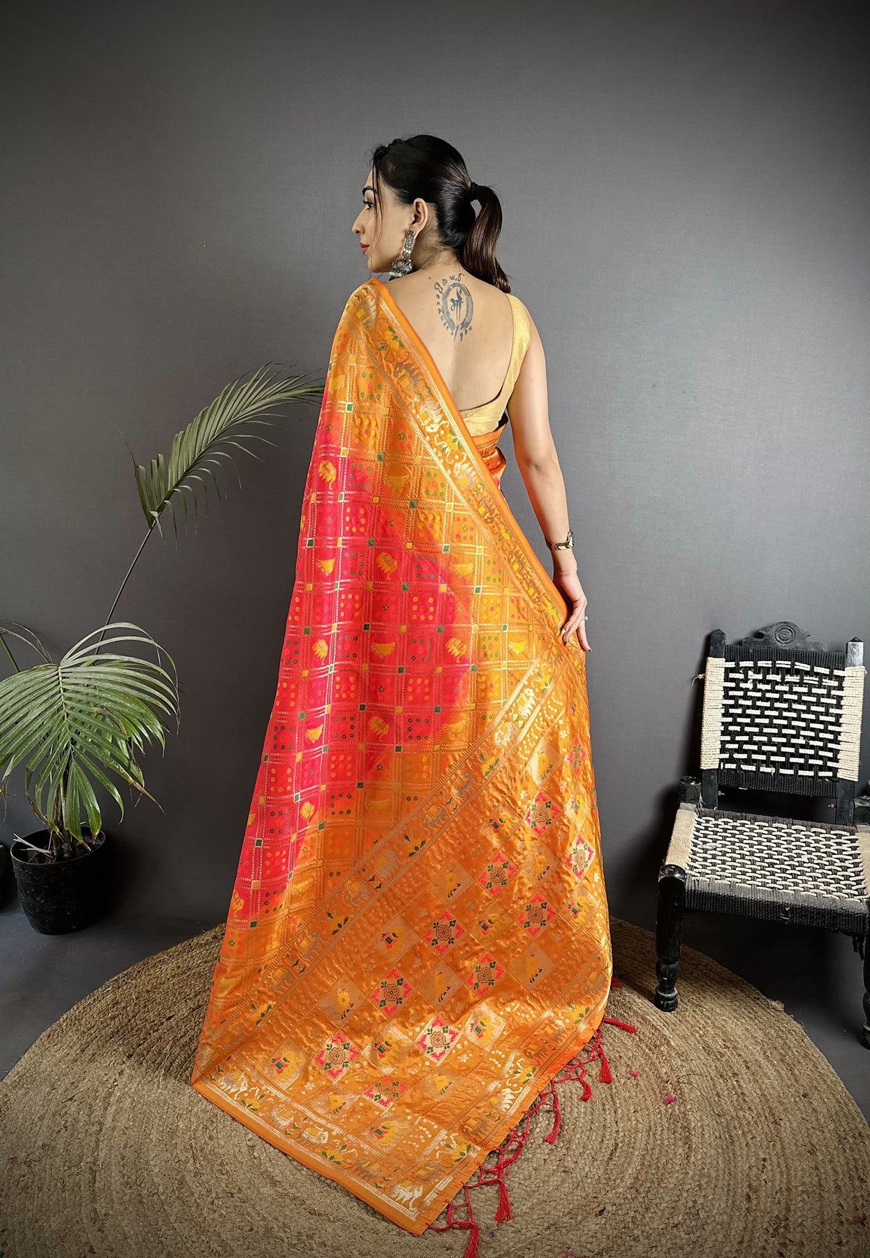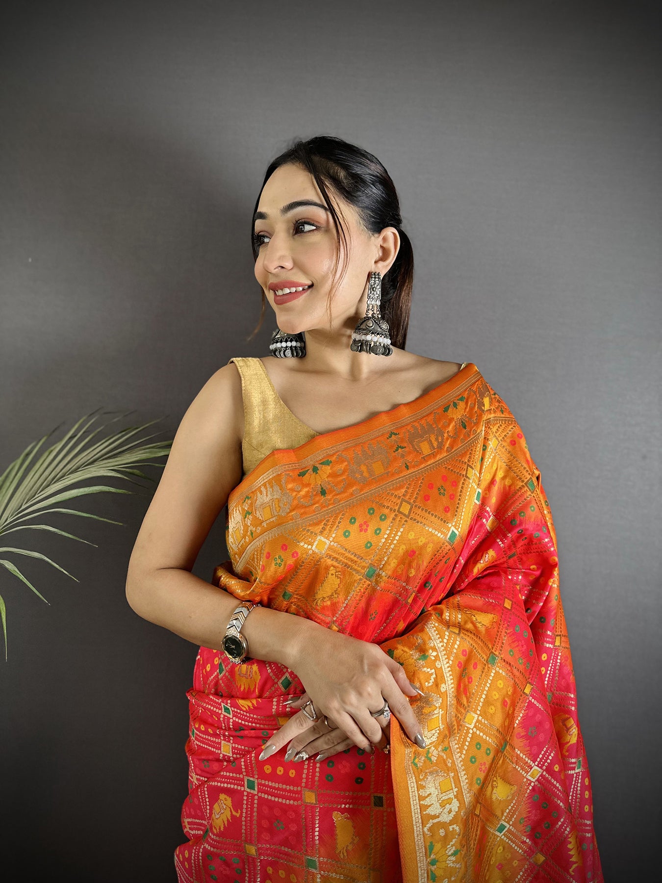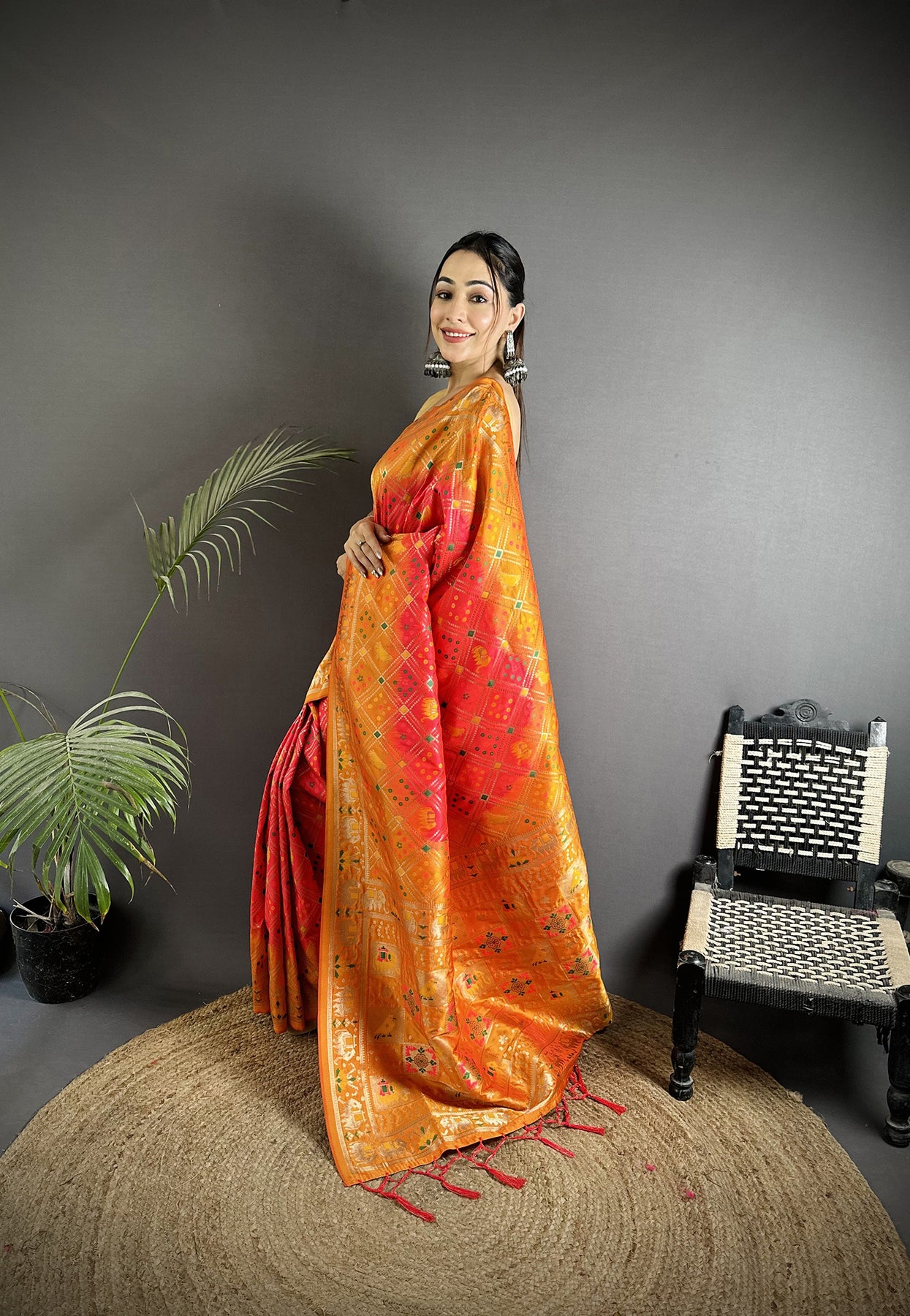 Get this Soft Silk Geomatric Zari Woven Patola Saree Online at Elora Fashion – The best online store for Tussar silk saree, banarasi silk saree, kanjivaram silk saree, paithani silk saree, bandhani saree, patola saree, linen saree and organza saree.