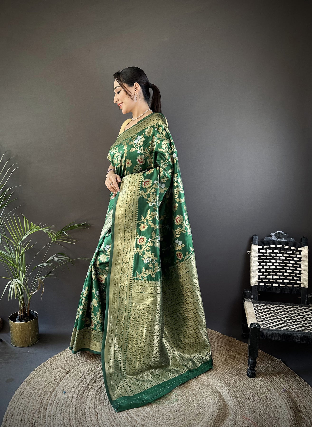 Green Soft Banarasi Silk Floral & Ethnic Motifs Meenakari Zari Weaving Banarasi Saree