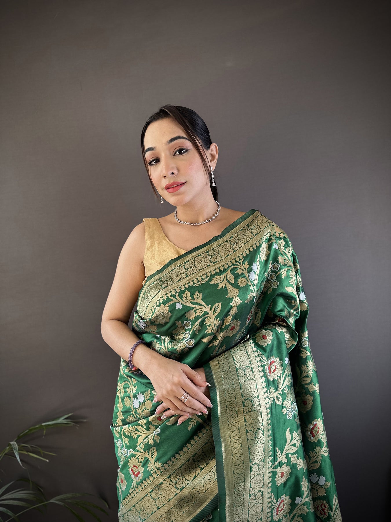 Flaunt your style with this Soft Banarasi Silk Floral & Ethnic Motifs Meenakari Zari Weaving Banarasi Saree For Women. unique design and beautiful colour Saree. Each piece is elegantly crafted with love and will surely add to your wardrobe. They will surely fetch a lot of second glances as you club it with flashy accessory. Pair this piece with heels or flats for a graceful look.