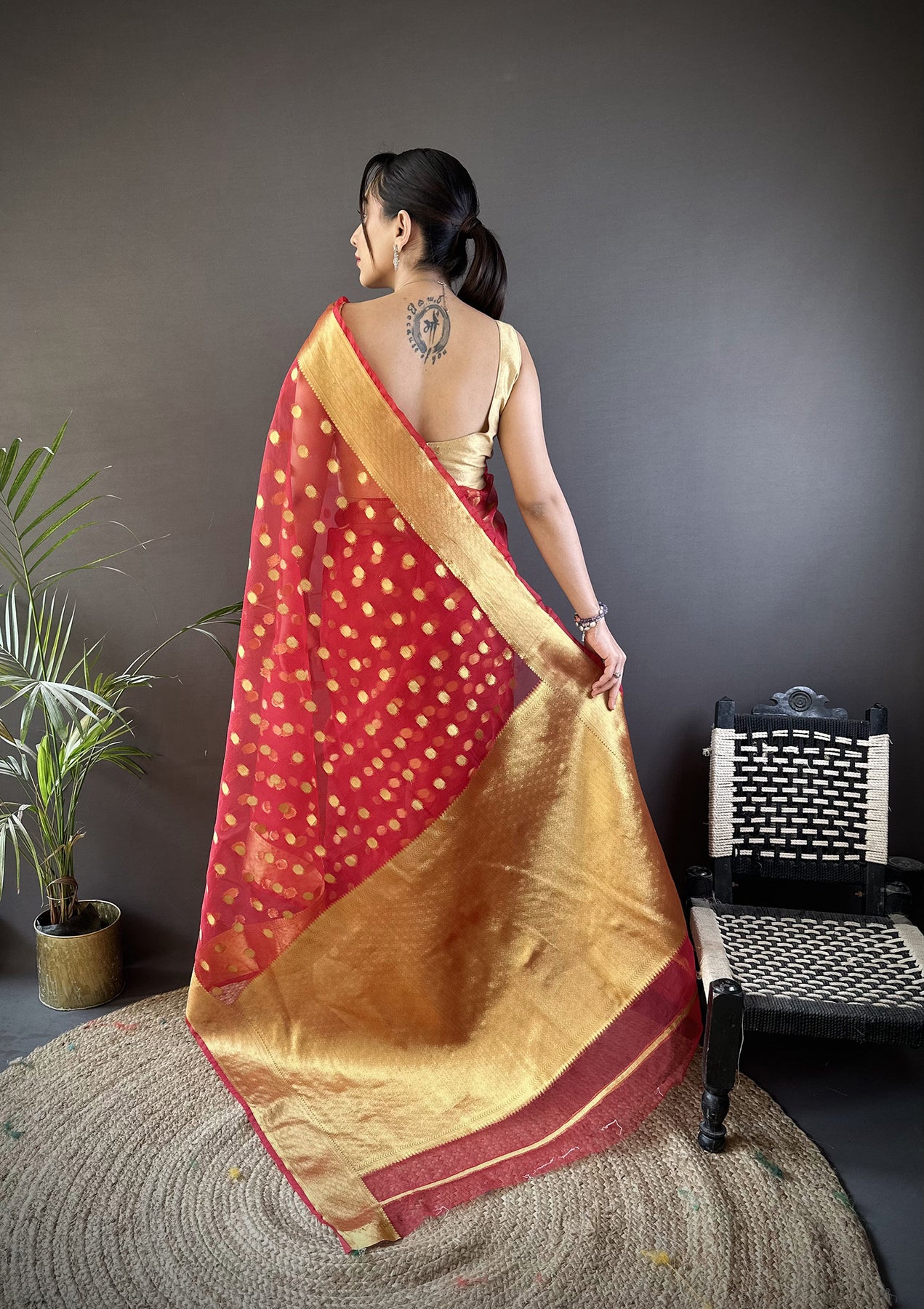Red Organza Silk Polka Dot Zari Weaving Banarasi Saree
