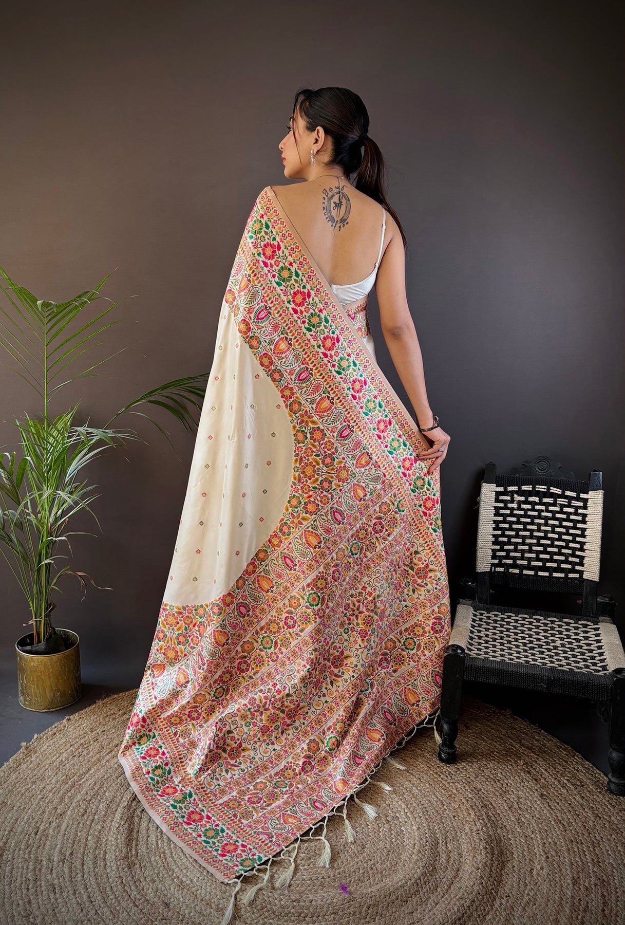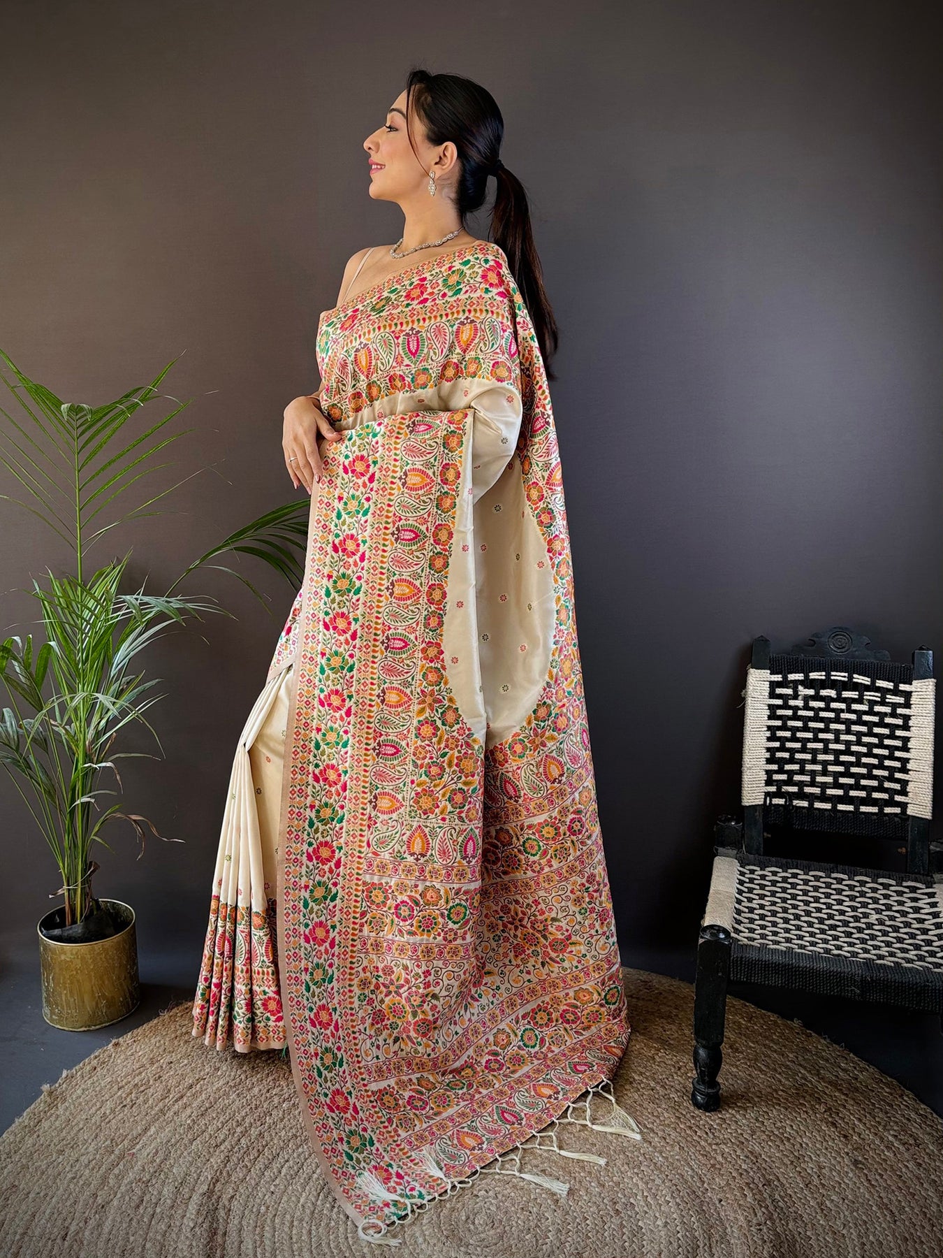 Silk Meena weaving Pashmina work Kashmiri saree in elegant white color, featuring intricate traditional Kashmiri craftsmanship, rich silk texture, detailed Meena patterns, and luxurious Pashmina weaving, perfect for weddings, festivals, and special occasions.