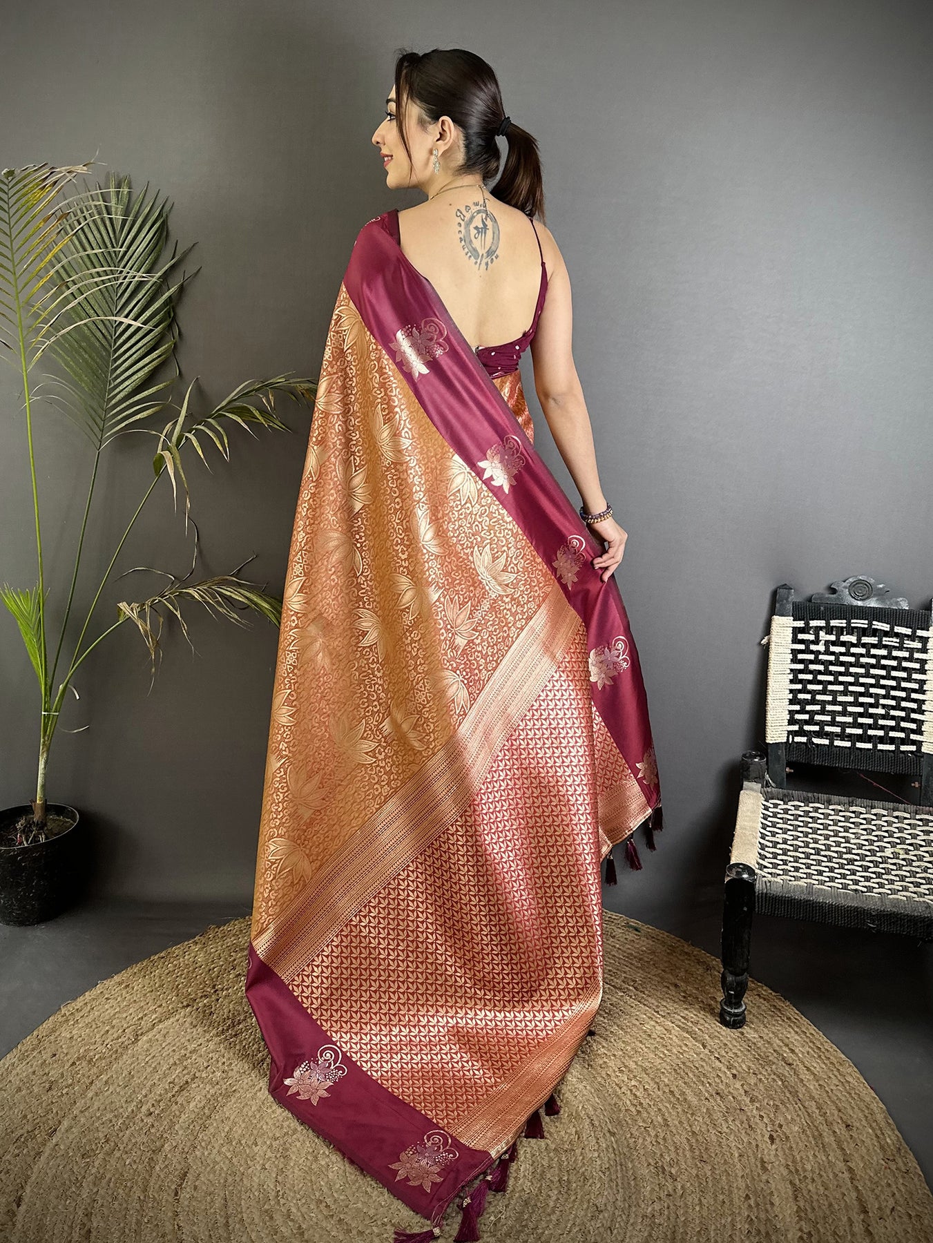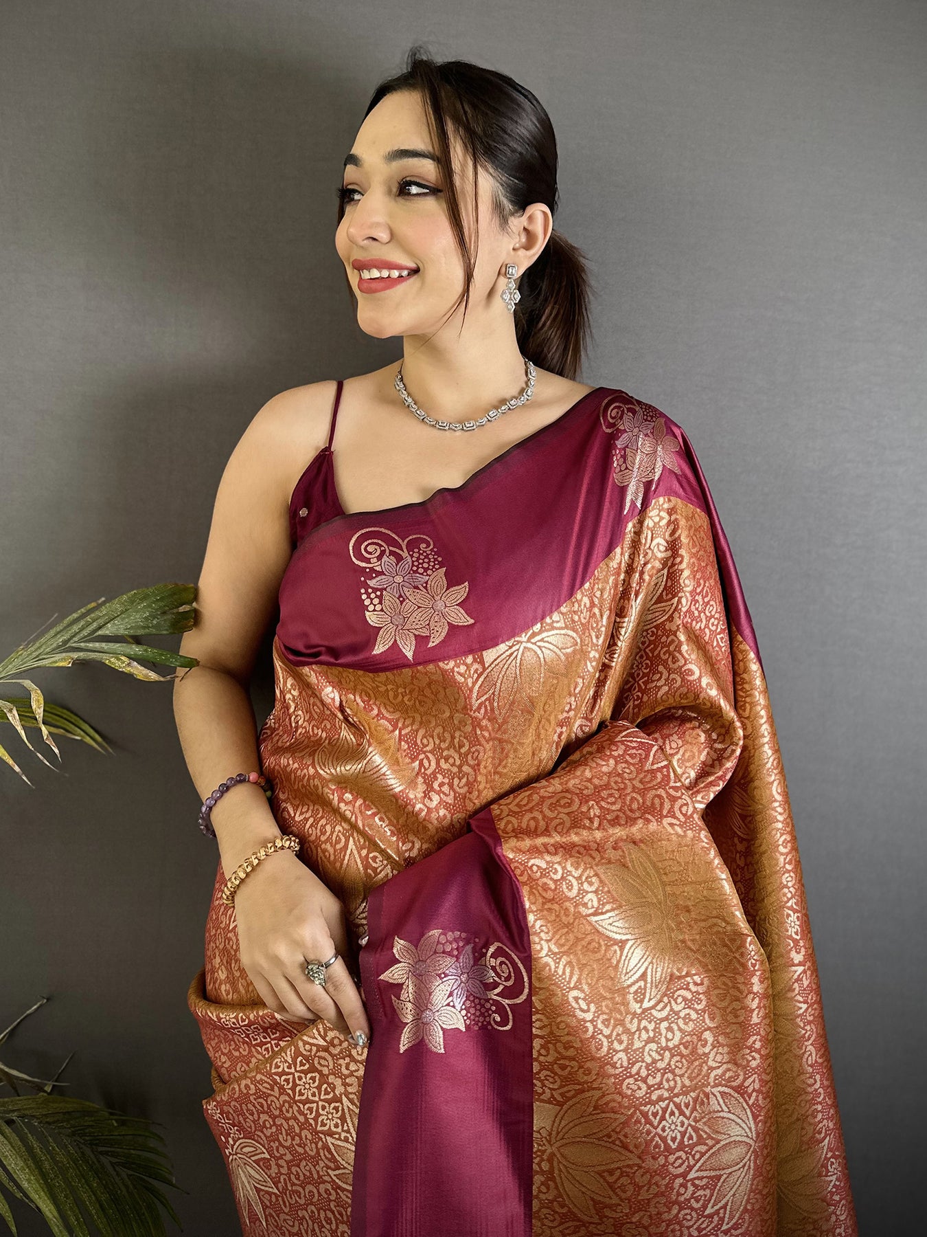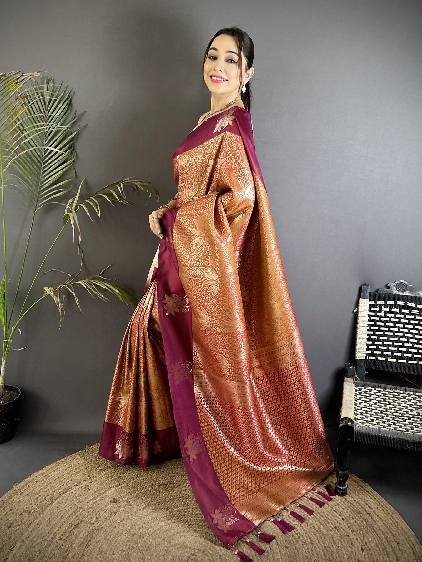 Wine Soft Silk Intricate Rose Gold Zari Weaving Dharamvaram Saree