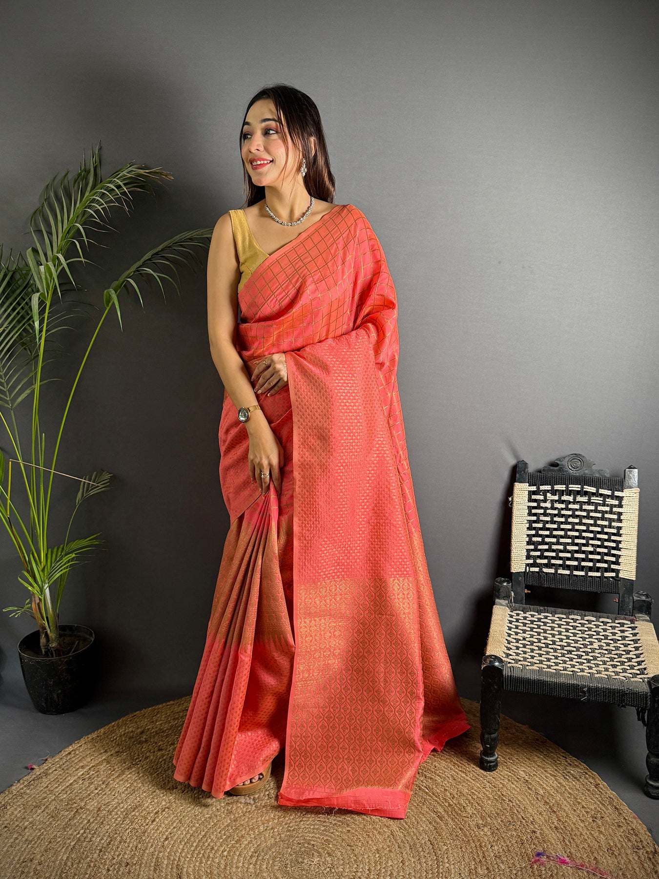 Peach Soft Lichi Silk Banarasi Khicha Zari Work Saree