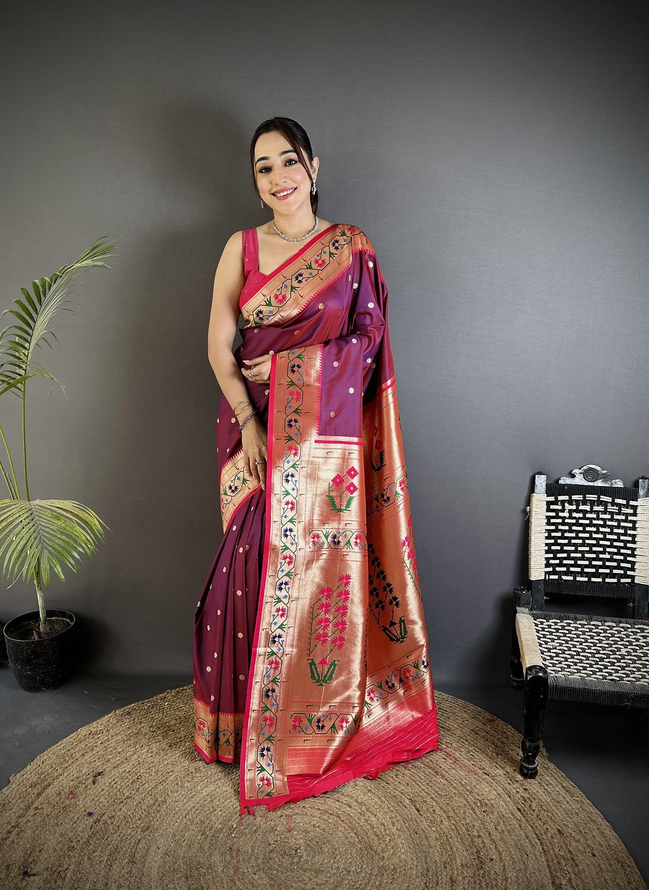 Enhance your ethnic collection with this Wine Lichi Silk Paithani Saree, featuring intricate Ikkat weaving and floral motifs with zari work. Ideal for weddings, festivals, and special occasions.