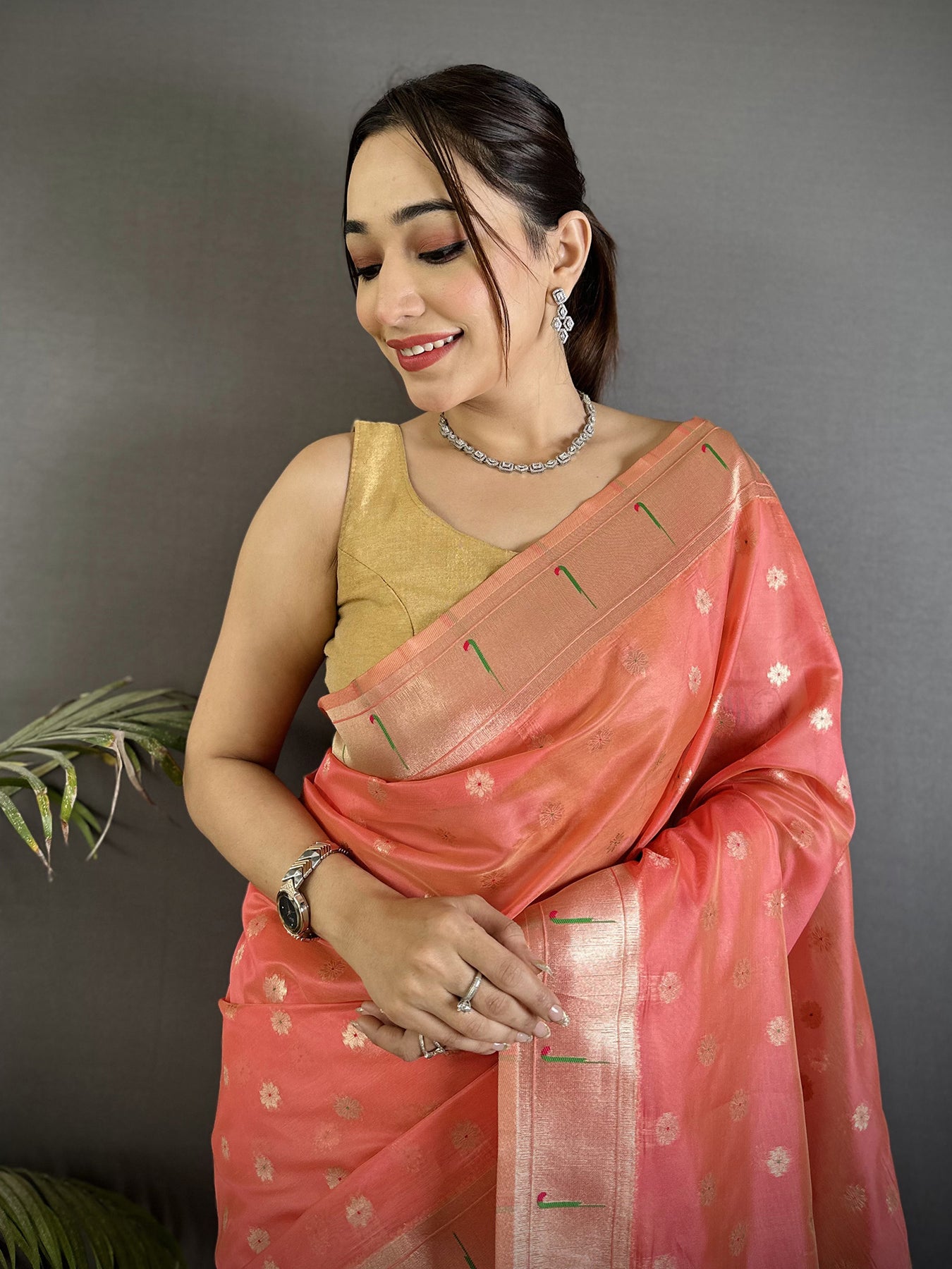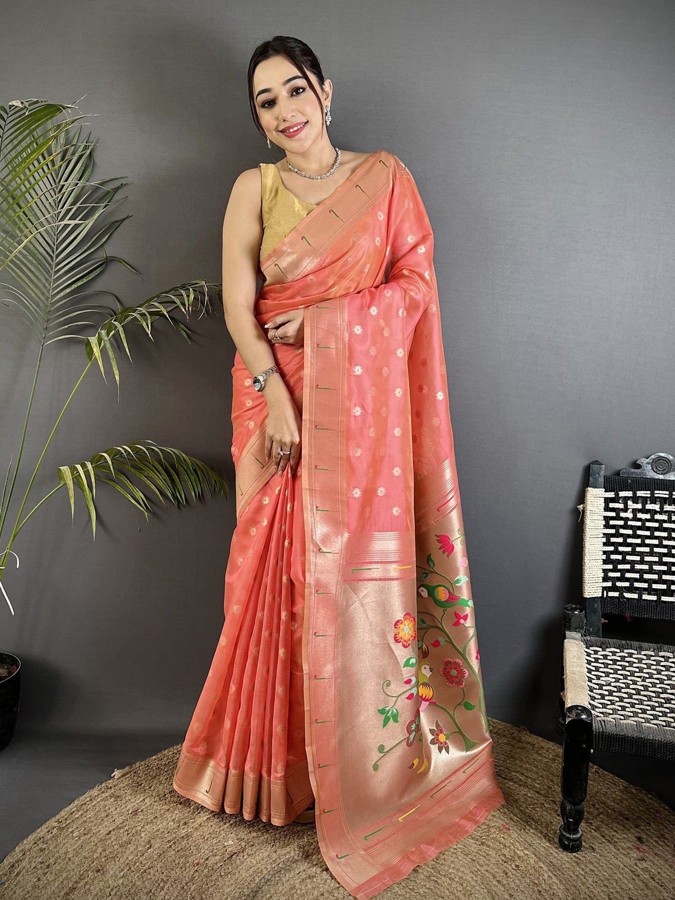 Pink Tissue Parrot & Floral Woven Design Paithani Saree blends classic heritage with a soft festive glow. The smooth tissue fabric shines gently, while woven parrot and floral motifs add rich detail and charm.