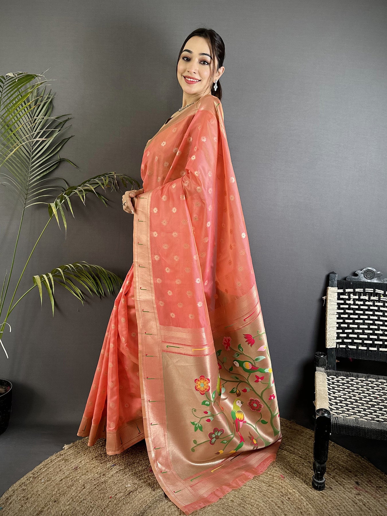 Pink Tissue Parrot & Floral Woven Design Paithani Saree