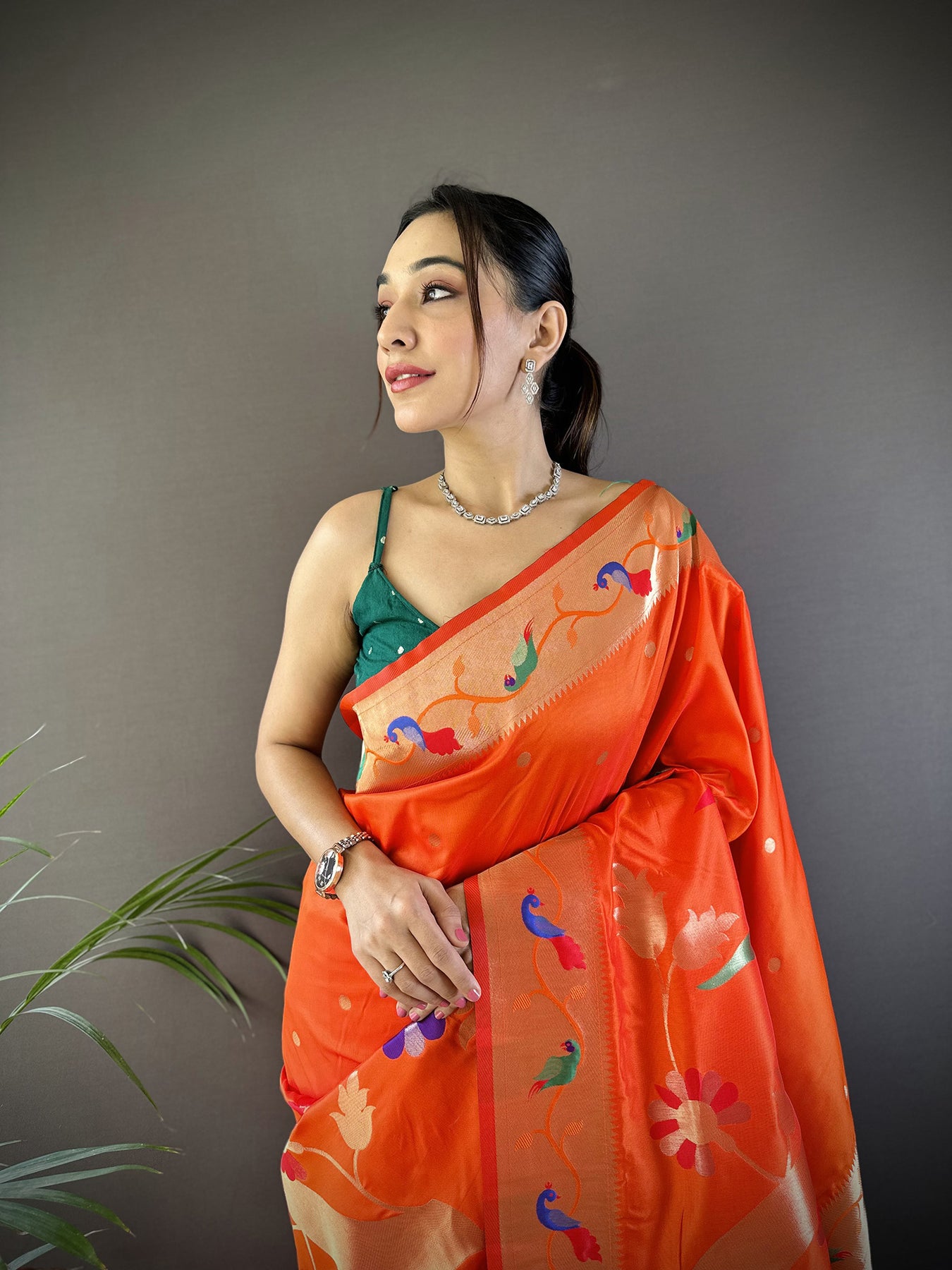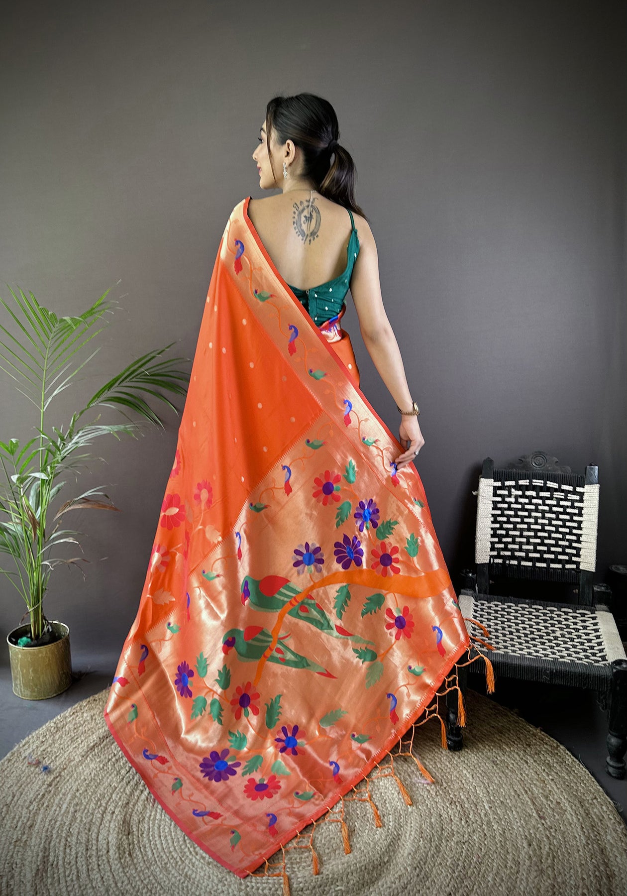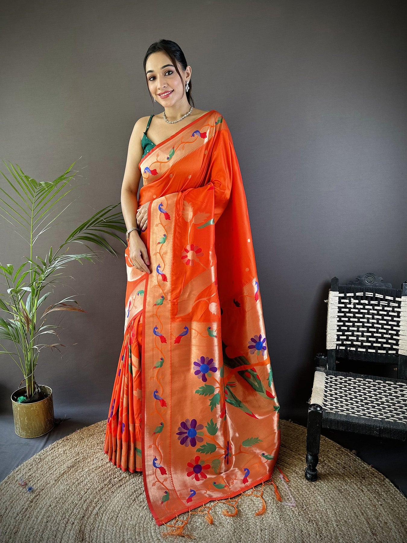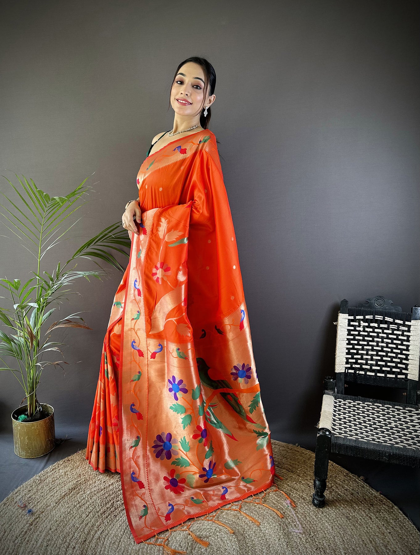 Orange Soft Silk Zari Woven Floral Motifs Paithani Saree