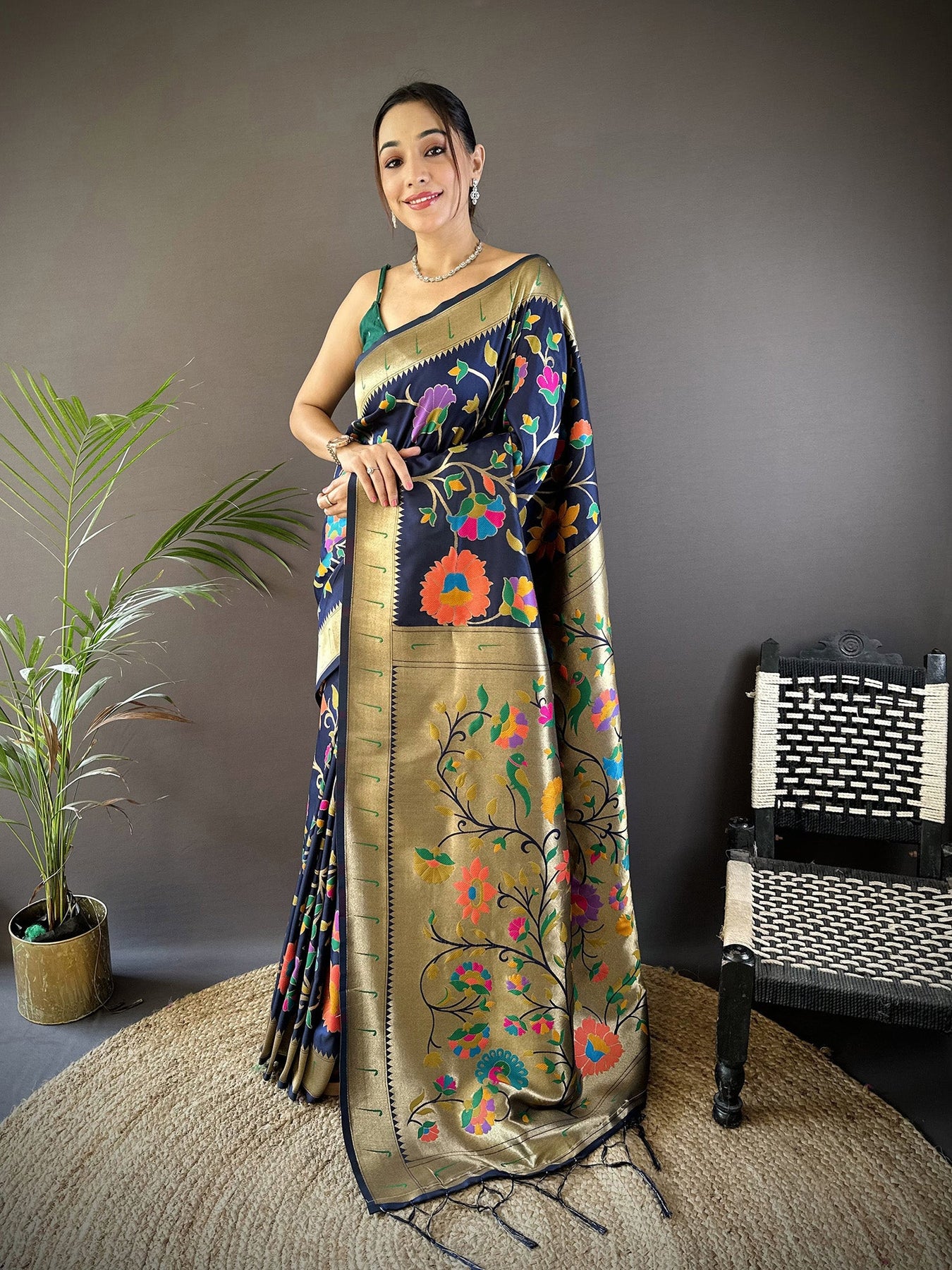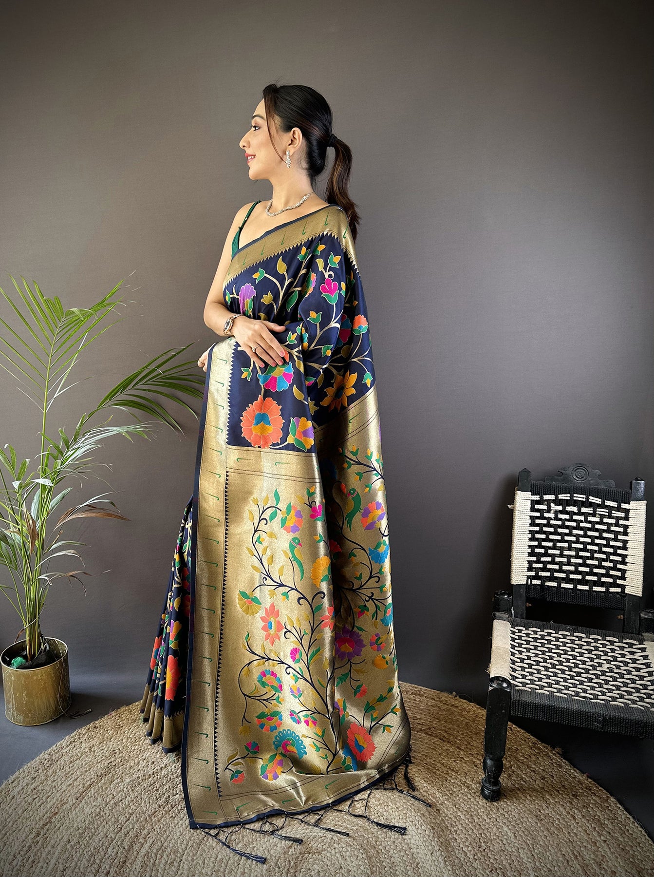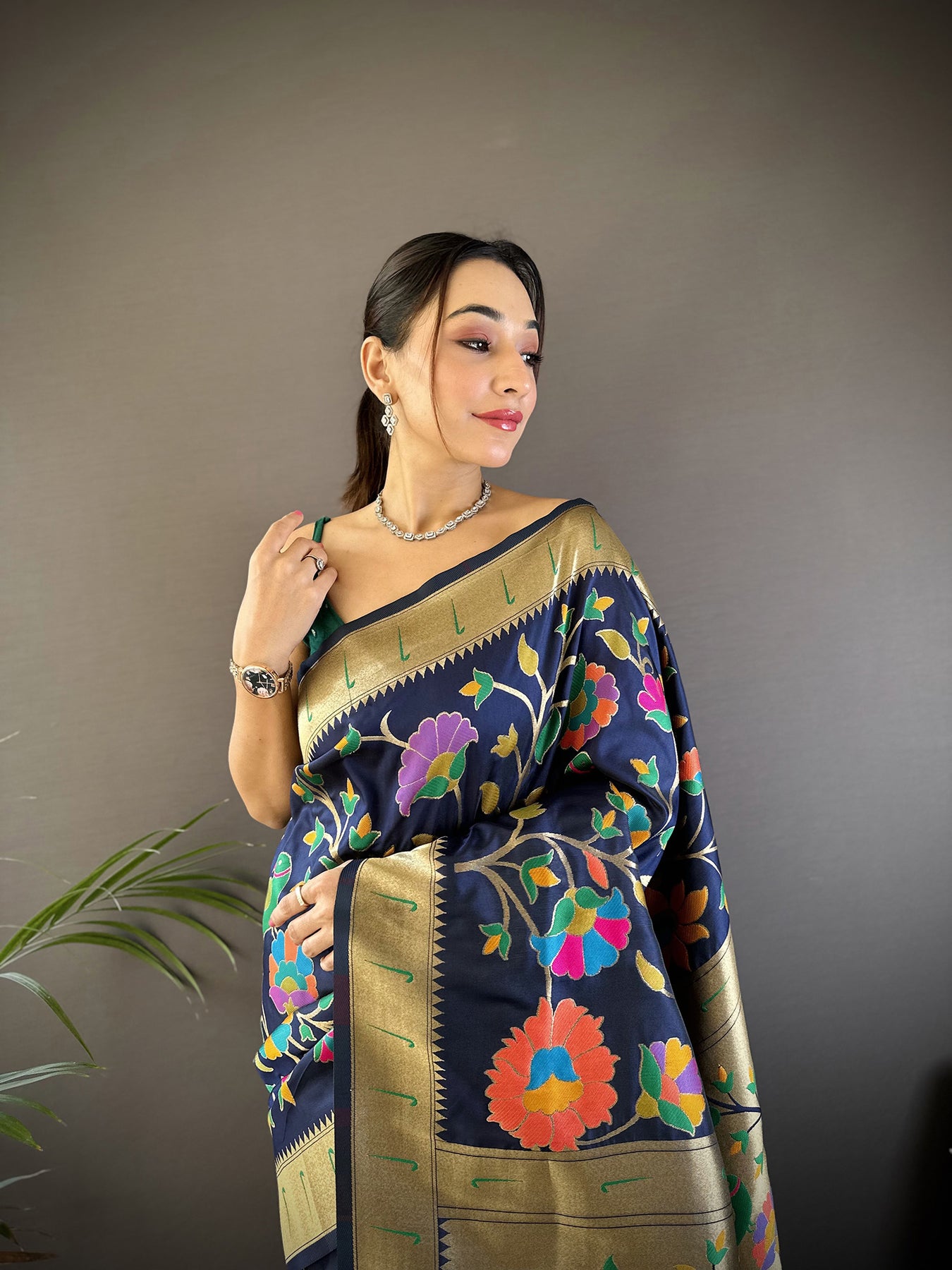 Navy Blue Soft Silk Zari Woven Floral Motifs Paithani Saree