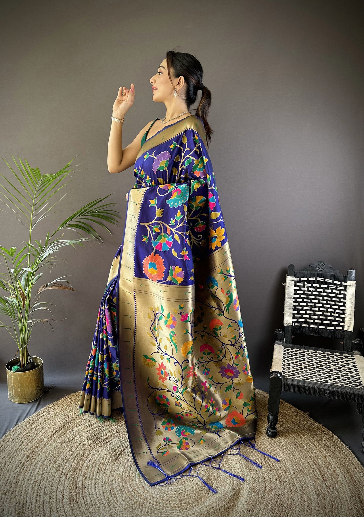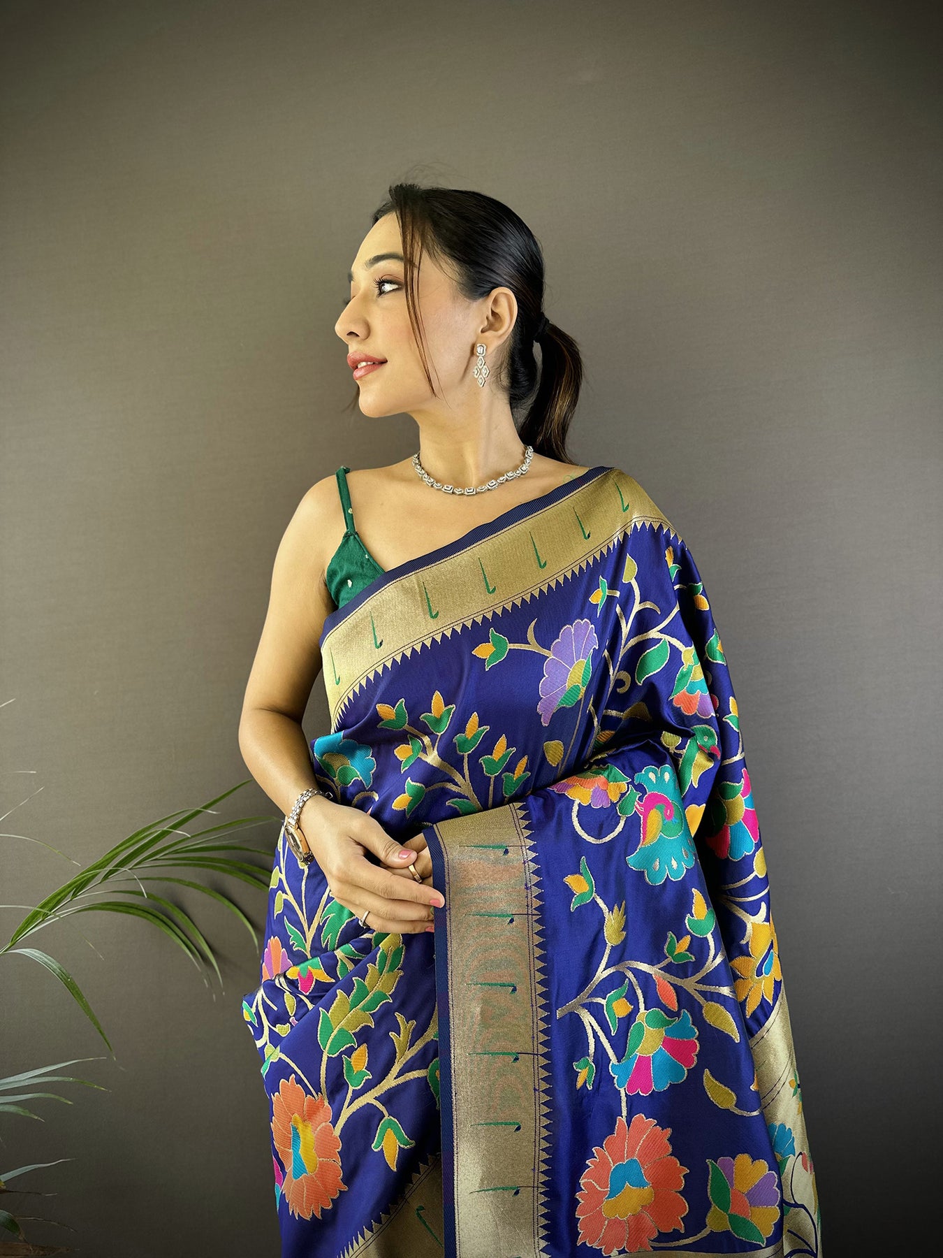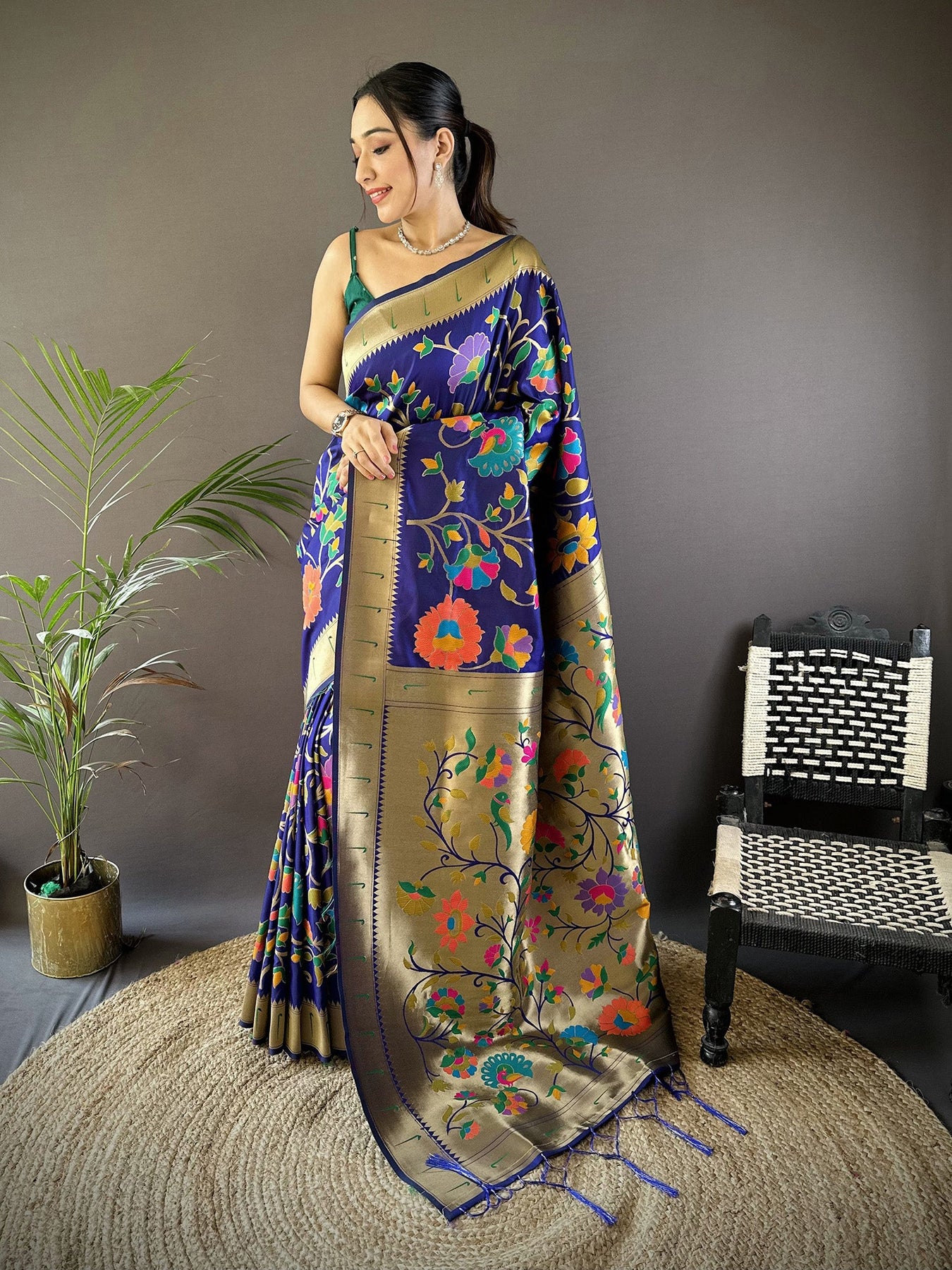 Get this Soft Silk Zari Woven Floral Motifs Paithani Saree Online at Elora Fashion – The best online store for Tussar silk saree, banarasi silk saree, kanjivaram silk saree, paithani silk saree, bandhani saree, patola saree, linen saree and organza saree.