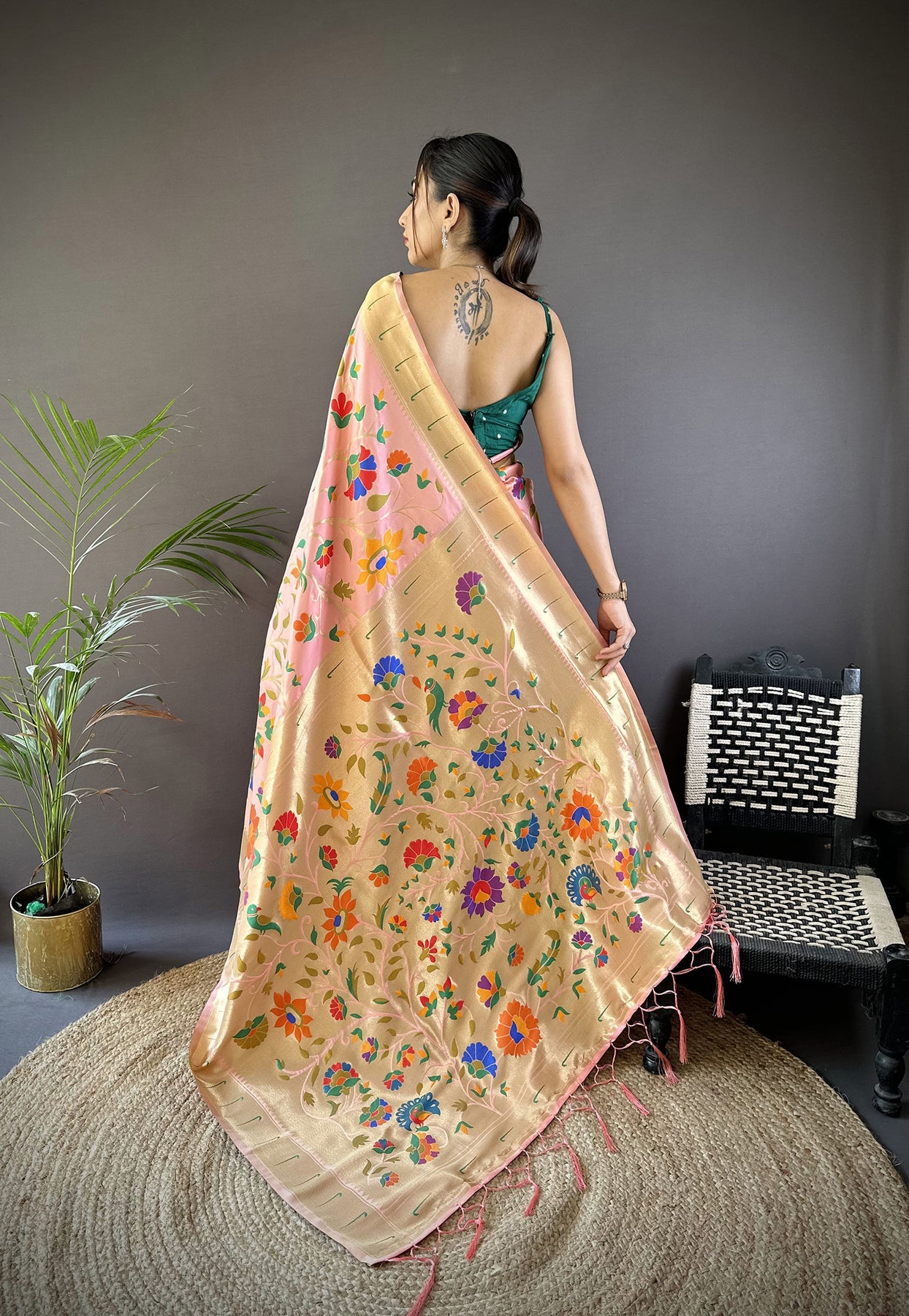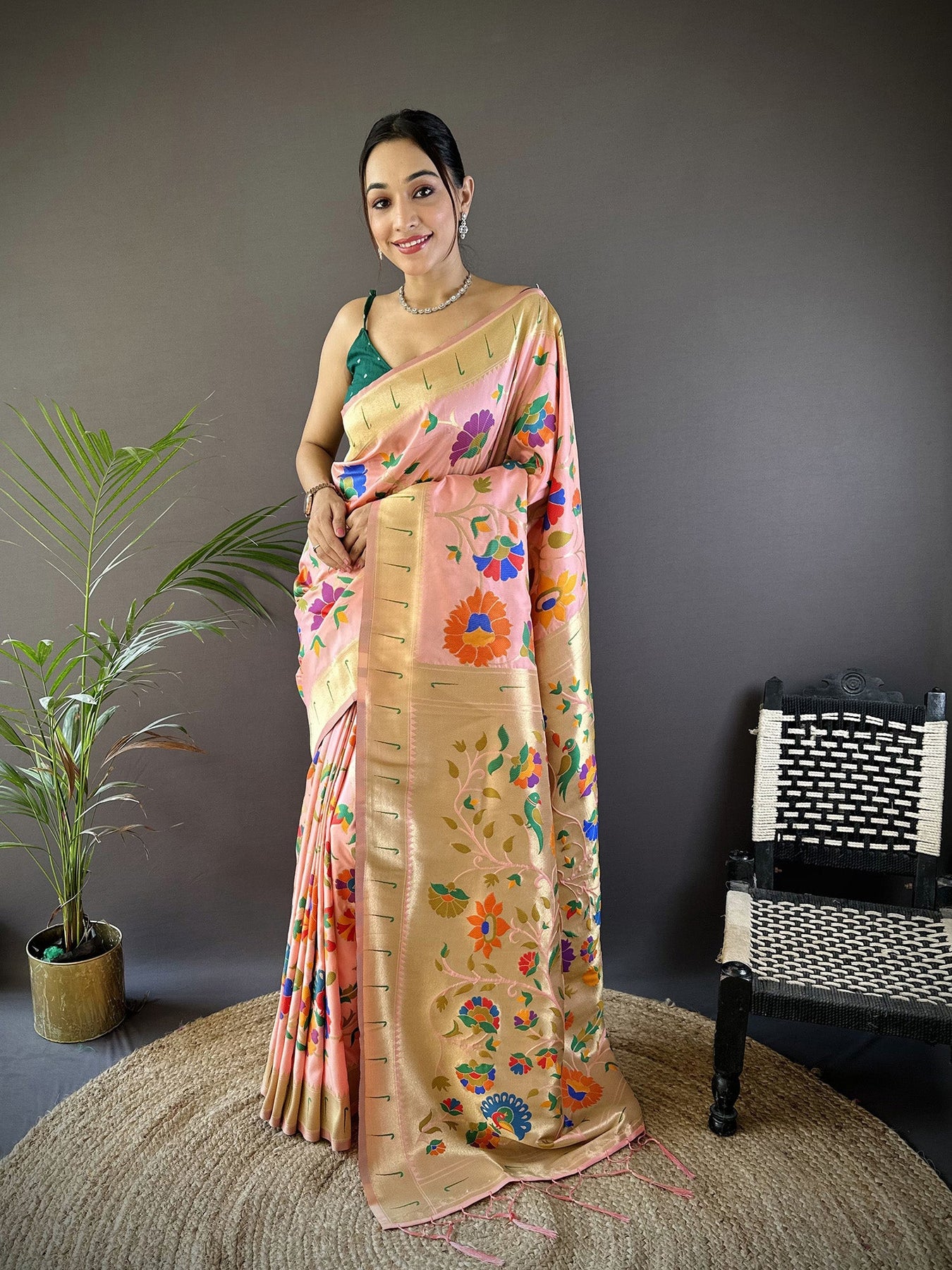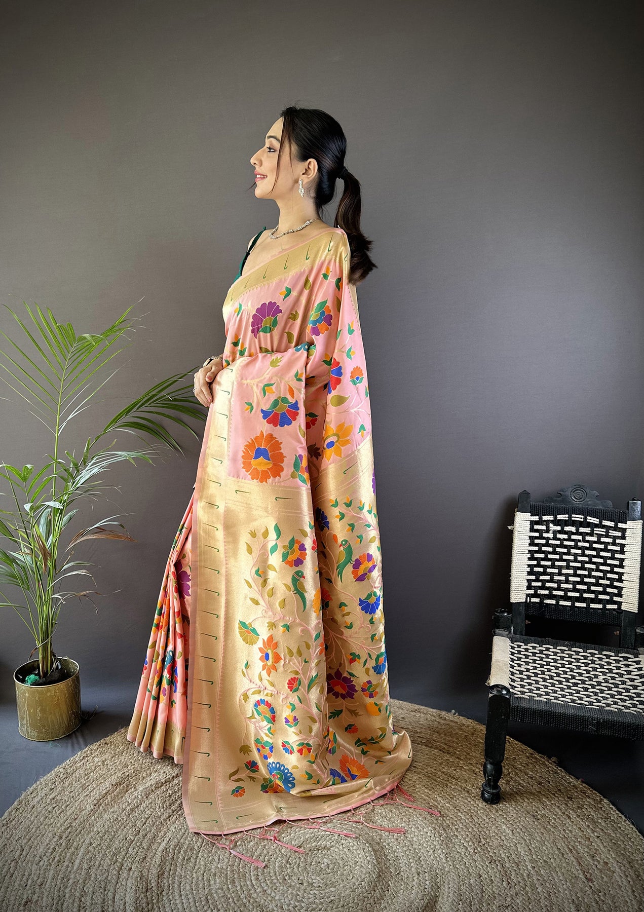 Peach Soft Silk Zari Woven Floral Motifs Paithani Saree