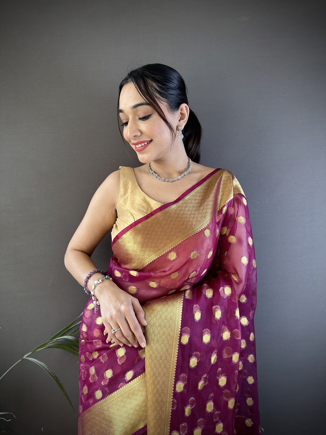 Magenta Organza Silk Polka Dot Zari Weaving Banarasi Saree