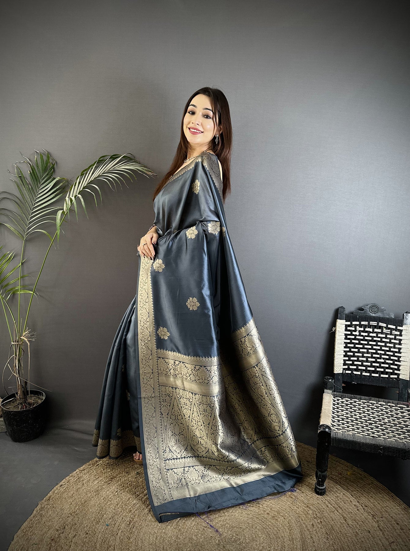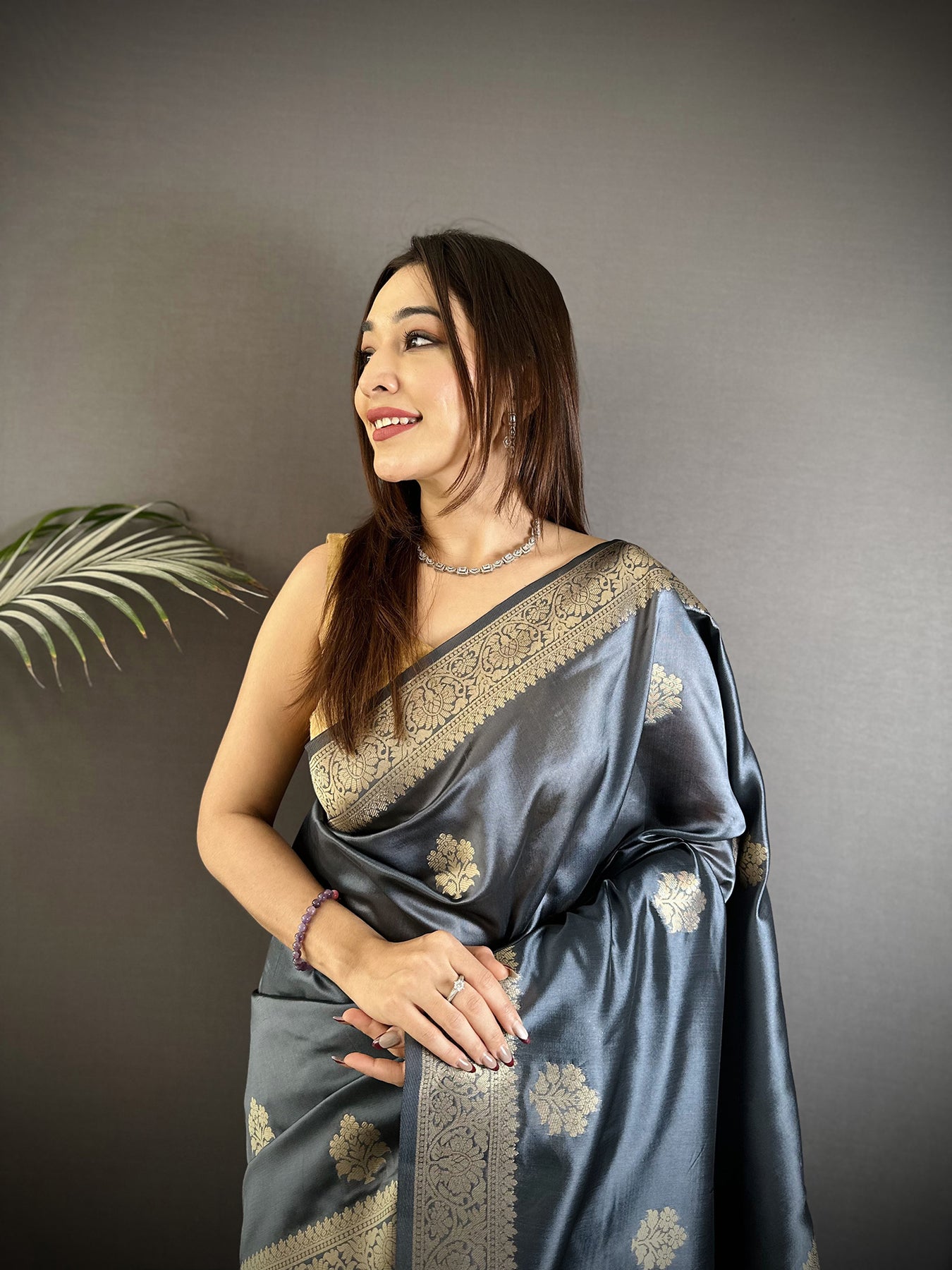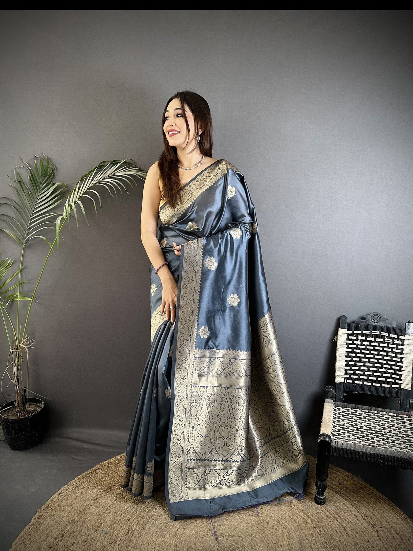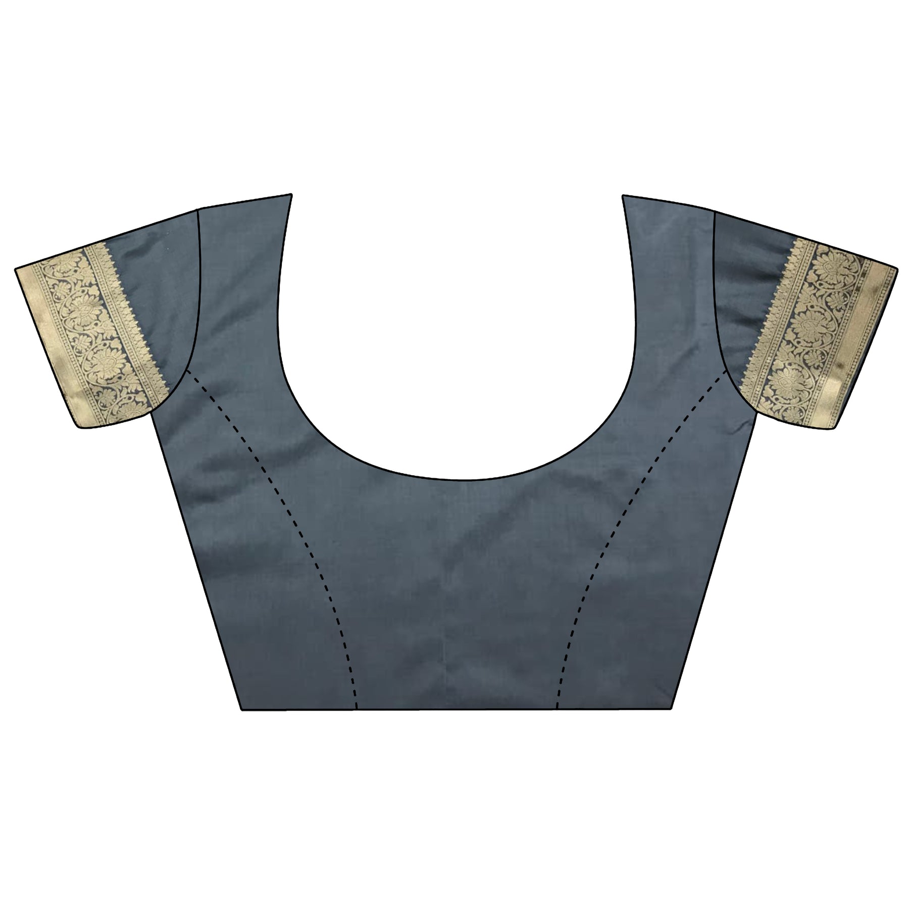 Grey Cotton Silk Floral Jacquard Zari Woven Banarasi Saree
