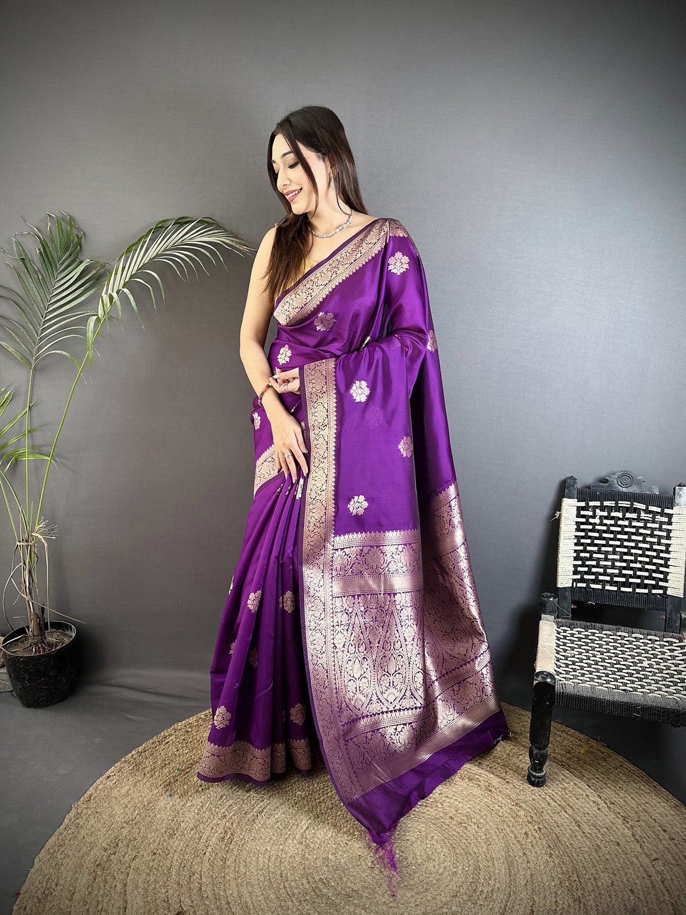 Purple Cotton Silk Floral Jacquard Zari Woven Banarasi Saree