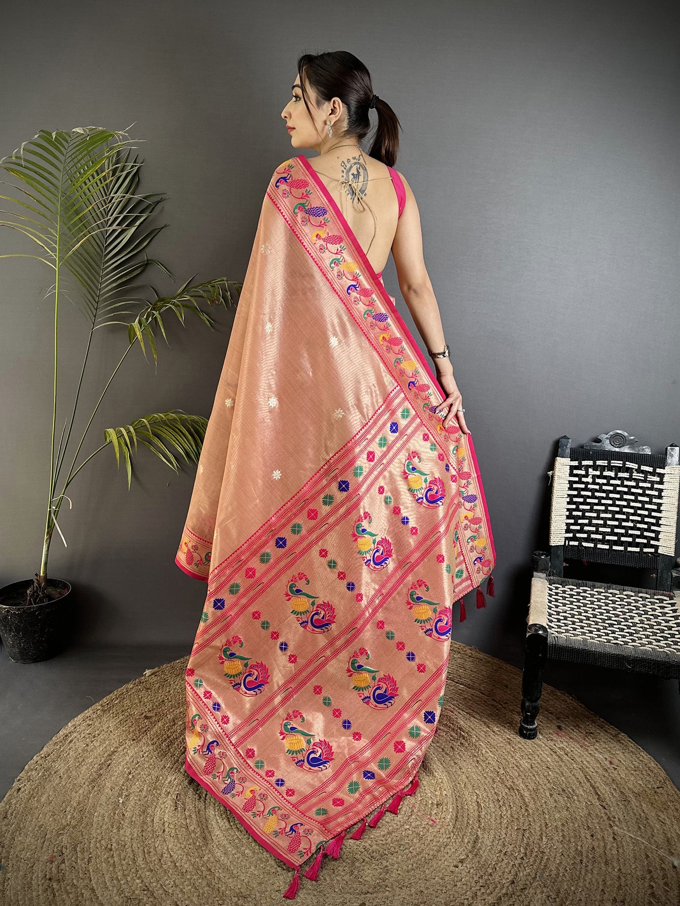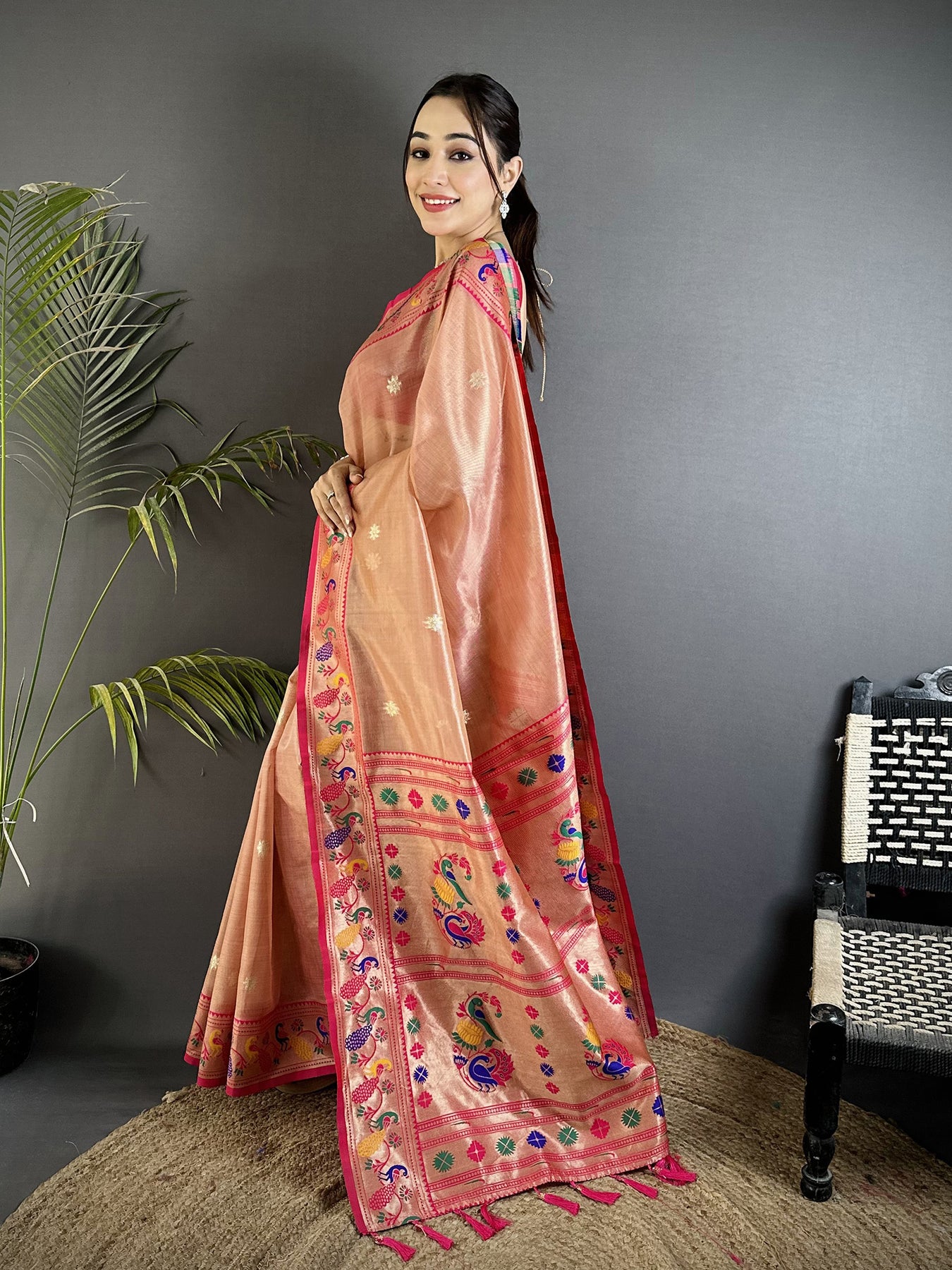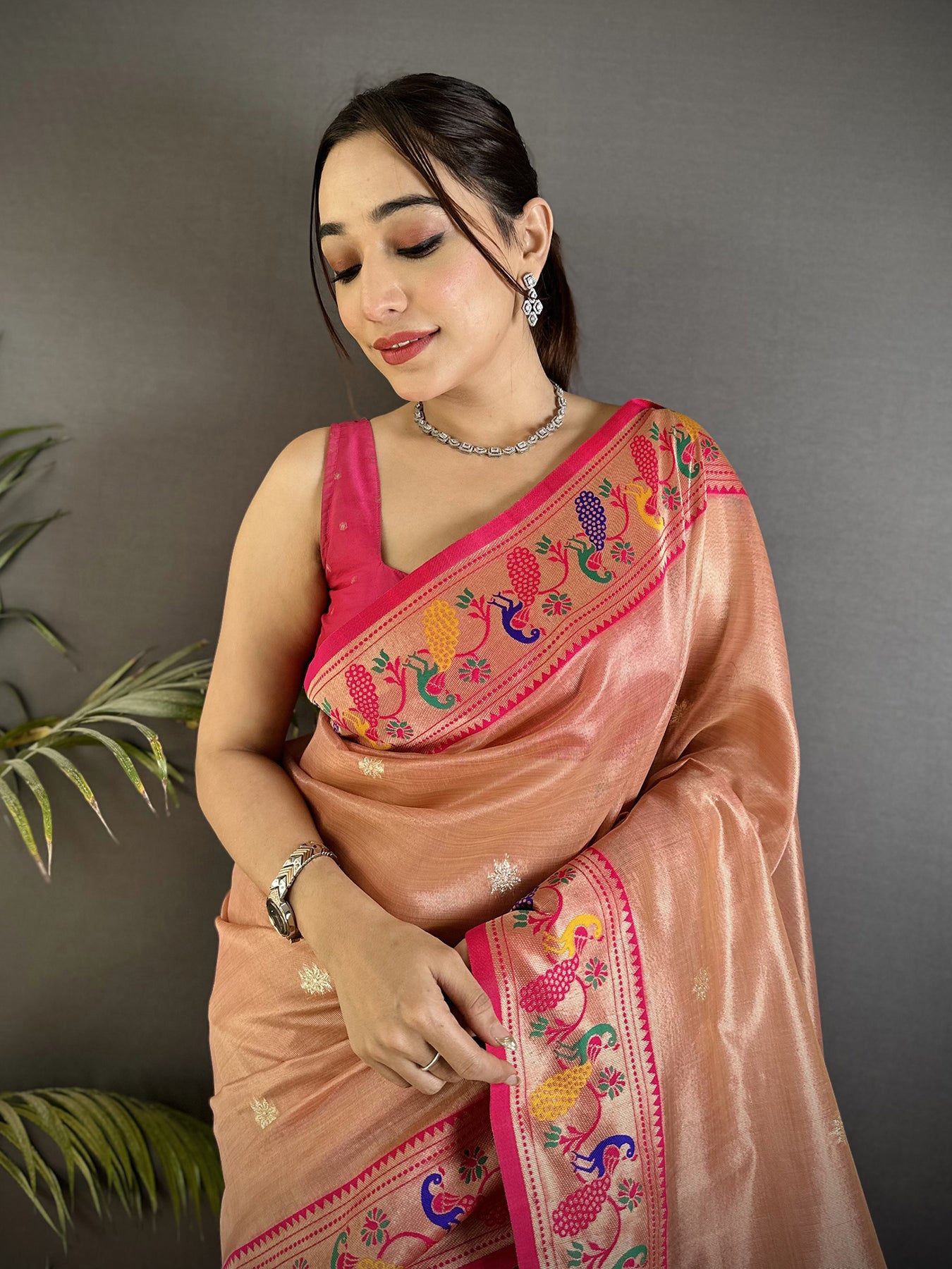 Dark Peach Tissue Zari Weaving Minakari Work Paithani Saree With Mor Border