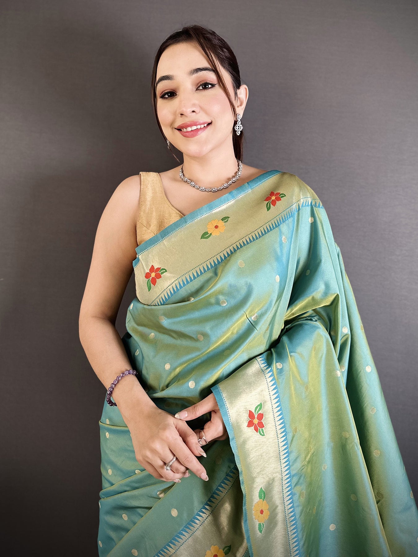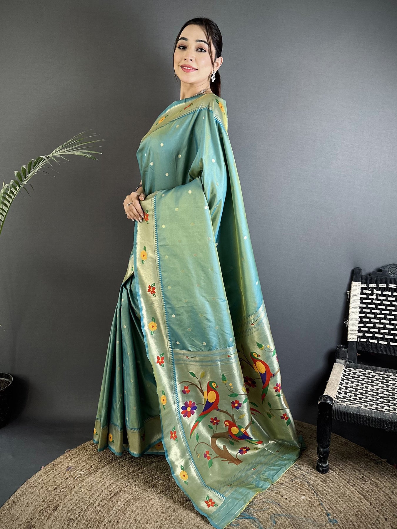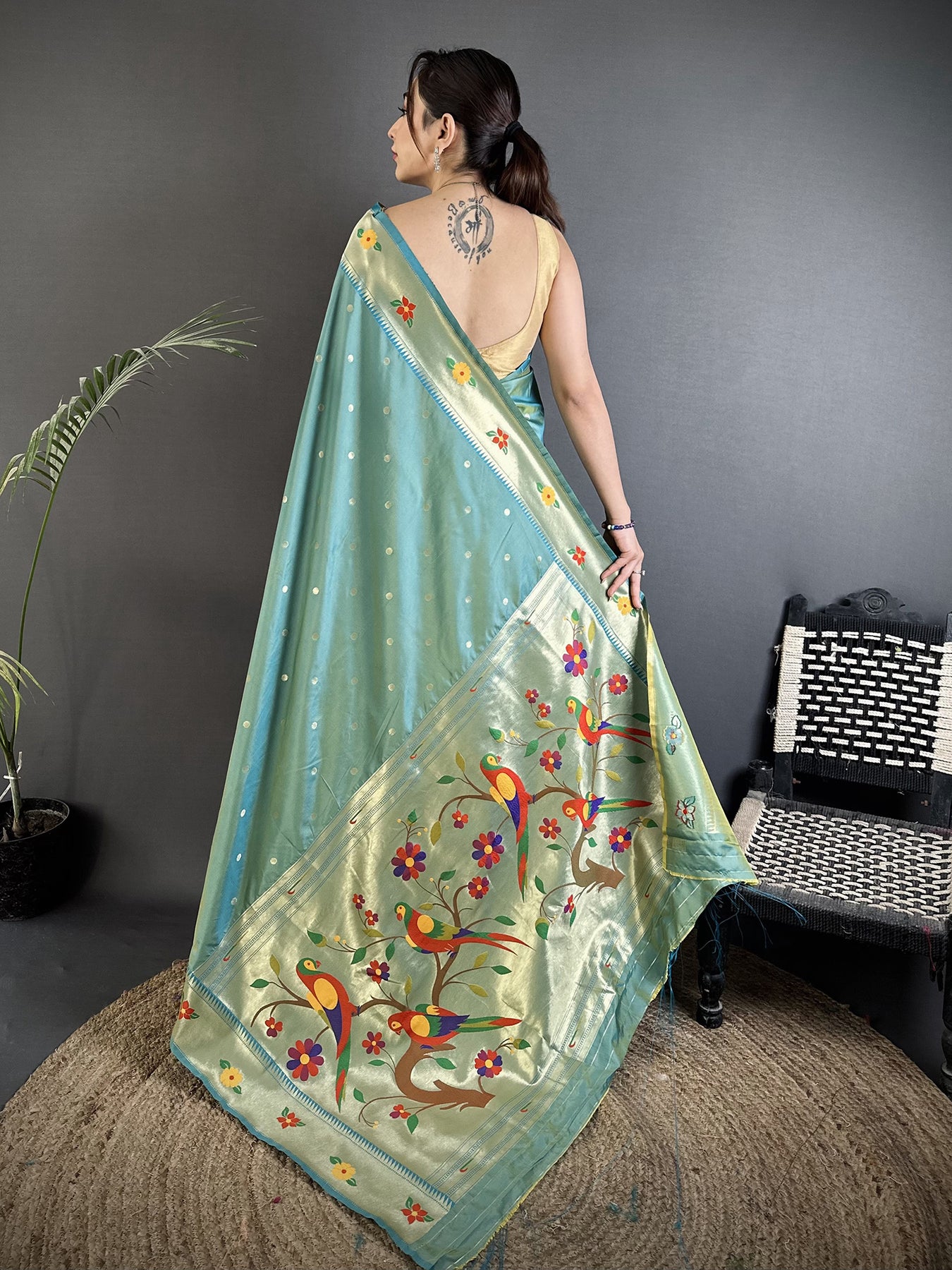 aqua blue Lichi Silk Parrot & Floral Woven Design Zari Weaving Paithani Saree