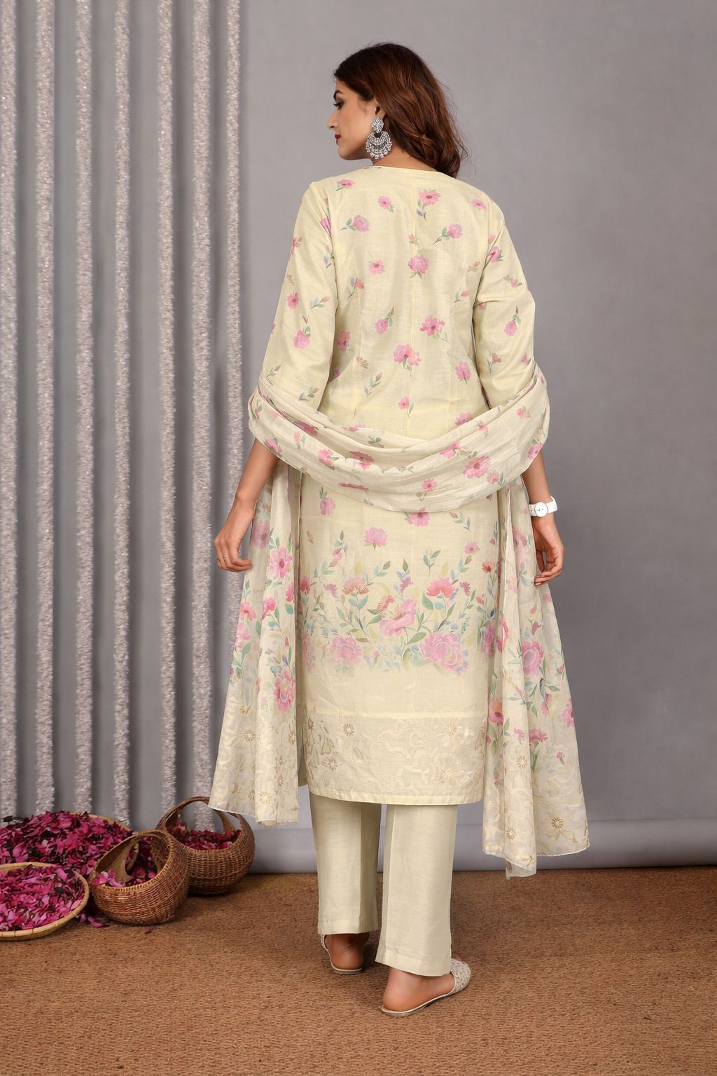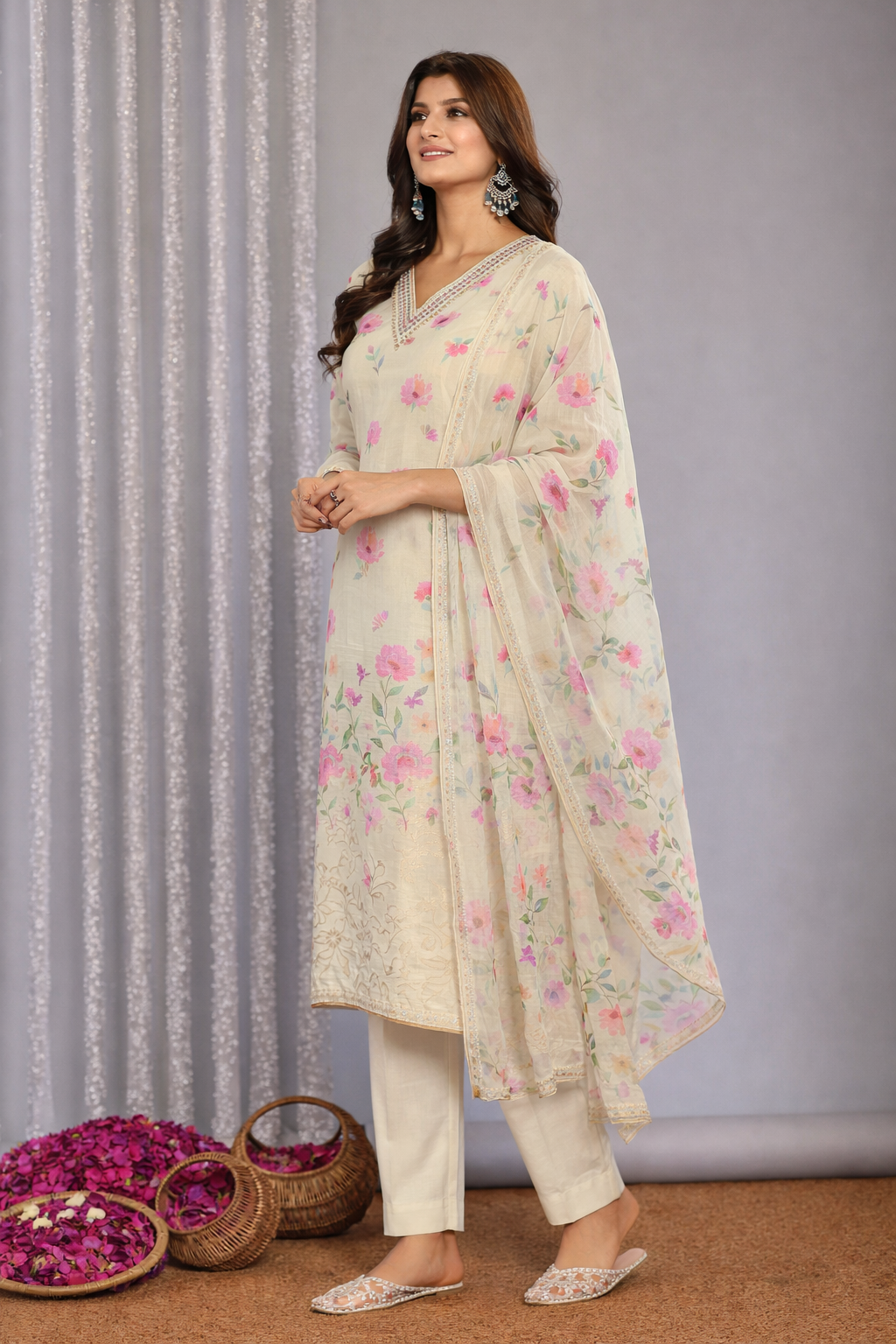 Graceful floral print kurta set and a refined V neckline design add modern charm while keeping a traditional feel. The smooth Chanderi fabric ethnic wear feels gentle on skin and keeps you relaxed through long hours and warm days.