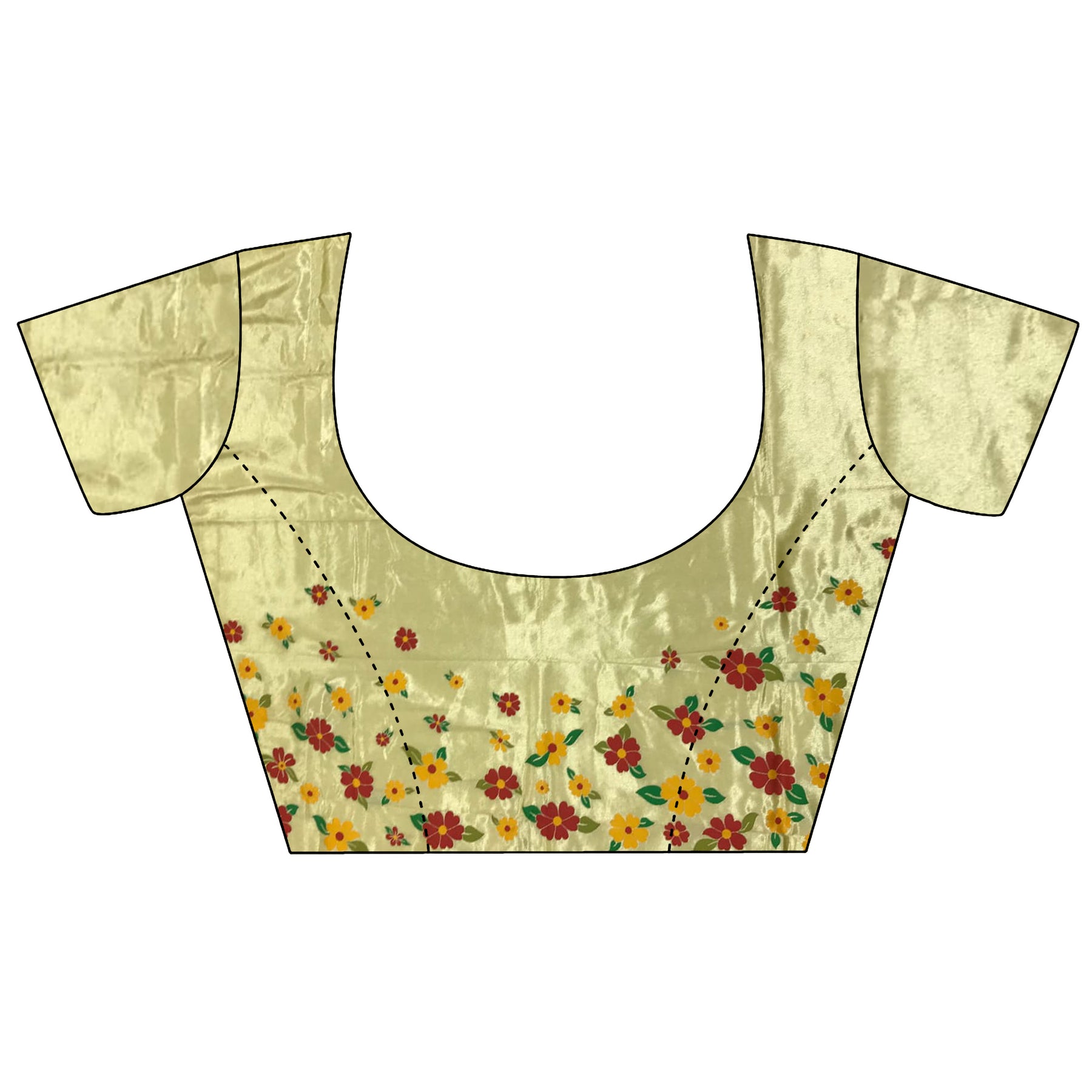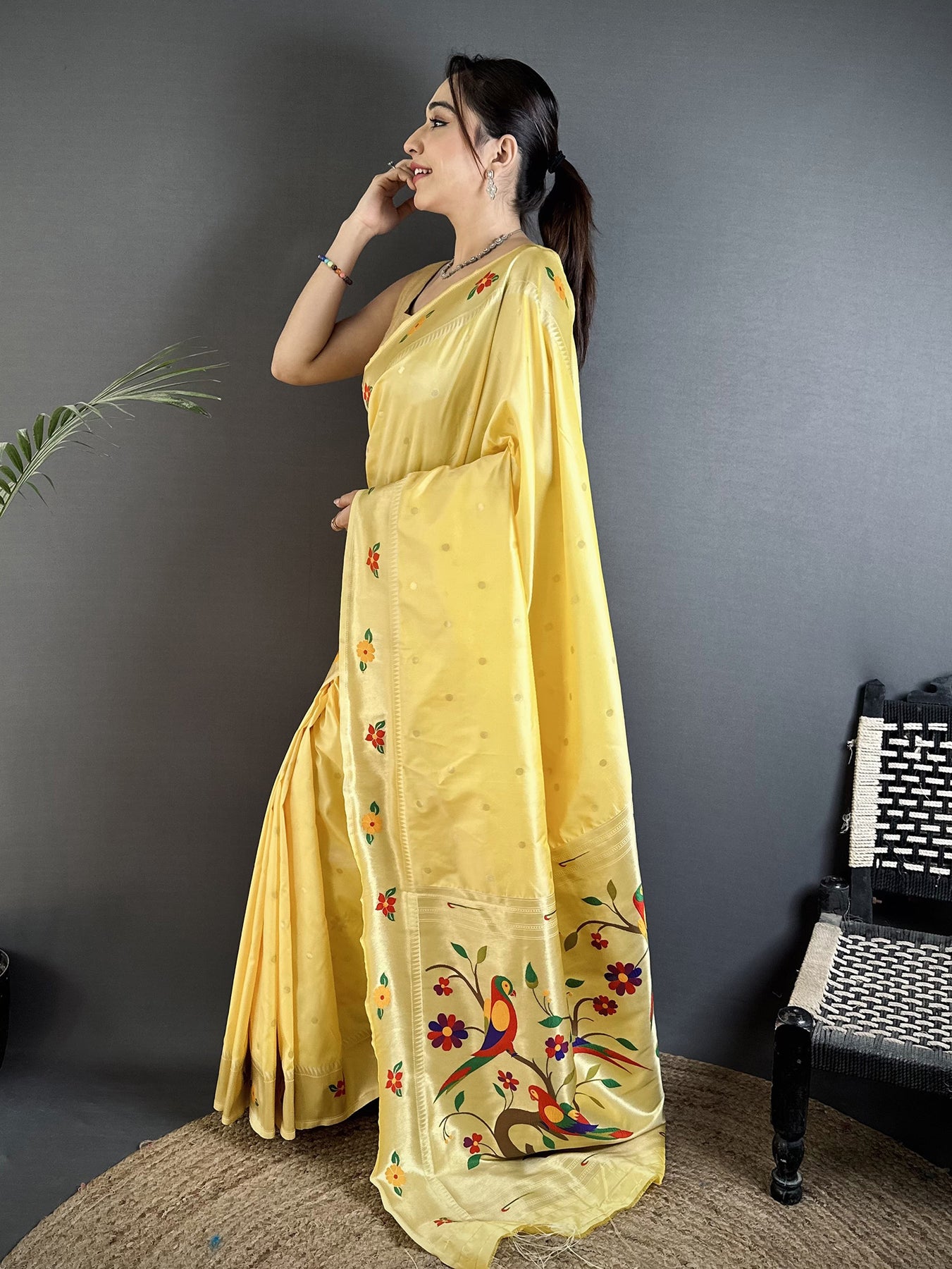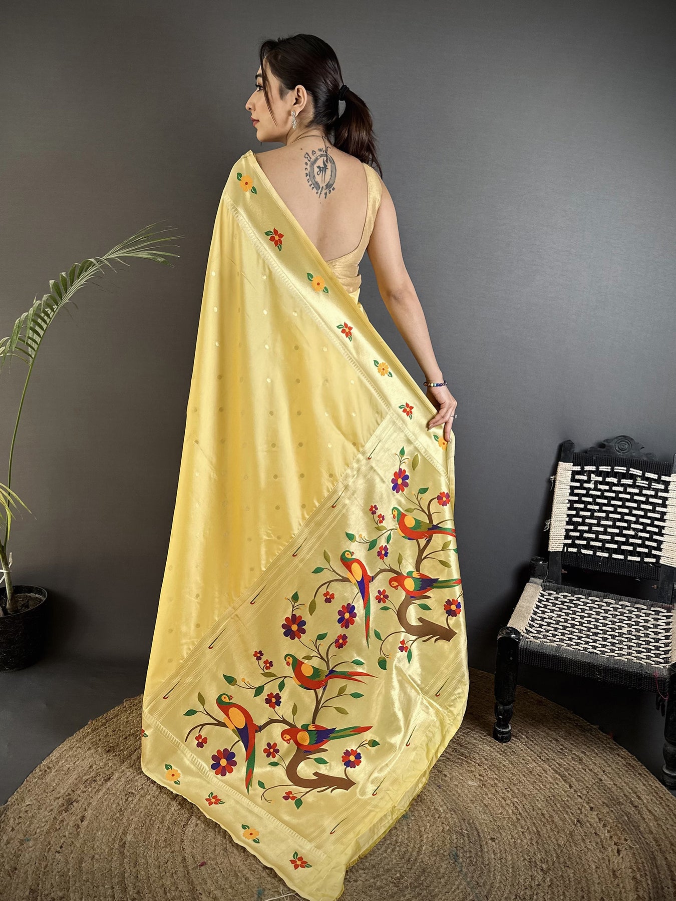Light Yellow Lichi Silk Parrot & Floral Woven Design Zari Weaving Paithani Saree