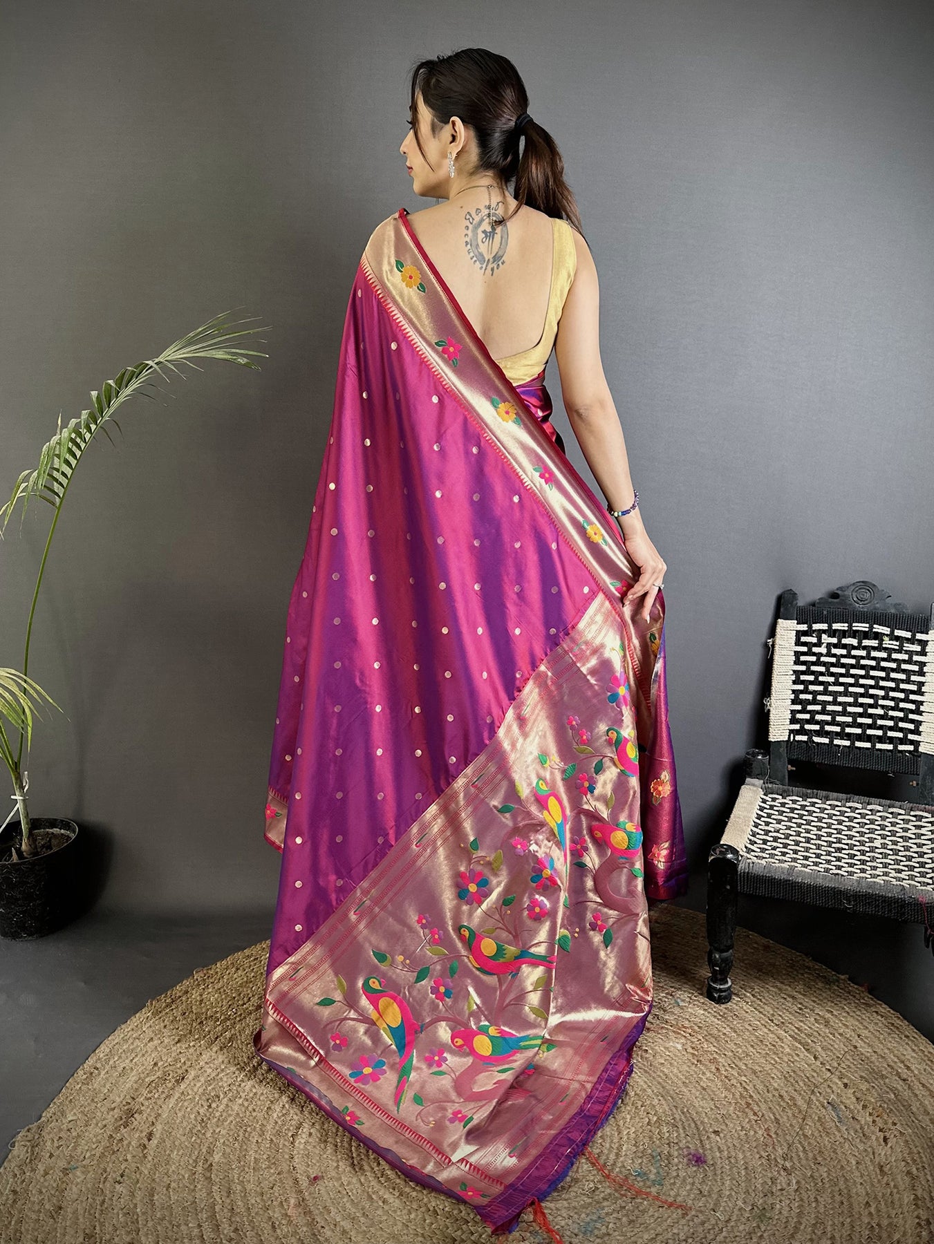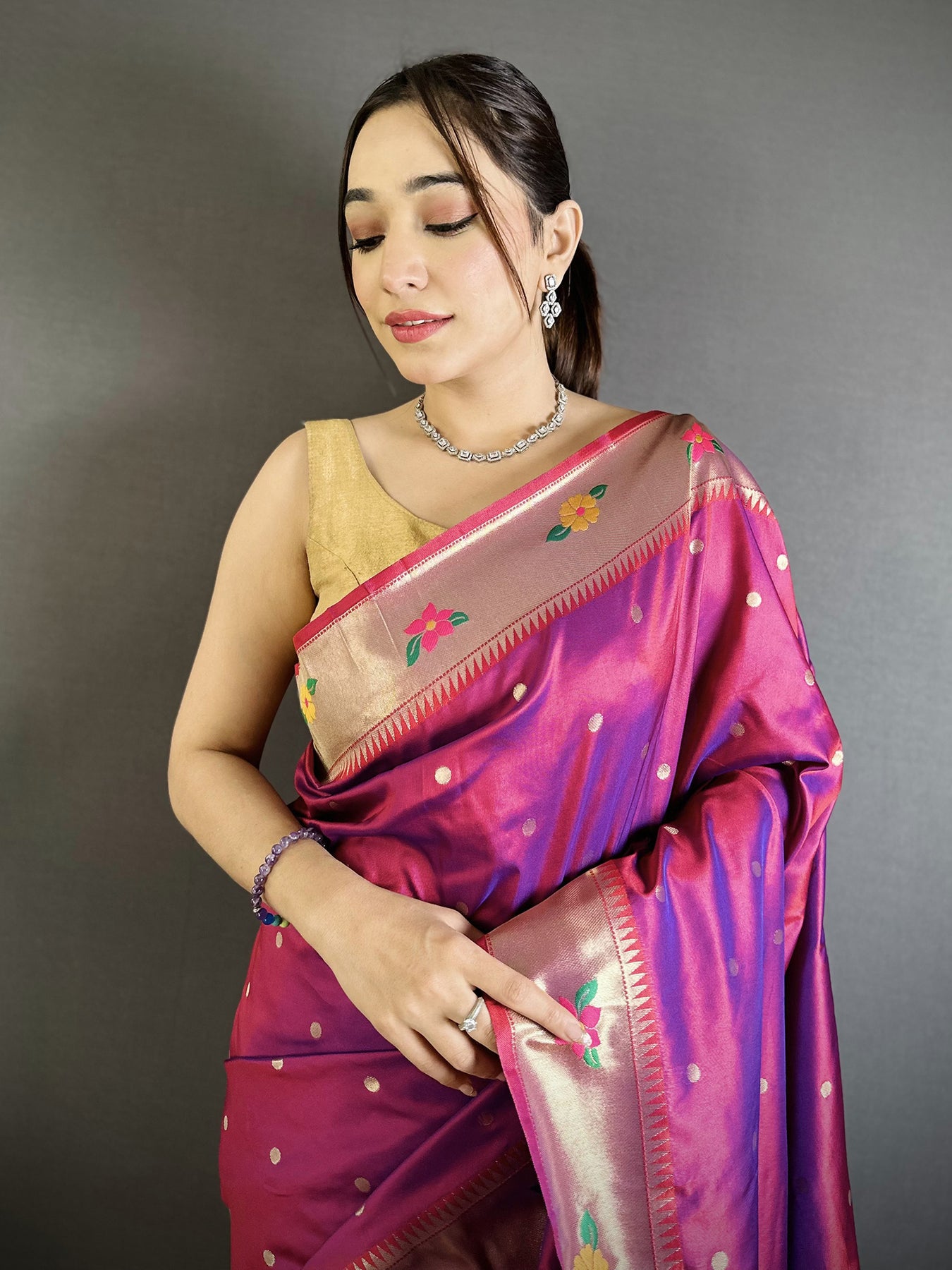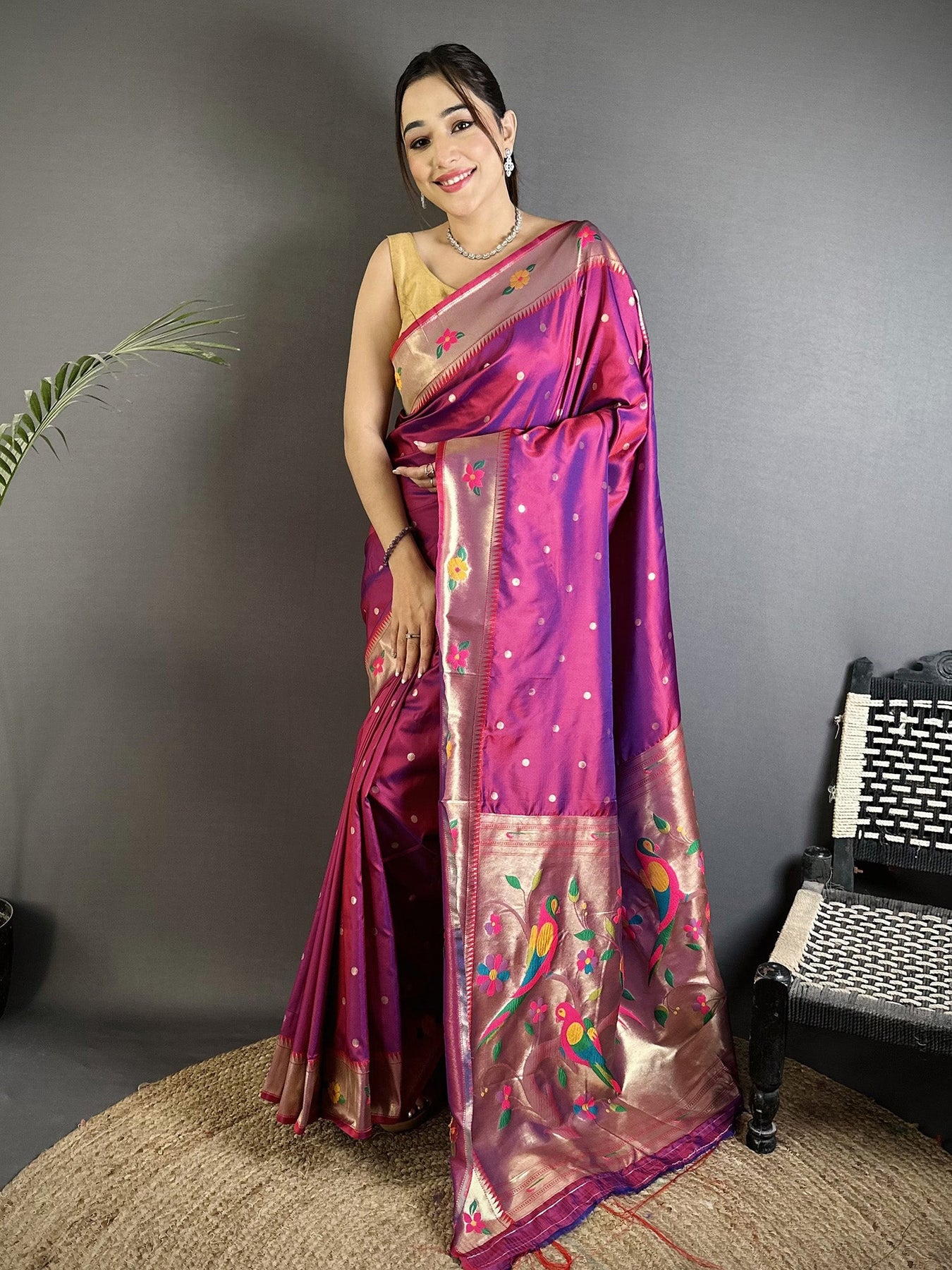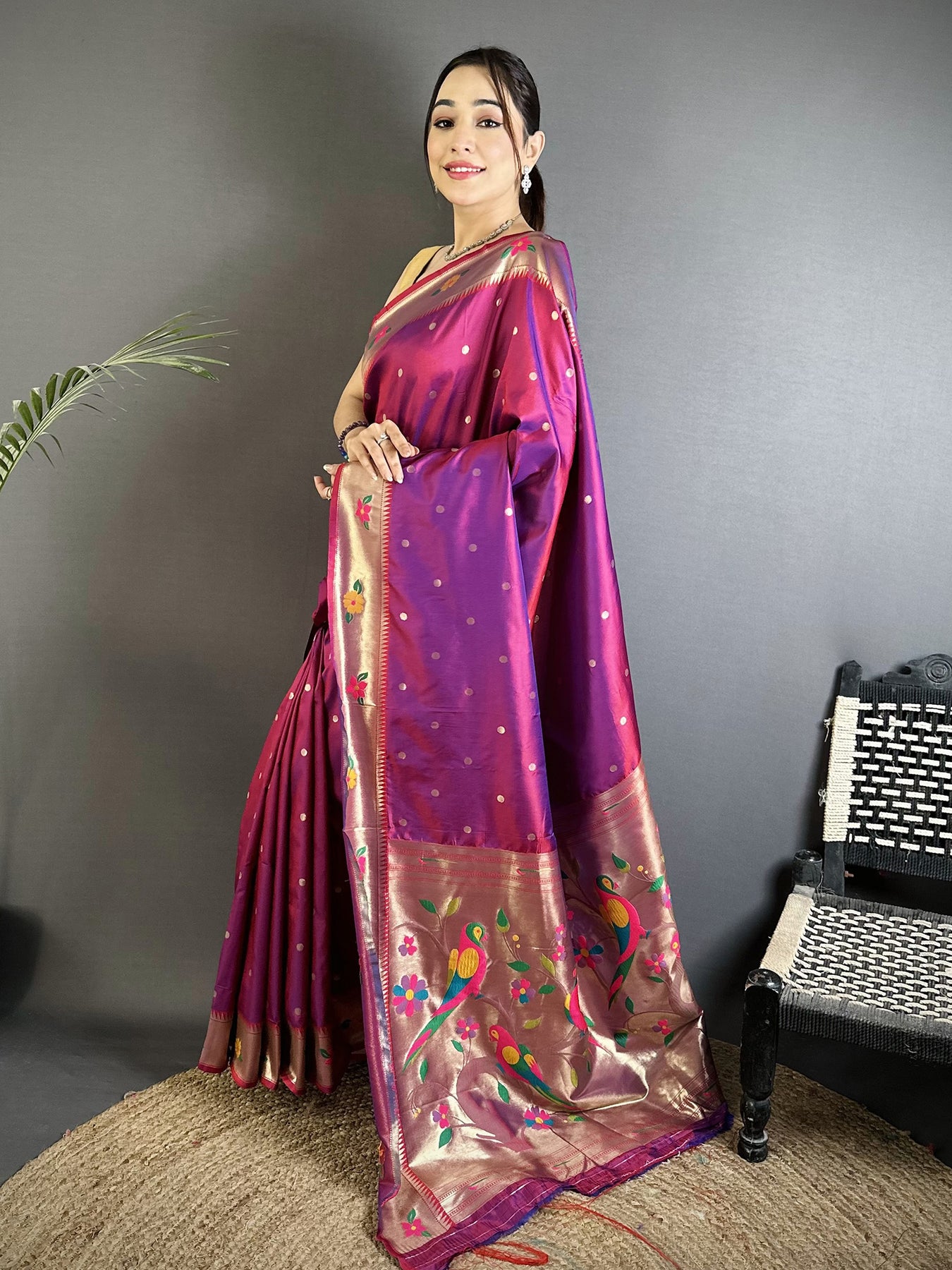 Experience the charm of this Magenta Lichi Silk Paithani Saree, featuring exquisite parrot and floral woven zari designs. Perfect for weddings, festivals, and traditional celebrations.