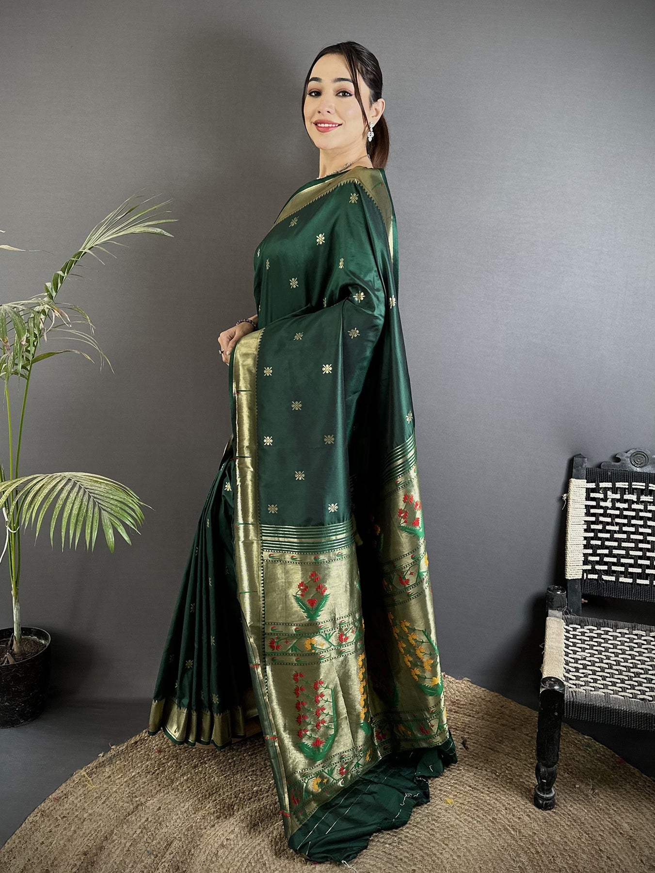 Green Lichi Silk Floral Ikkat Motifs Zari weaving Paithani Saree