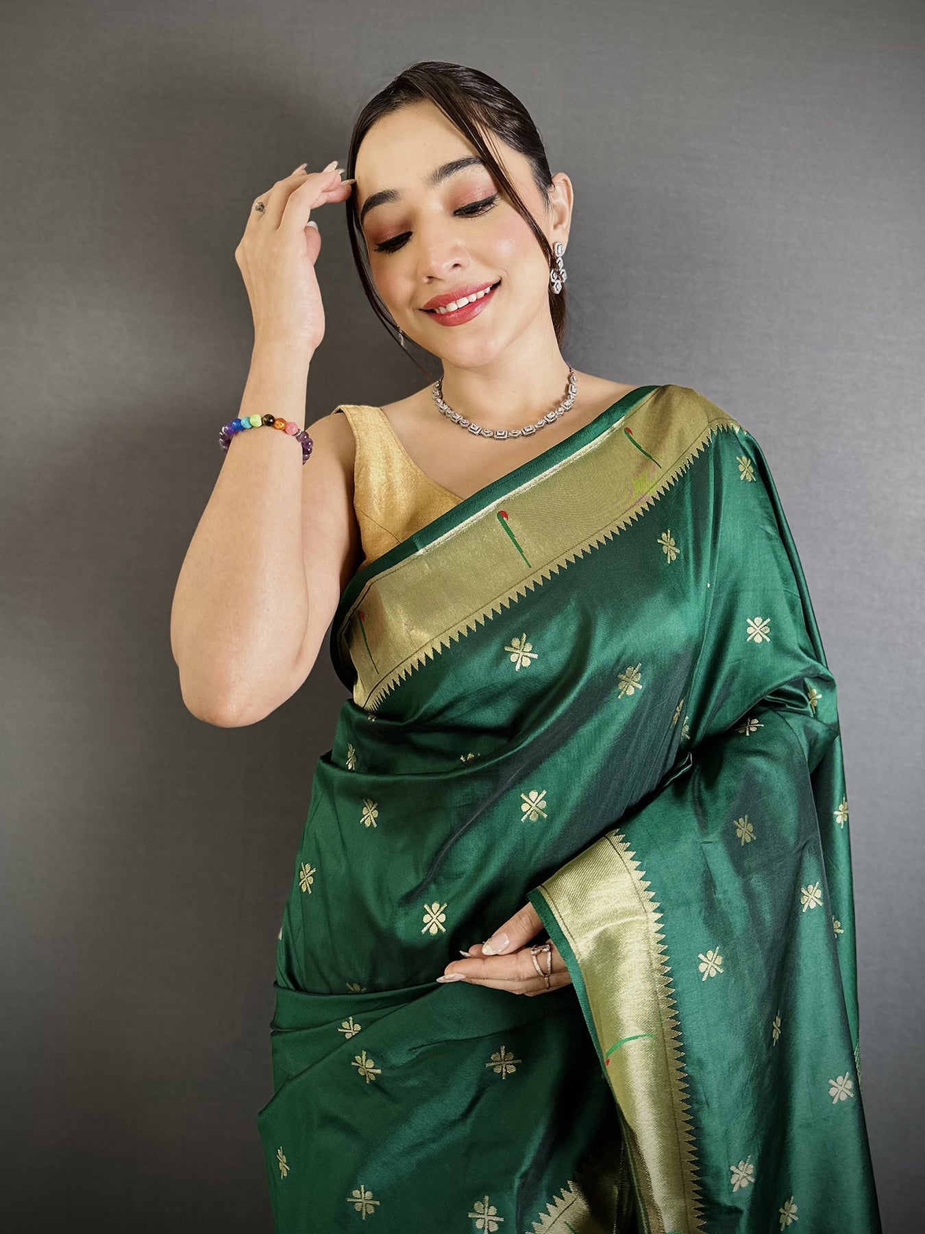 Experience the elegance of this Green Lichi Silk Paithani Saree, adorned with intricate Floral Ikkat motifs. The luxurious fabric and vibrant color make it perfect for weddings, festivals, and special occasions.Handwoven with precision, this saree features shimmering Zari weaving that highlights the delicate floral patterns. Its rich texture and graceful drape make it a timeless addition to any ethnic wardrobe.Celebrate tradition with this Green Paithani Saree that blends artistry and luxury. Lightweight yet durable, it offers comfort while maintaining a regal, elegant look for festive and ceremonial wear.