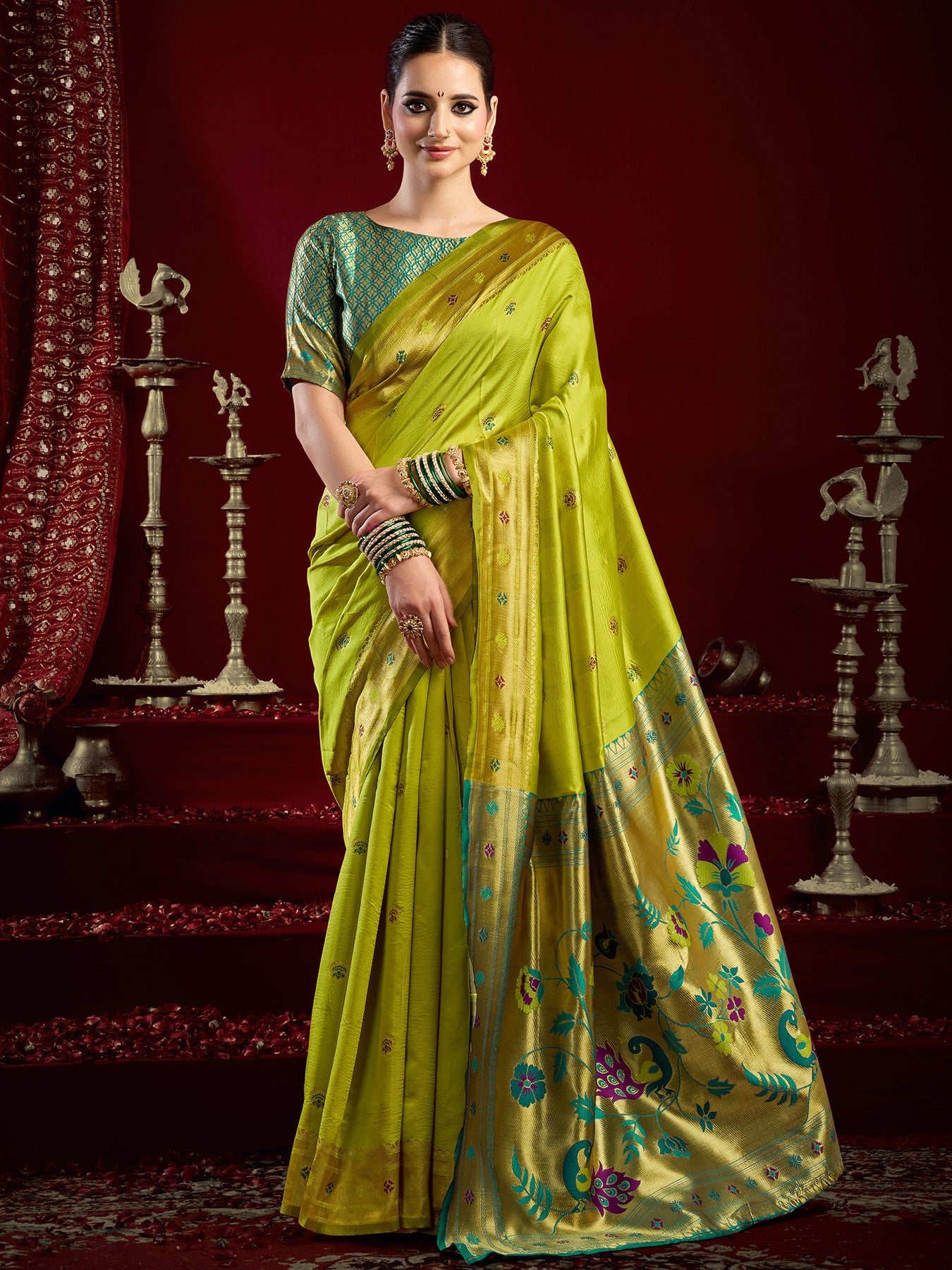 Mustard Green Silk Blend Butti Weaving Paithani Saree