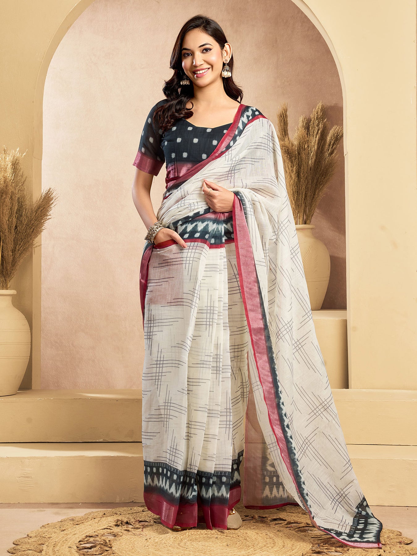Off White Linen Striped Printed Ready to Wear Saree With Pocket