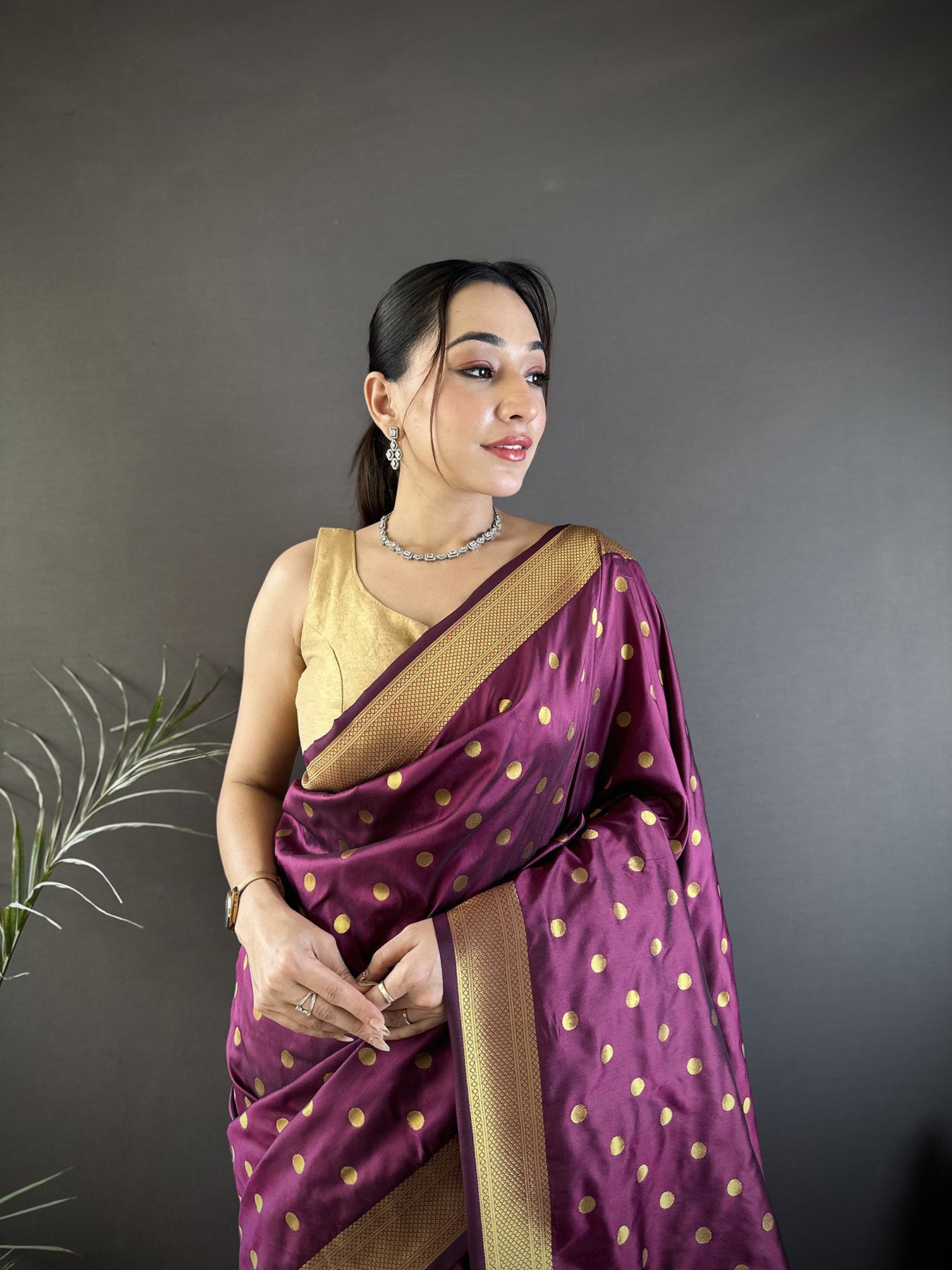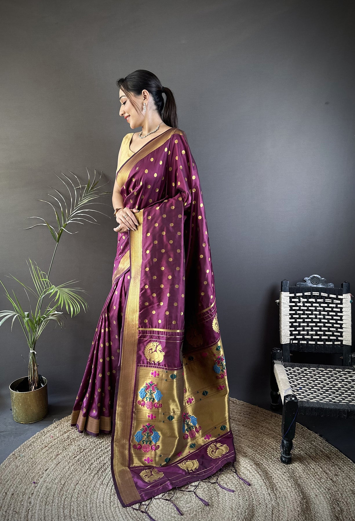 Wine Lichi Silk Peacock & Floral Motis Zari Weaving Paithani Saree