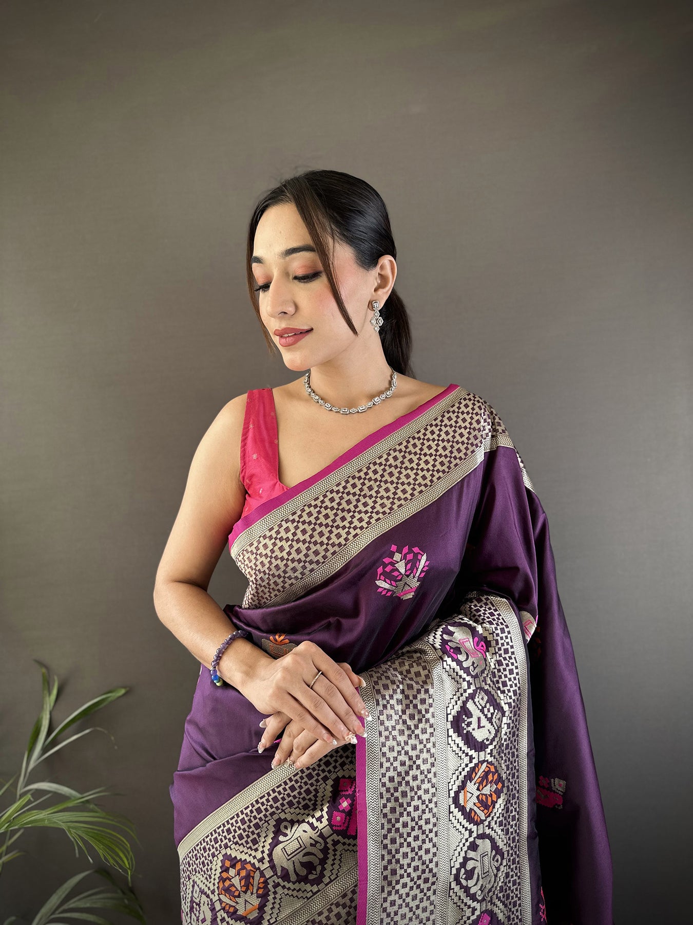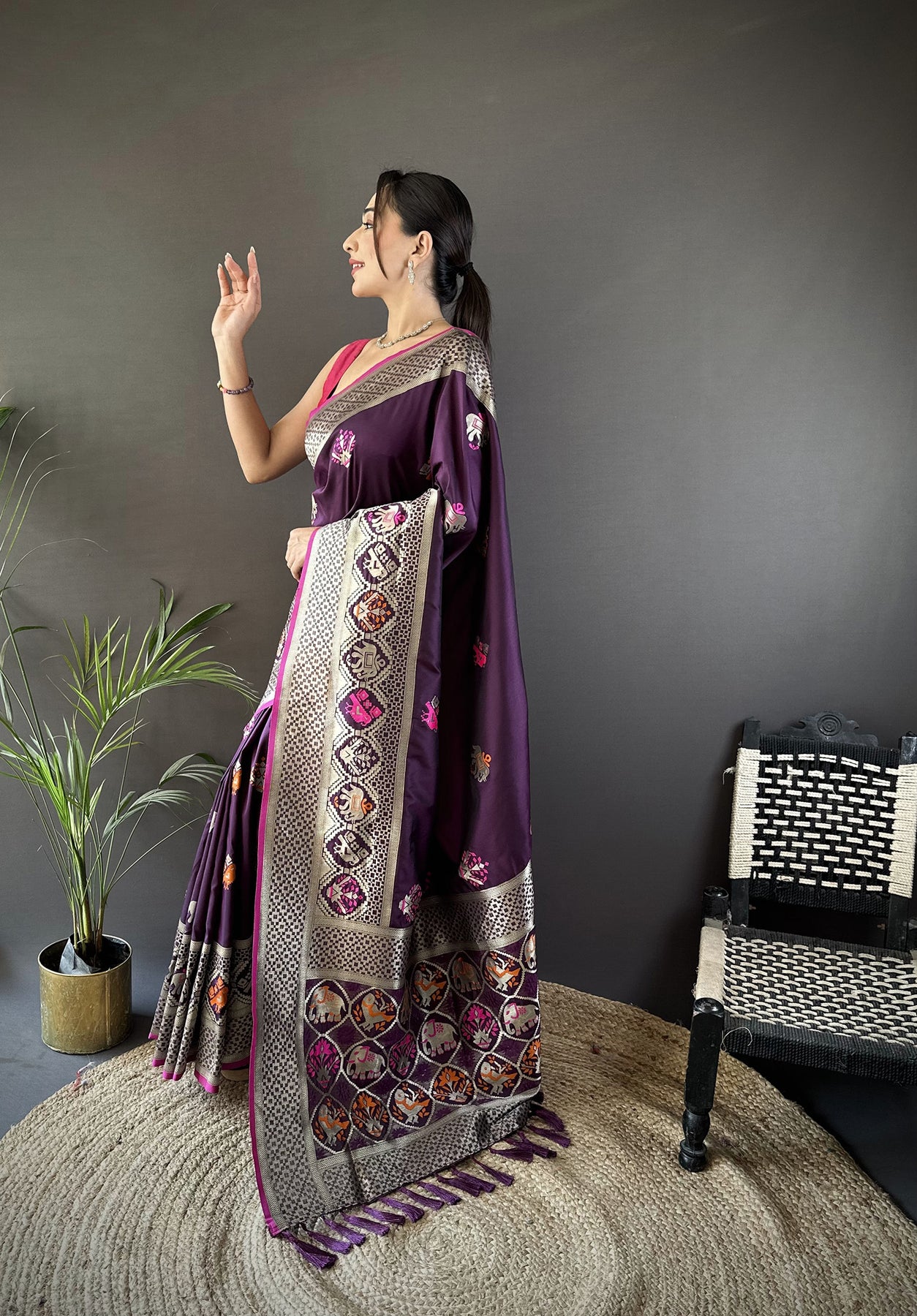 Wine Soft Lichi Silk Elephant & Floral Motifs Minakari Work Banarasi Saree