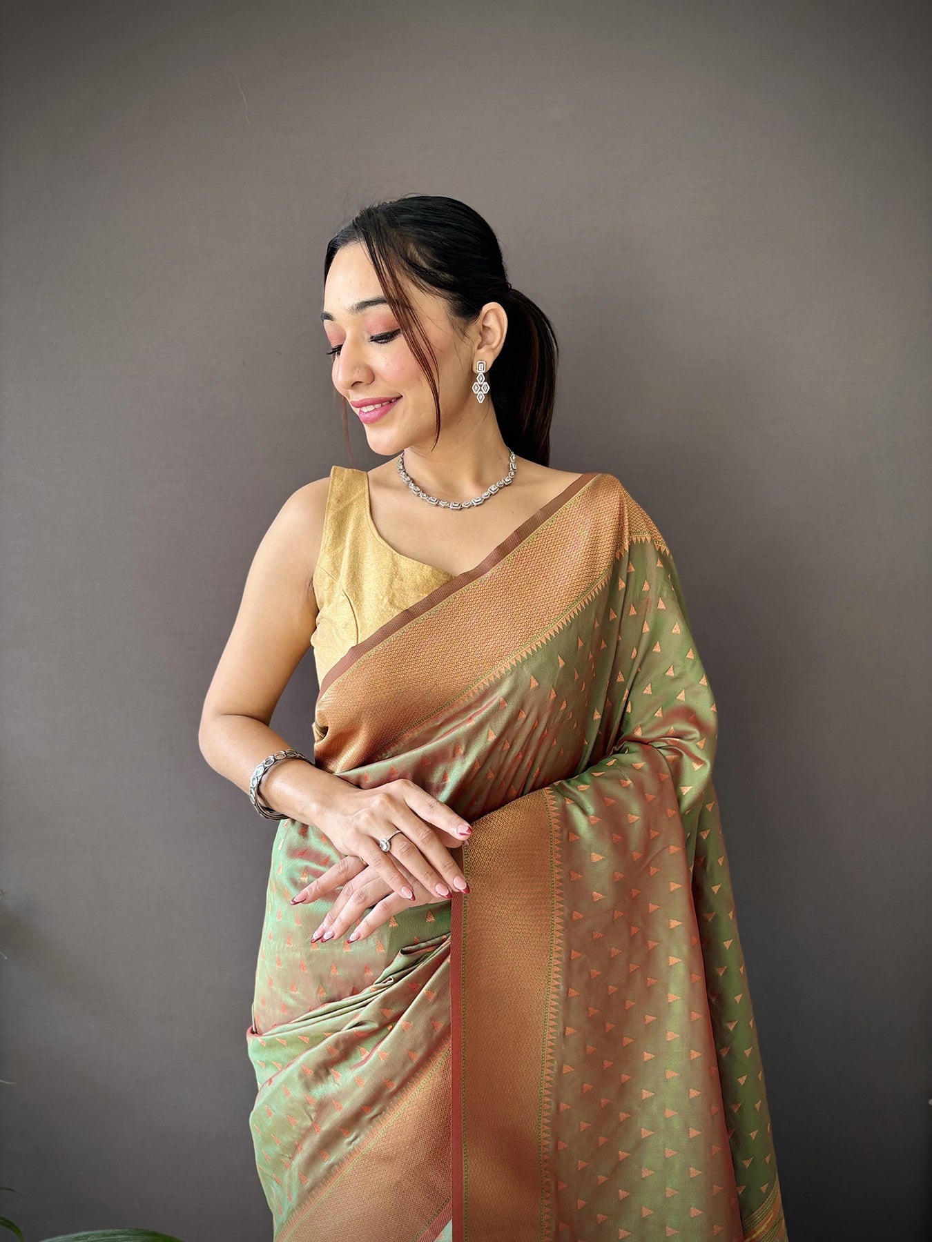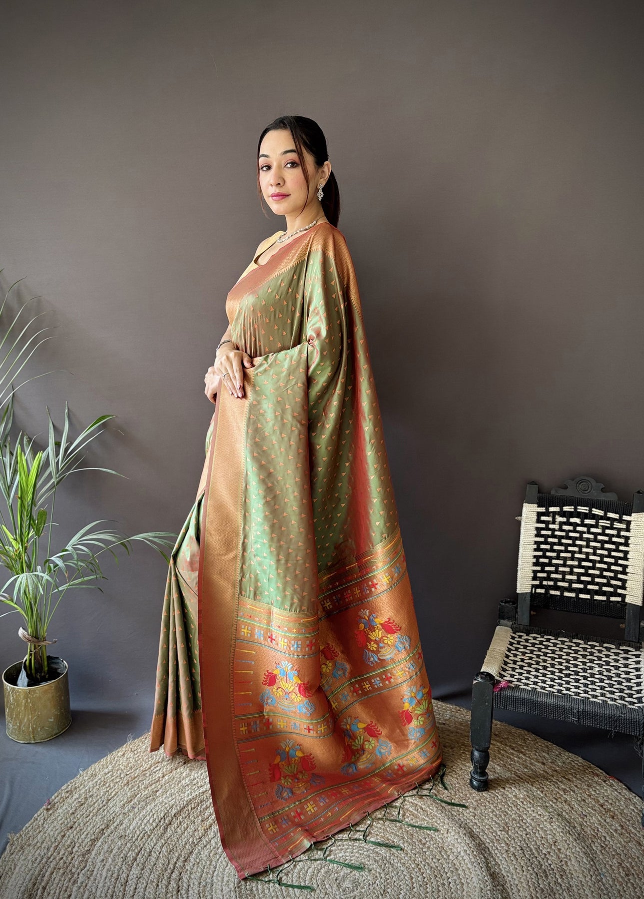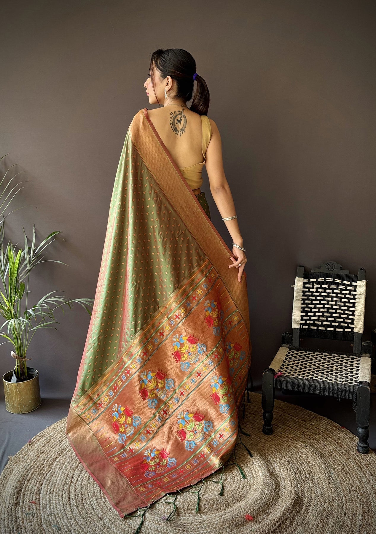 Olive Green Soft Lichi Silk Jacquard Butti Zari Weaving Paithani Saree
