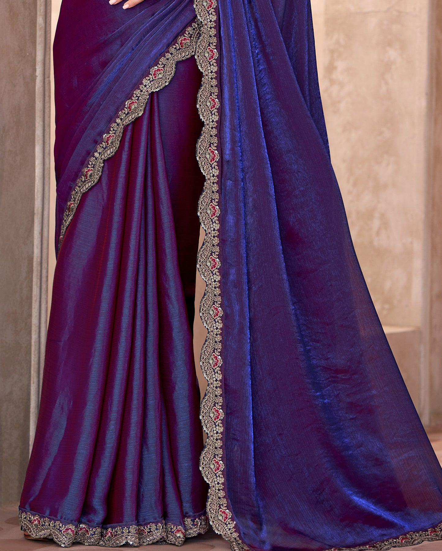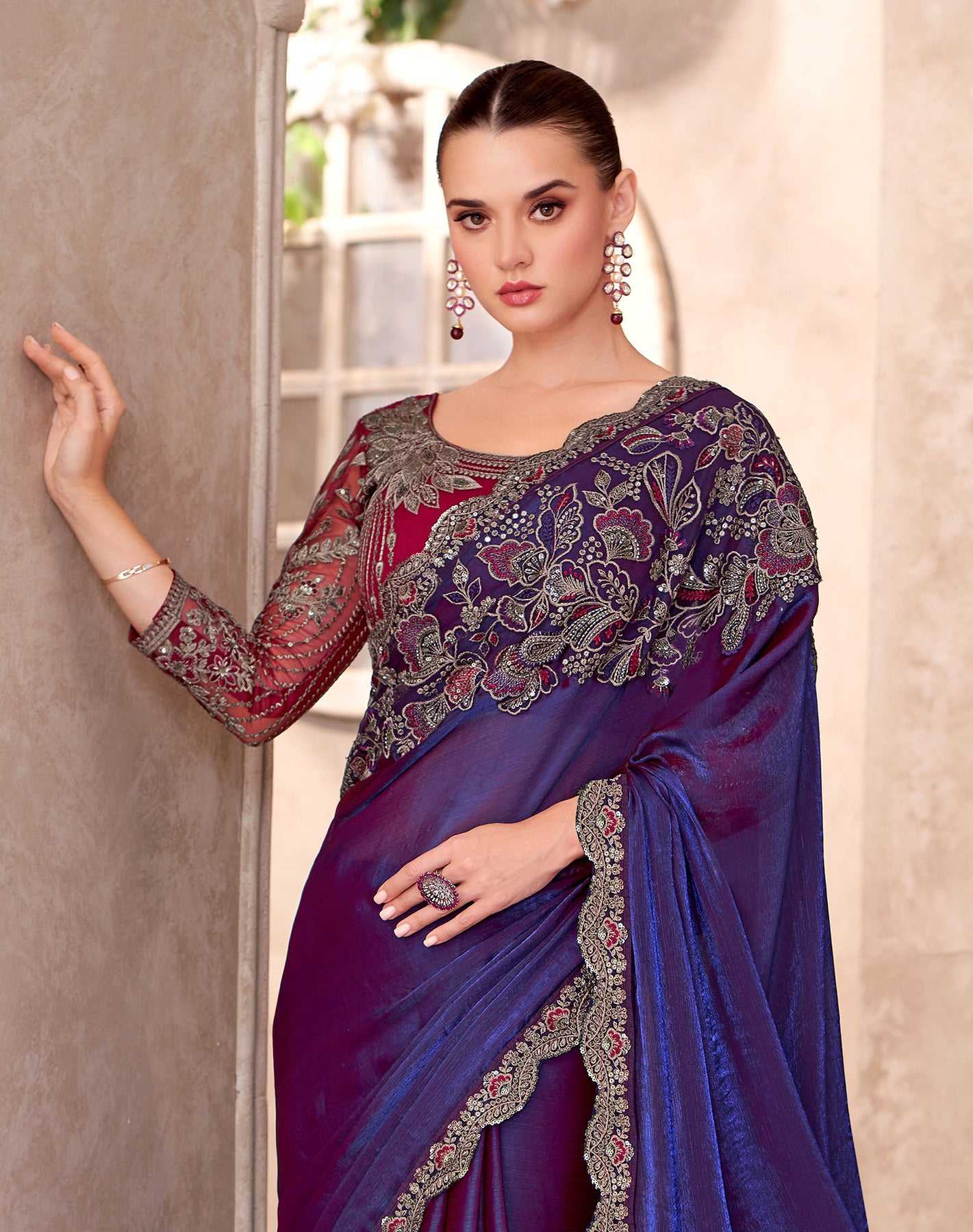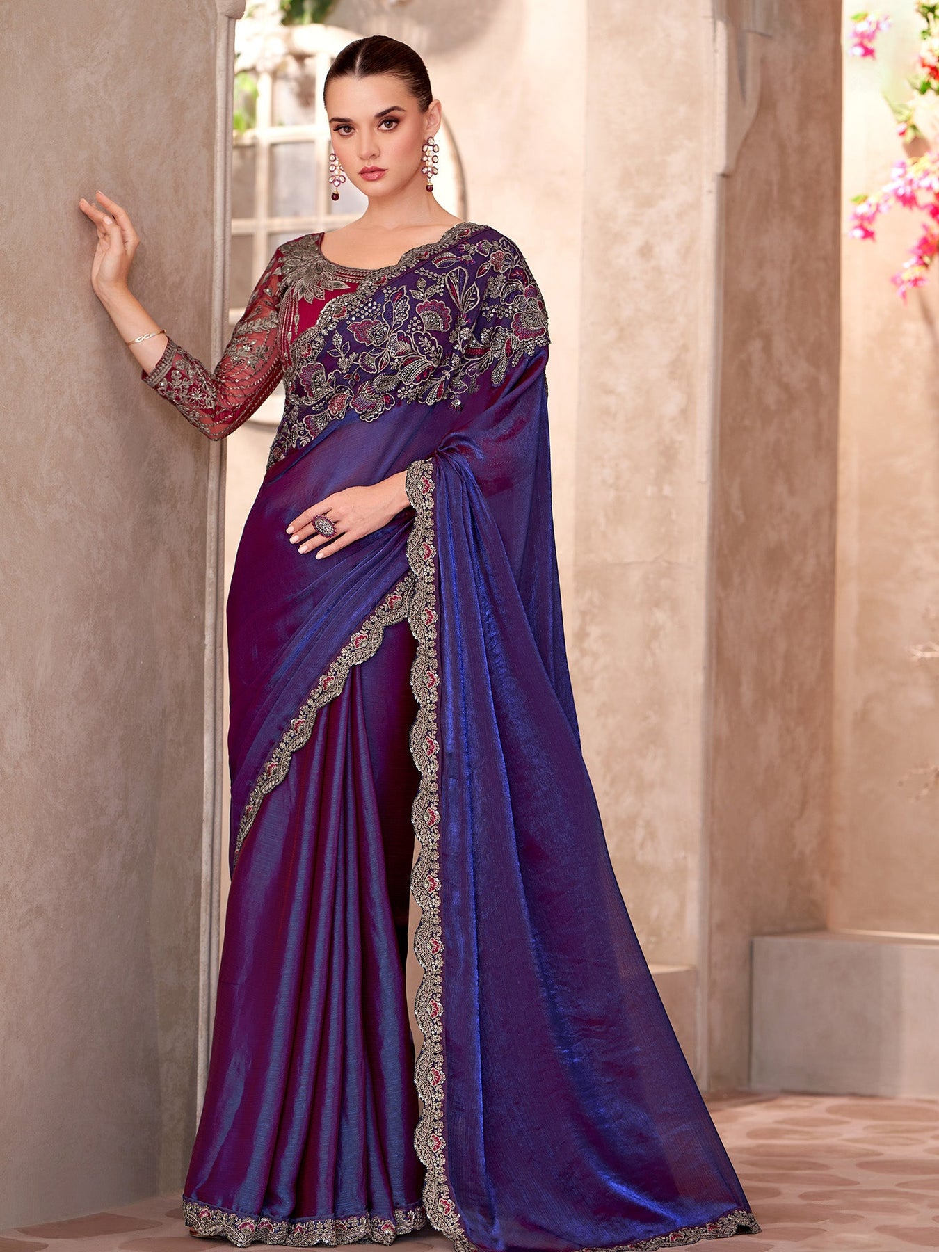 The heavy embroidery and sequin work add a dazzling effect, making this saree perfect for evening events. Its rich design and navy blue color create an air of sophistication for any formal gathering.
